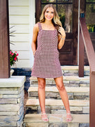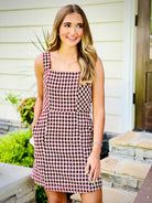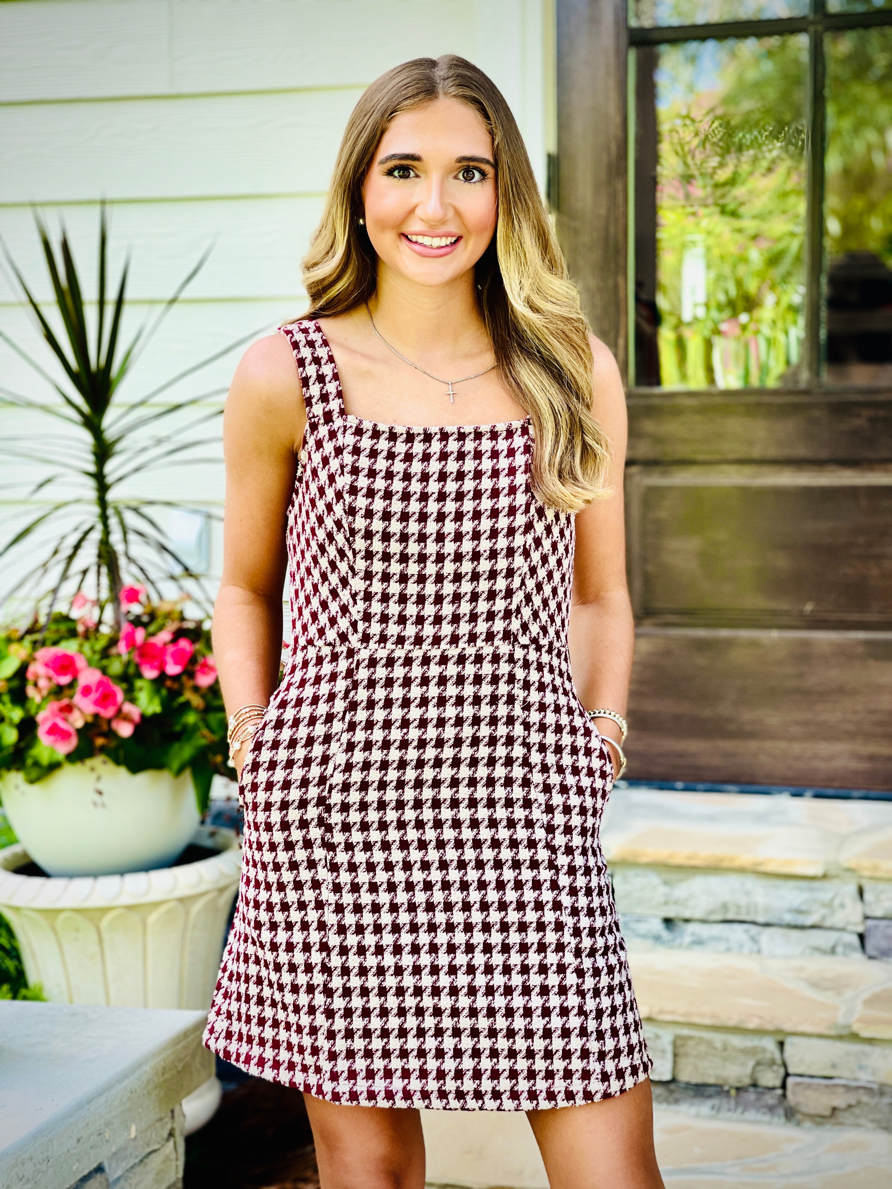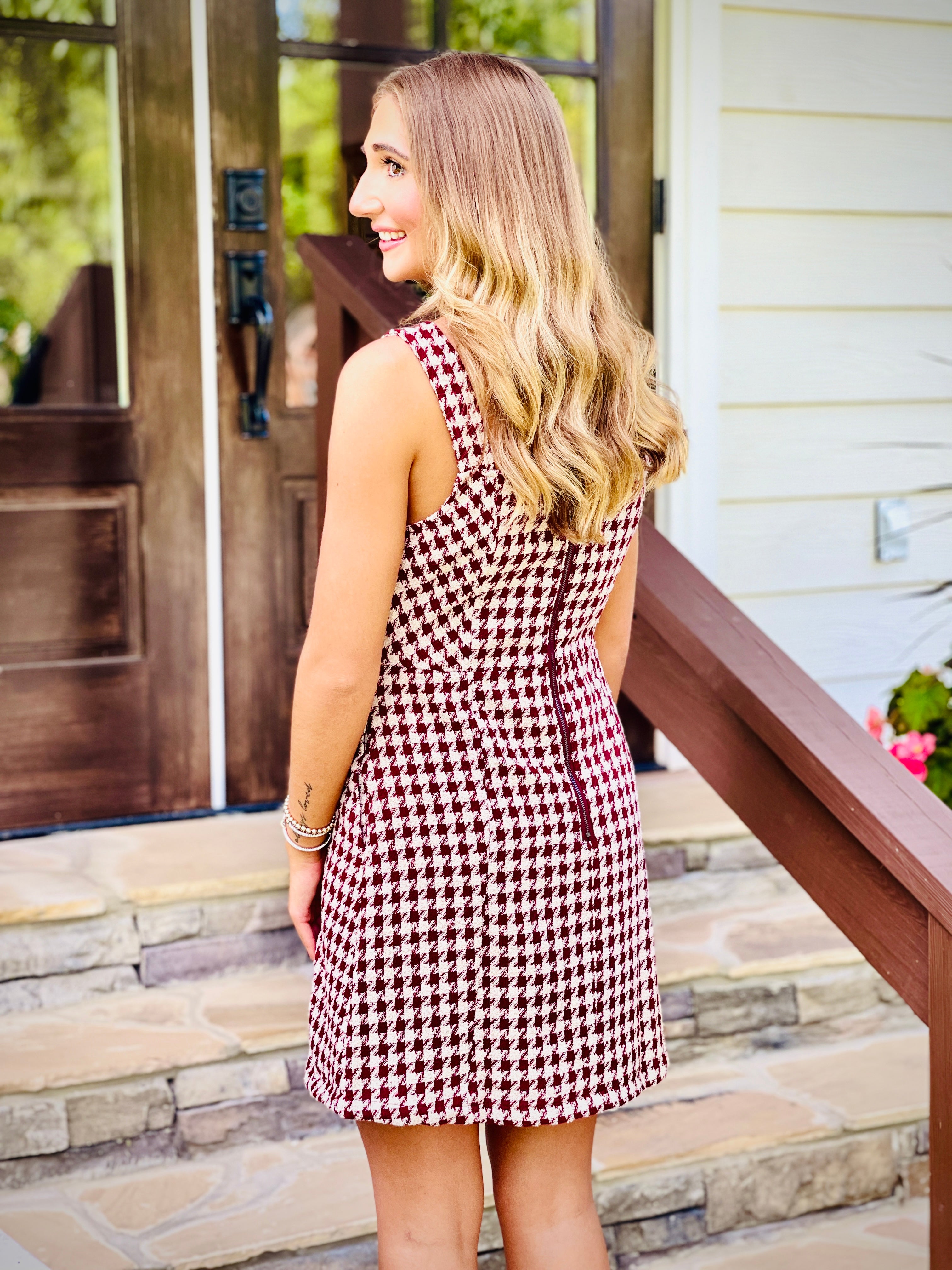 Expertly crafted with a light lurex thread boucle fabric, this mini dress boasts a timeless houndstooth pattern. Its back zipper makes for effortless wear, perfect for any occasion. Elevate your wardrobe with this stylish and versatile piece.