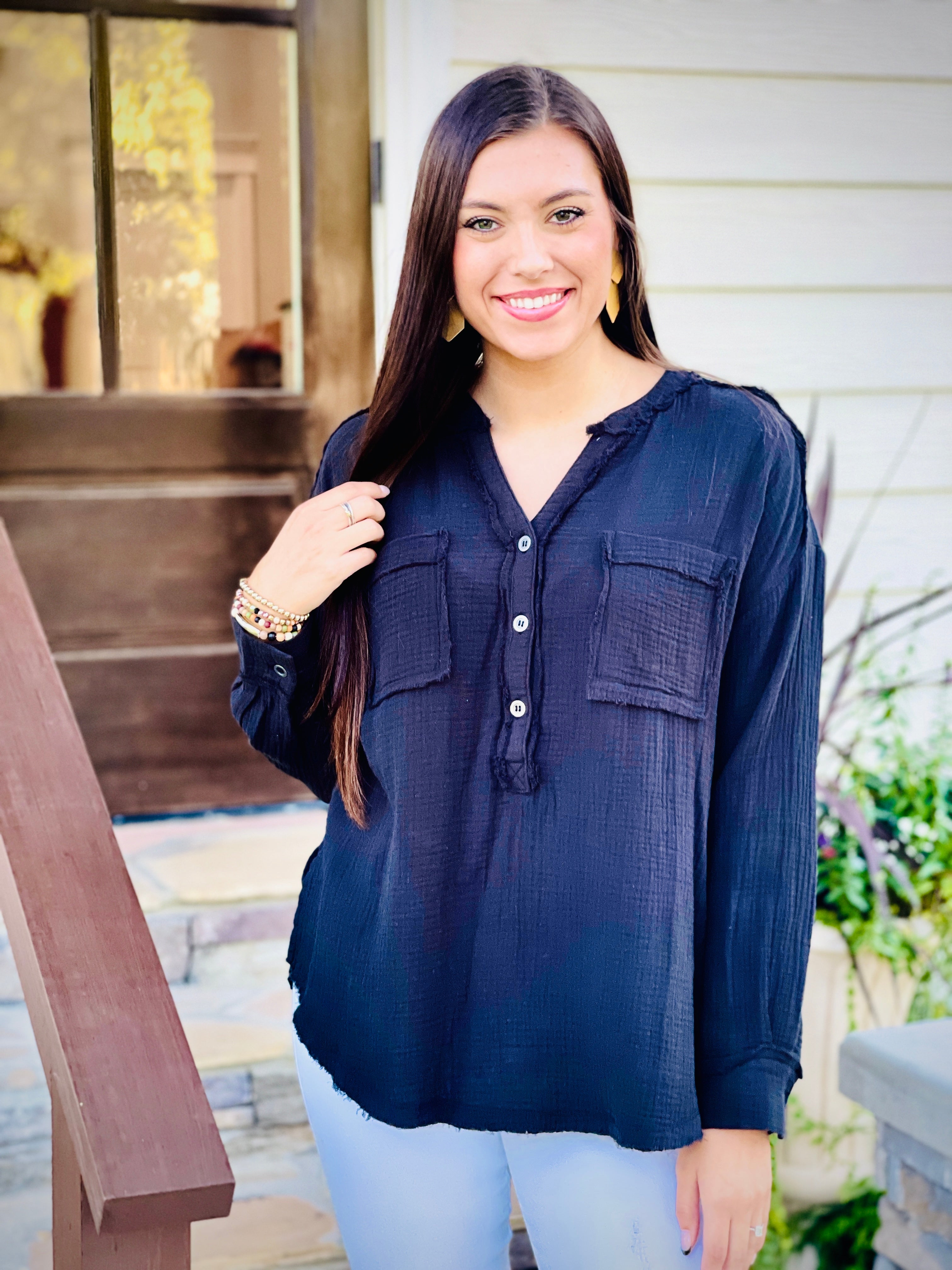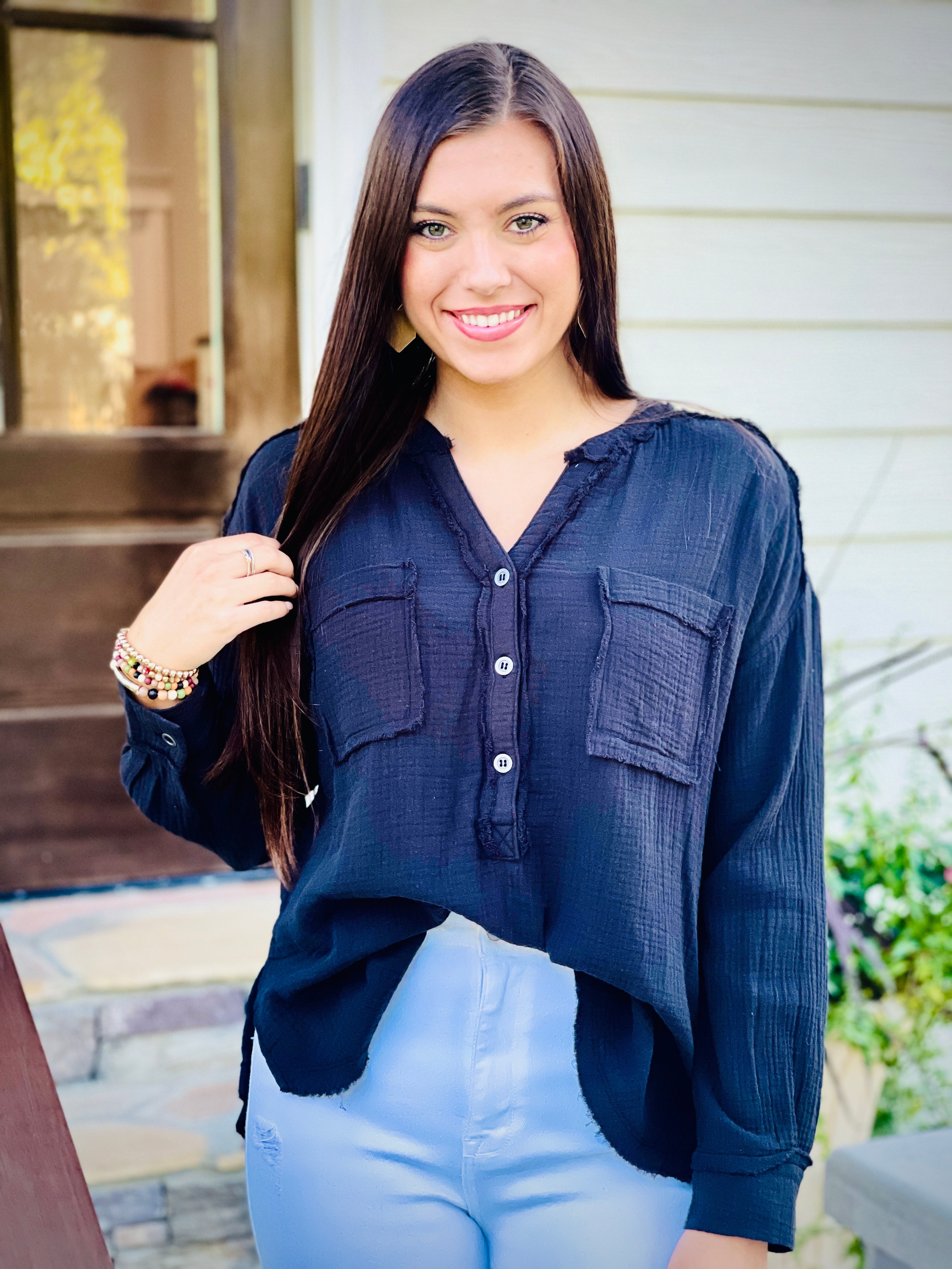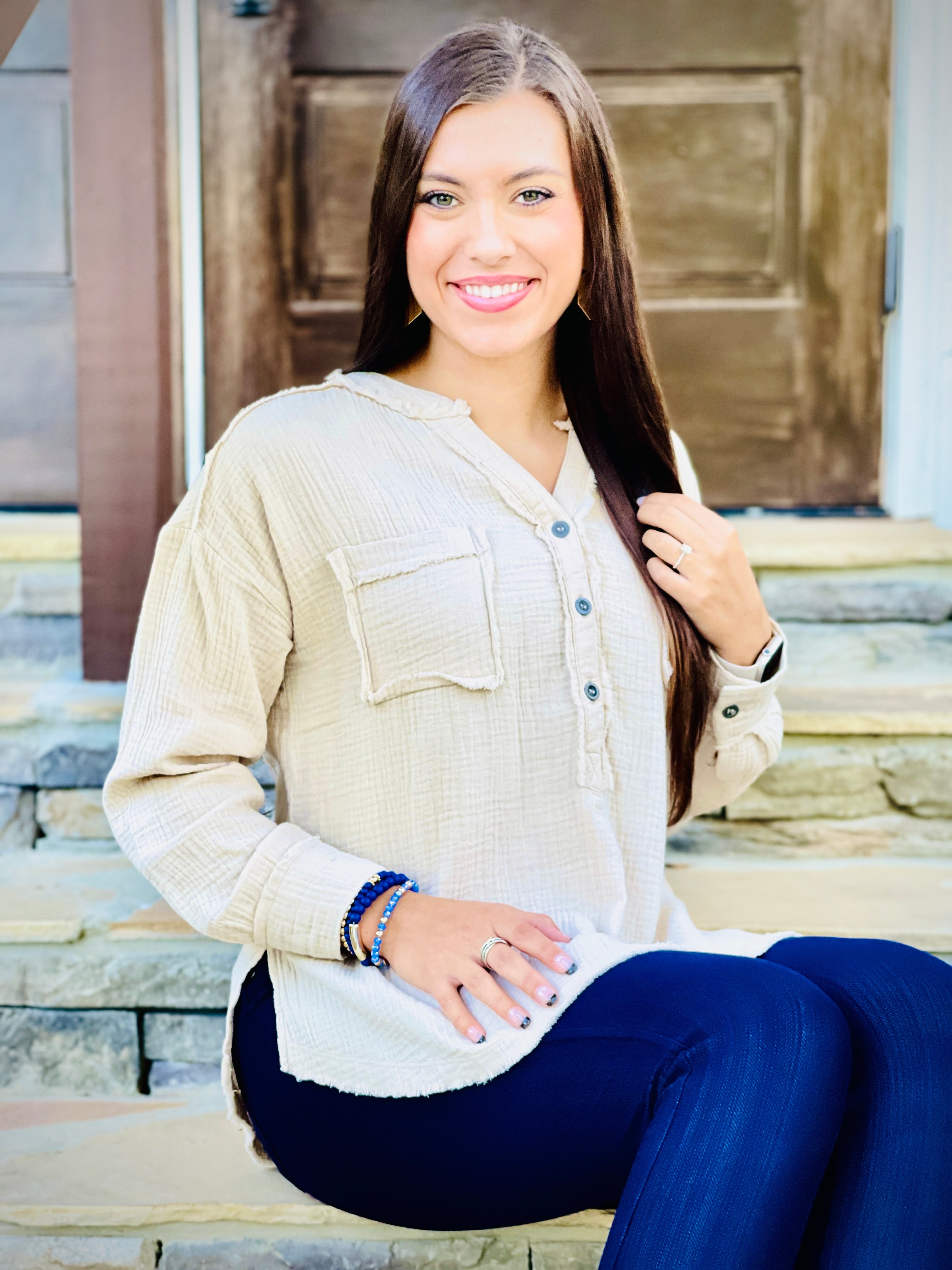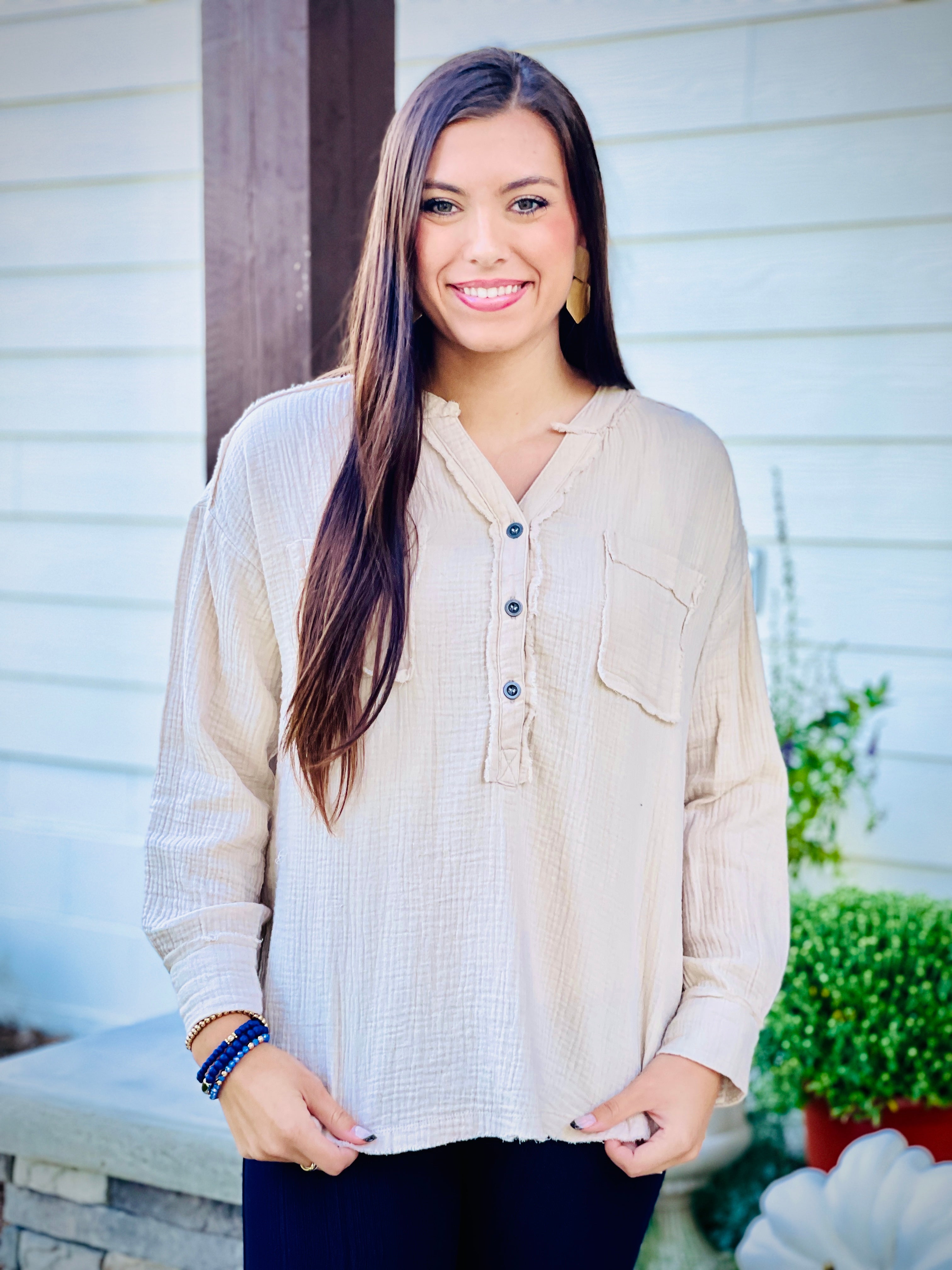 This DOUBLE GAUZE 3/4 BUTTON HENLEY-NECK SHIRT is designed with a raw edge hem and round hem for a fashionable, comfortable look. It features a 3/4 button henley-neck and side slit for breathability and movement. Perfect for a laid-back weekend look.