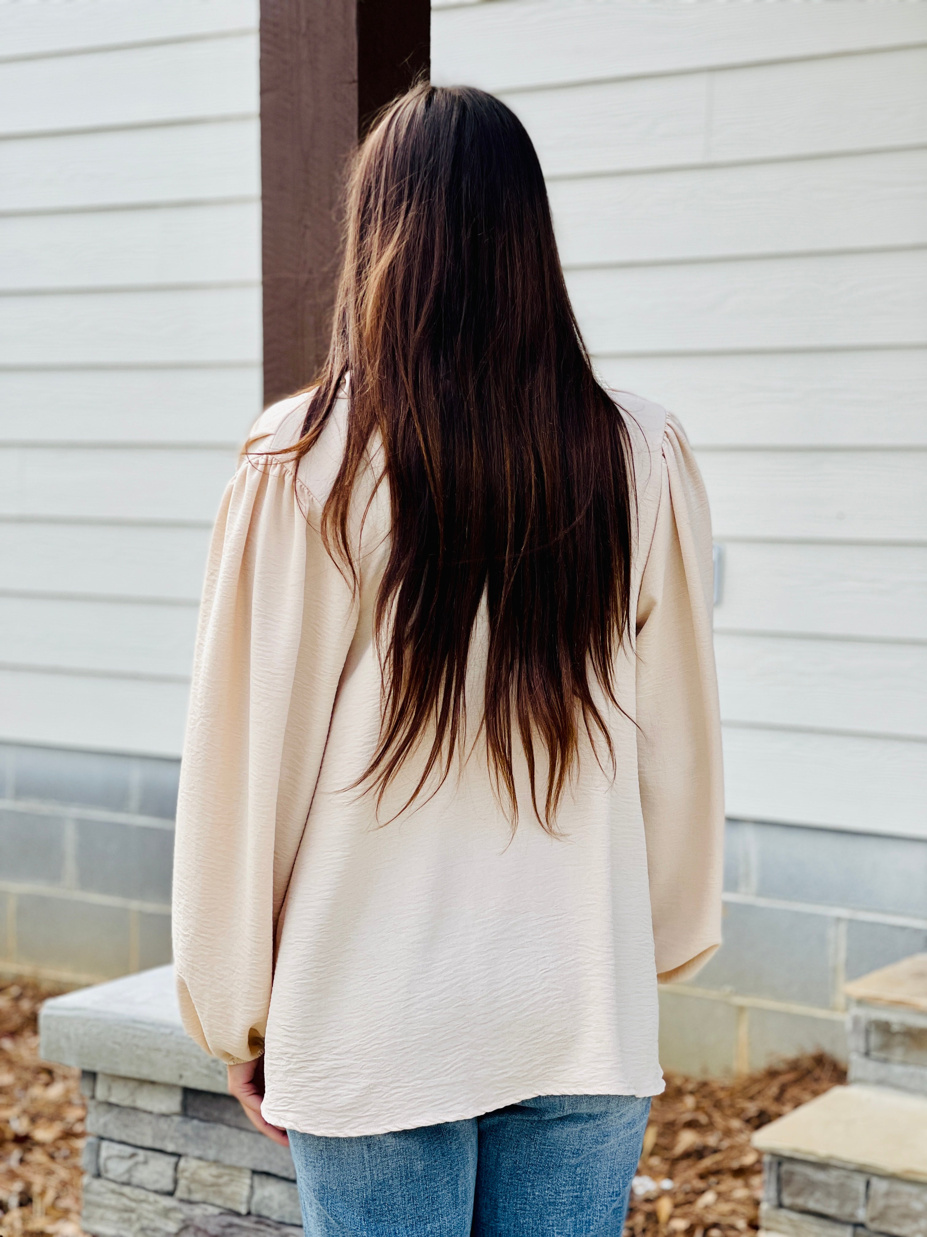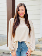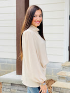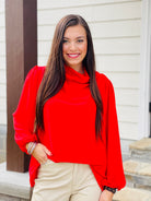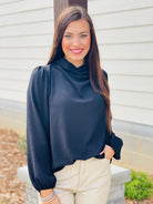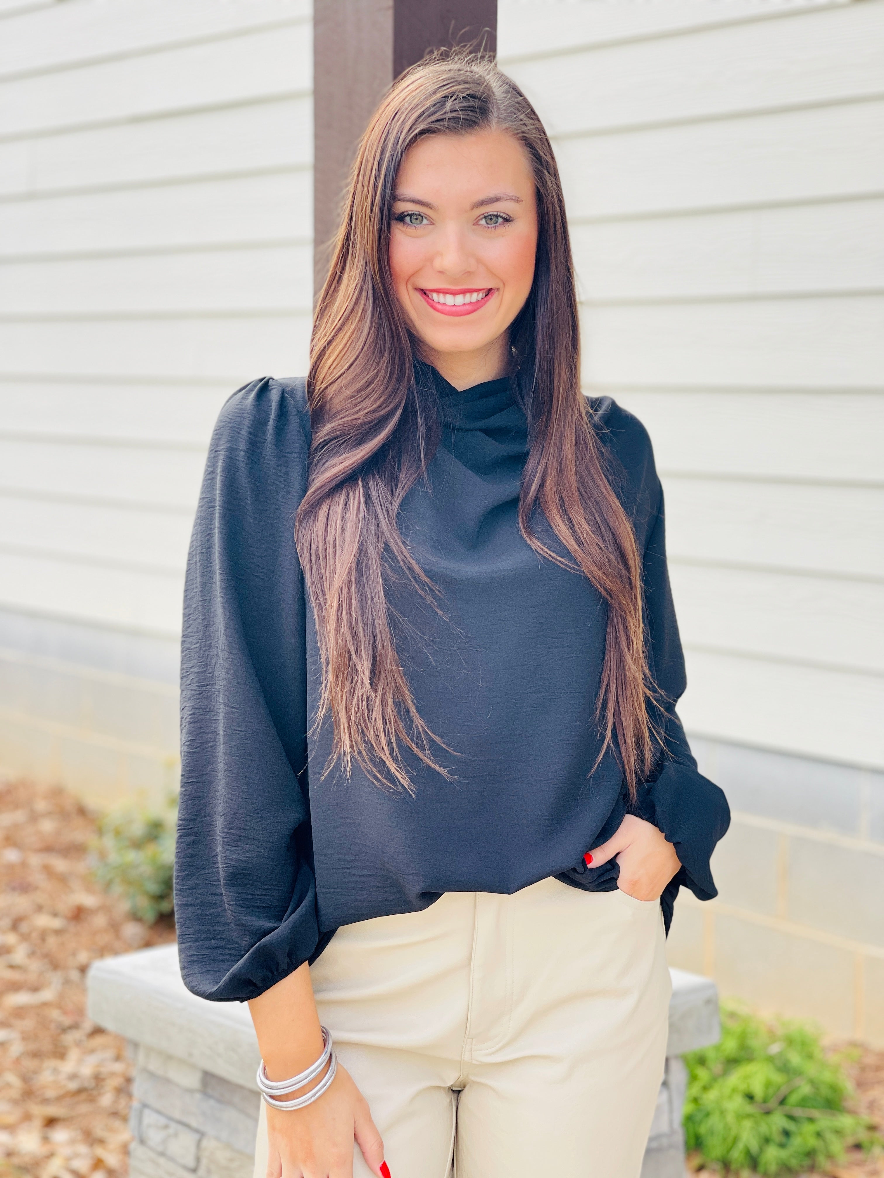This elegant top will make you feel like a million bucks! The elegant cowled neck and balloon sleeves says enough about this classy top!