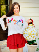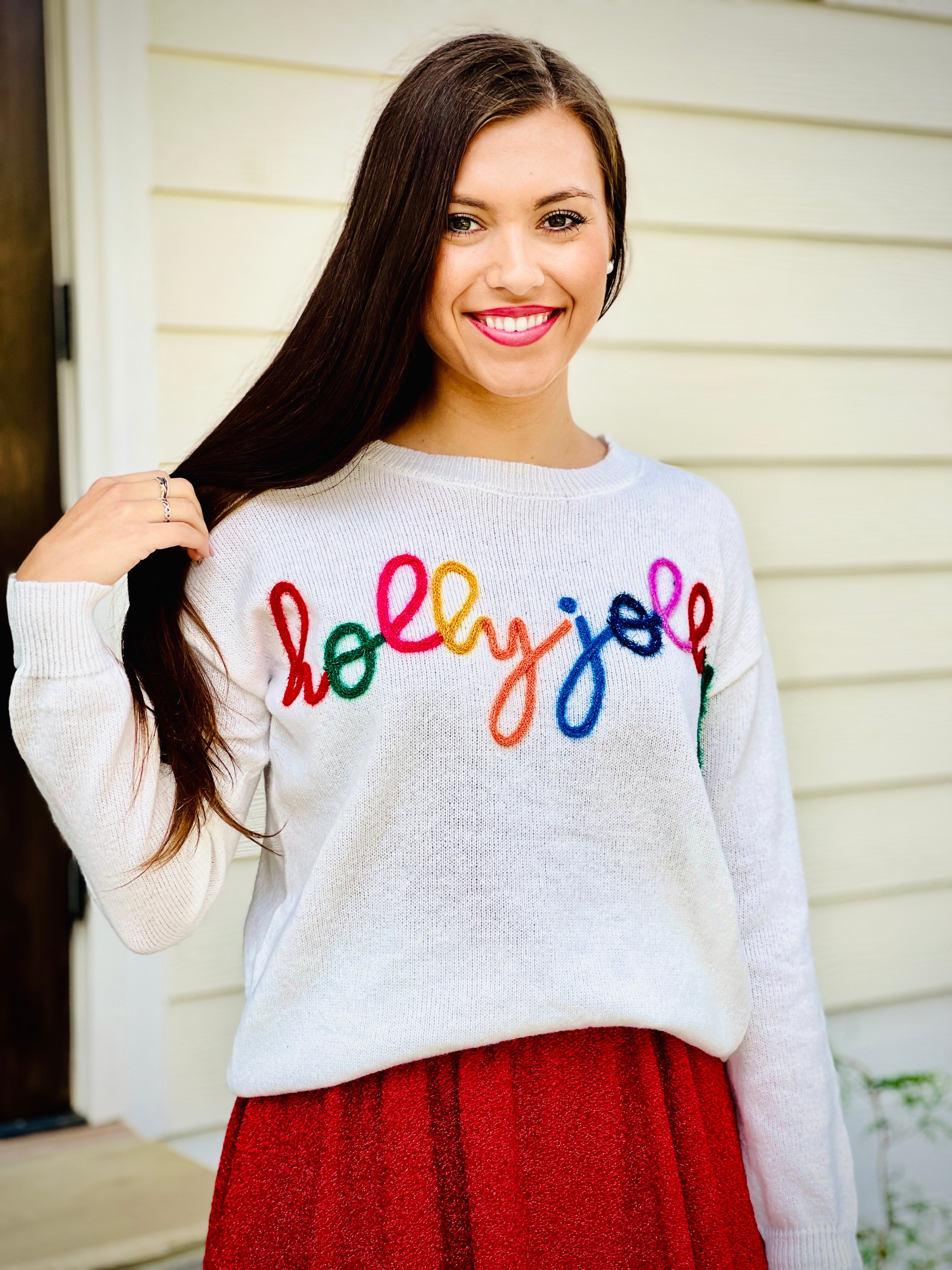 Bring festive vibes to your wardrobe with this holiday-themed top. Featuring bright details on a solid background, it offers an eye-catching look. Crafted from soft materials, it ensures comfort all day long. The round neck, drop shoulder, and relaxed silhouette enhance its classic yet modern style. Embrace the holiday spirit with the "holly jolly" letters embroidered with tinsel for a cheerful touch.
