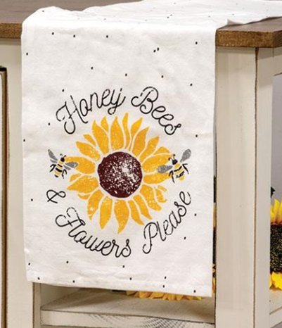 Honey Bees & Flowers Please Dish Towel is a white cotton dish towel with black polka dots and a sunflower and bee design. It reads, "Honey Bees & Flowers Please" in black text and it looks great on hooks, handles, or tucked into a basket. It is machine-washable and measures 28" high by 28" wide.