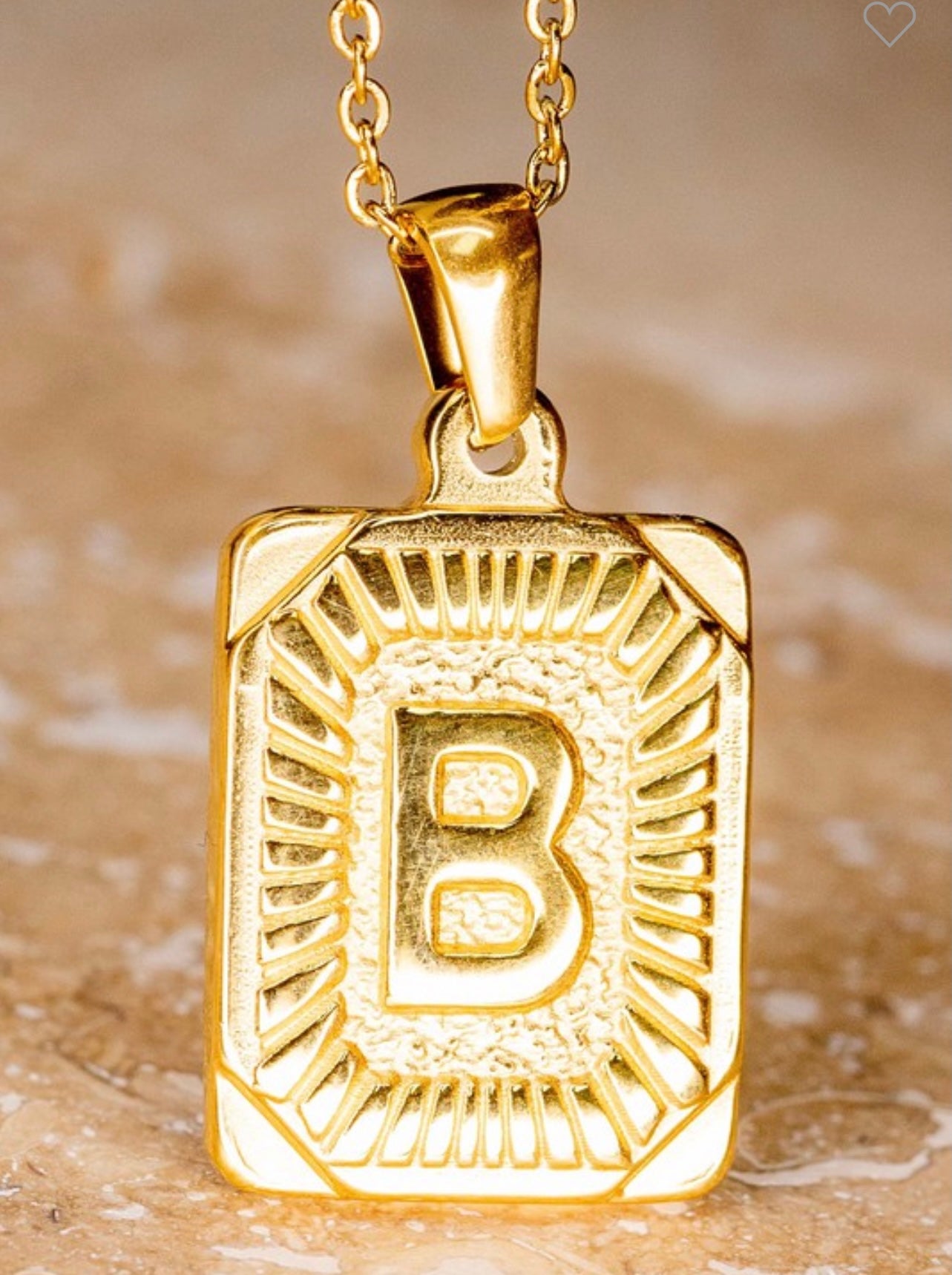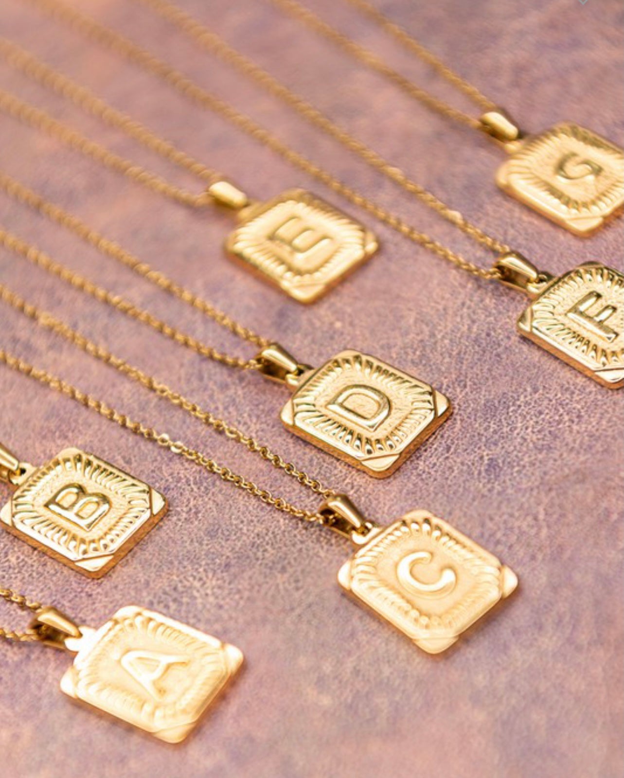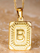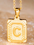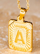 Initial Necklace - Rectangle pendant measures 5/8" wide x 3/4" tall (or 1.125" tall including bale). Features solid textured back of initial rectangle. Stainless Steel, Gold plated