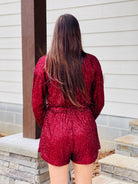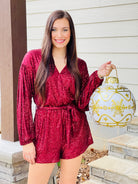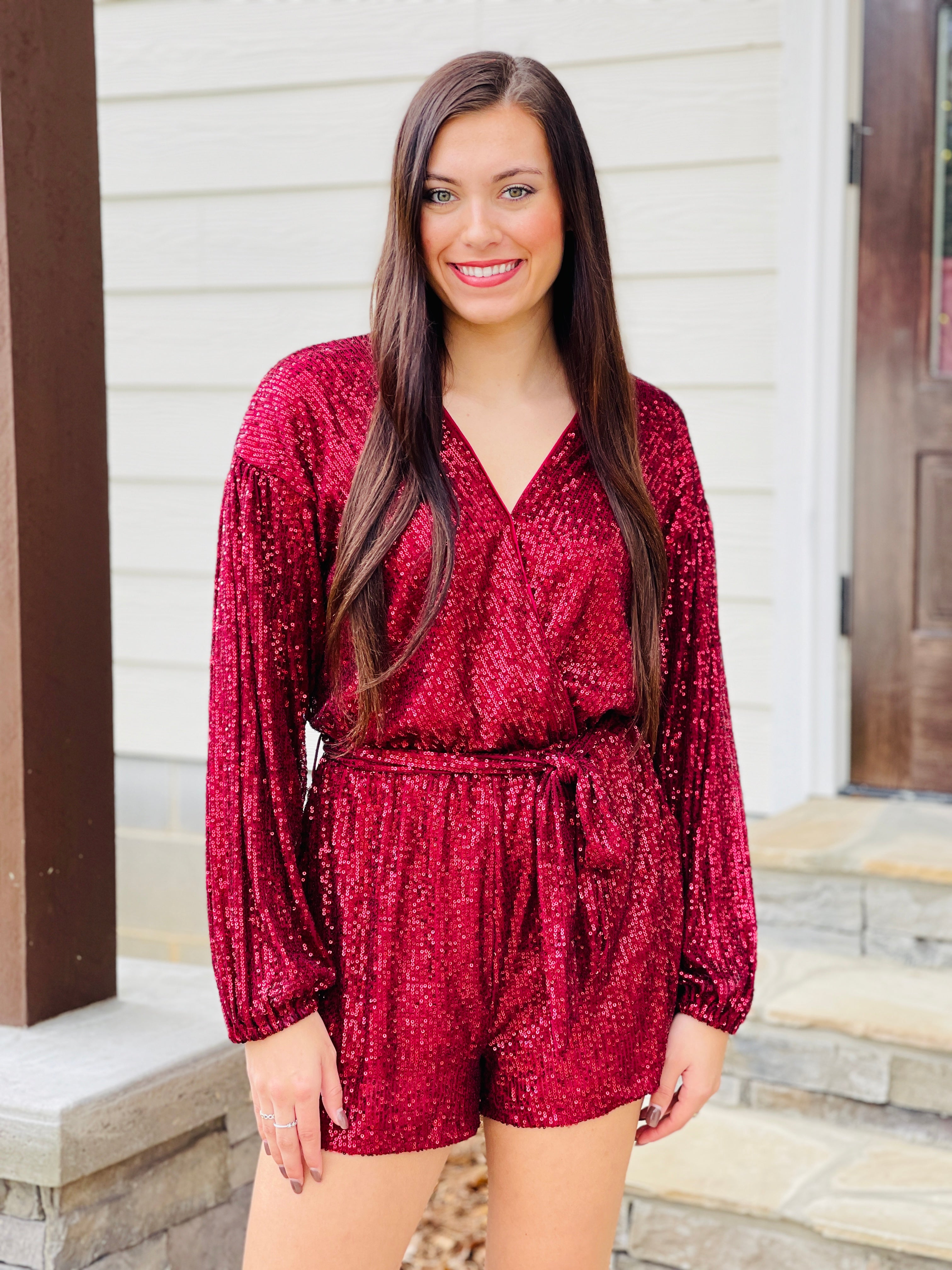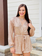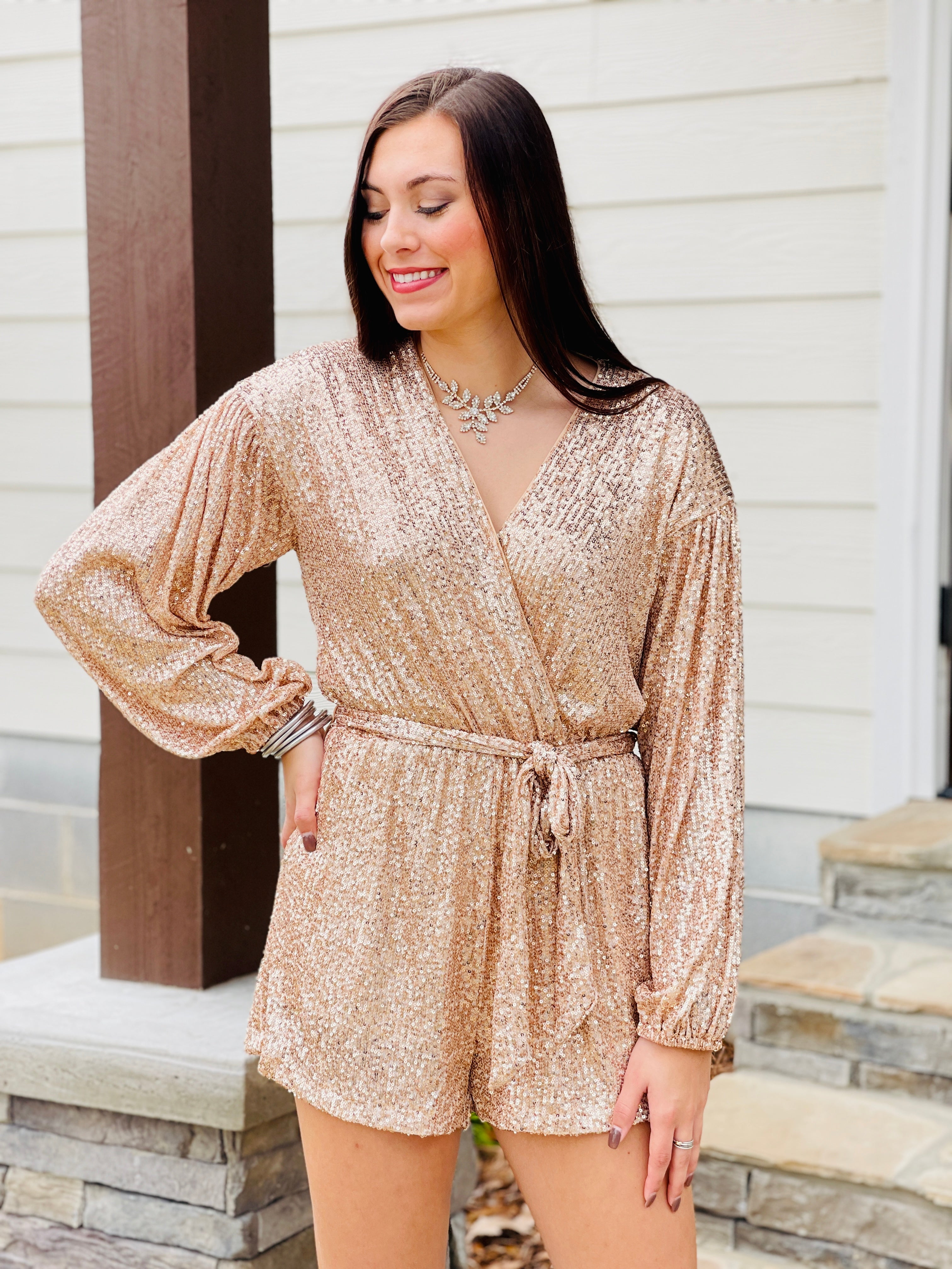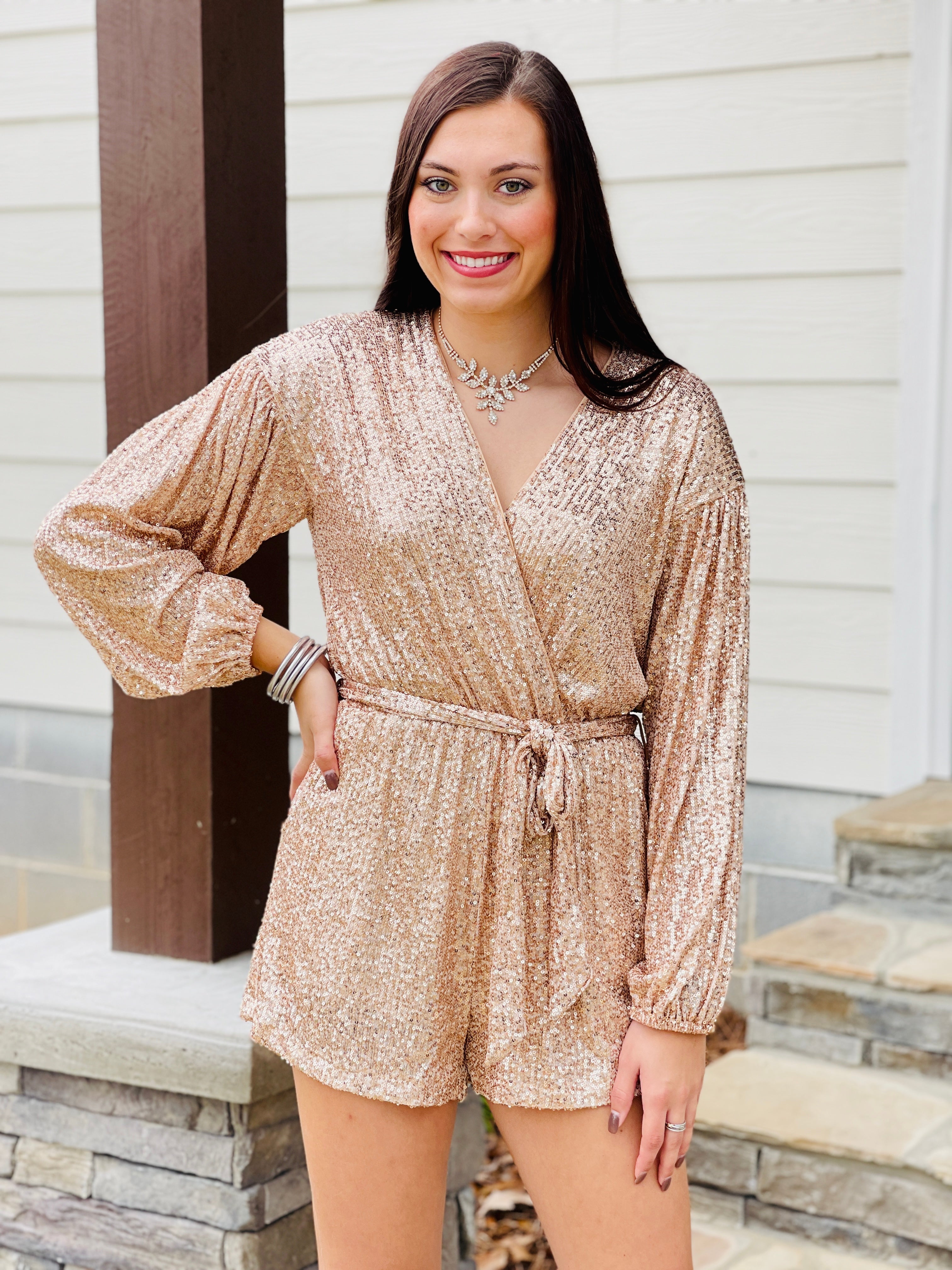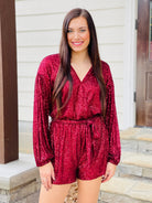 Features::: LONG SLEEVE SURPLICE SEQUIN ROMPER WITH SASH AND POCKETS