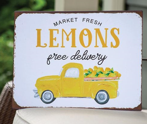 Market Fresh Lemons Truck Distressed Metal Sign is a metal sign with a distressed white finish and rust-like marks. It reads, "Market Fresh Lemons - Free Delivery" in black and yellow text and it is accented by a graphic yellow pickup truck. Sign comes ready to hang by two sawtooth hangers and it measures 10.5" high by 13.75 wide by .1" deep.