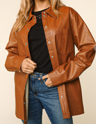This chic faux vegan leather shirt jacket is a must-have. It features long sleeves, snap buttons down the front, and two pockets. Perfect for layering, the oversized fit will keep you comfortable and stylish.