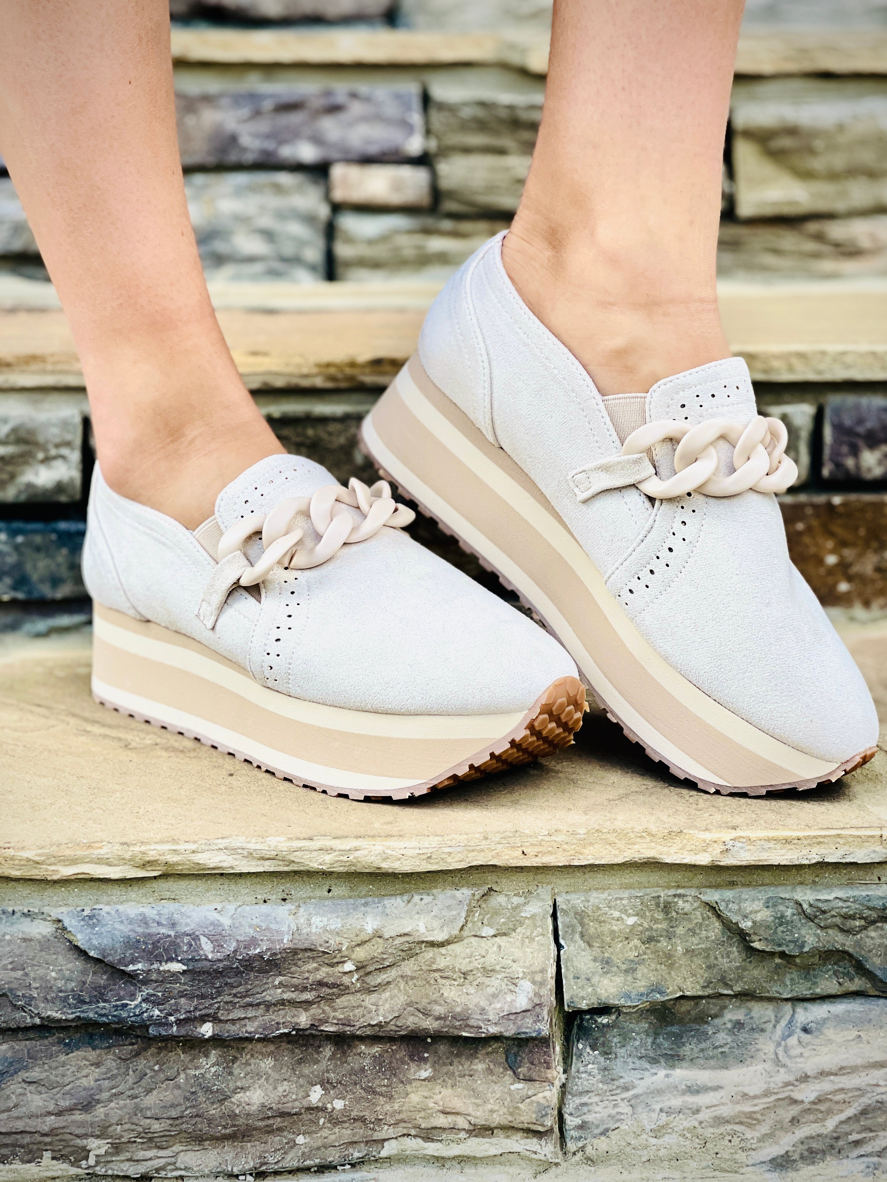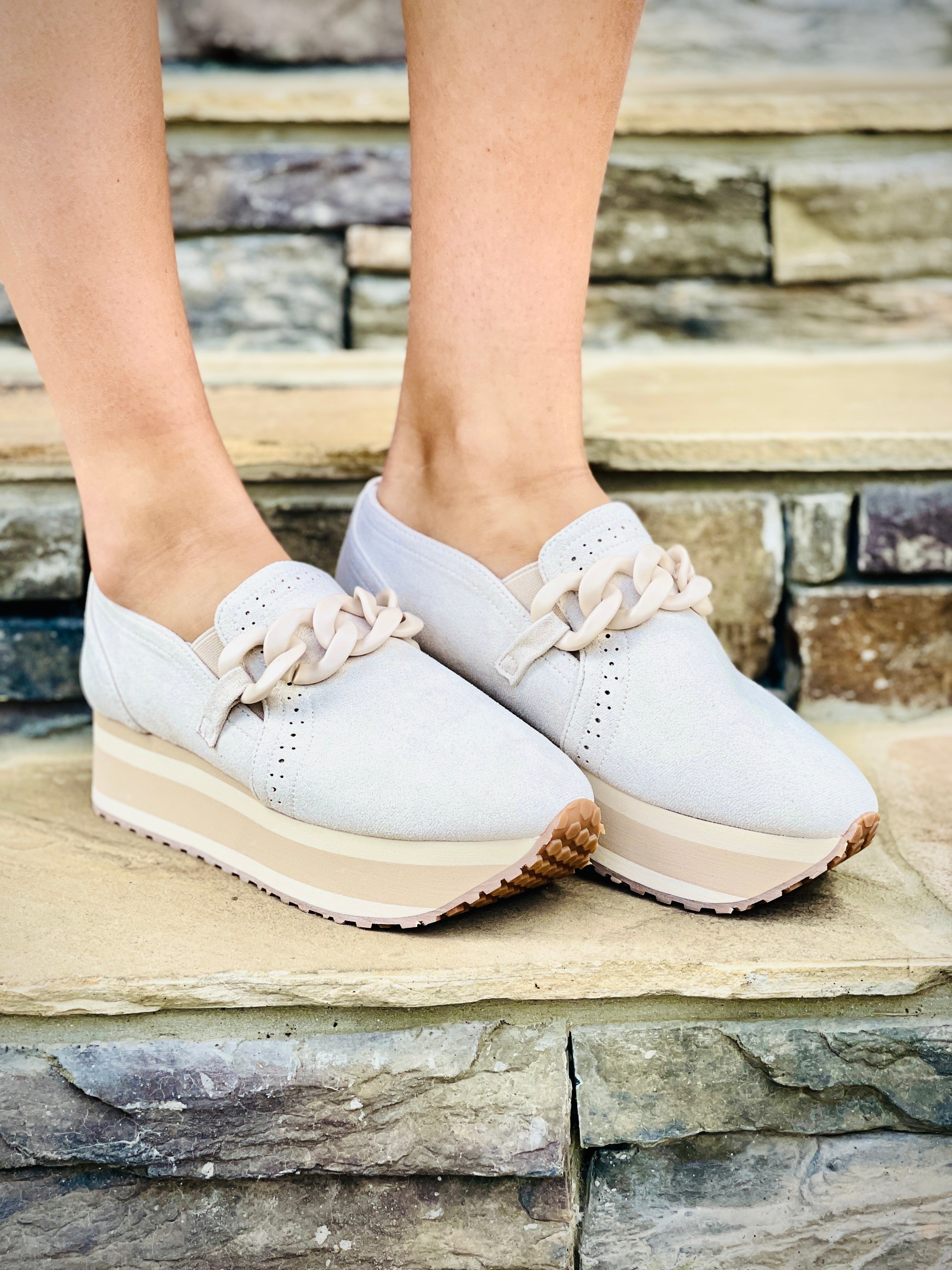 The Paloma Sneakers offer effortless style and practicality. Crafted from suede, the sneakers feature an oversized chain embellishment for subtle statement-making. For the best fit, order half size down due to the running large feature. The shoes have a 2" stacked platform for added comfort.