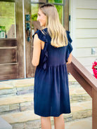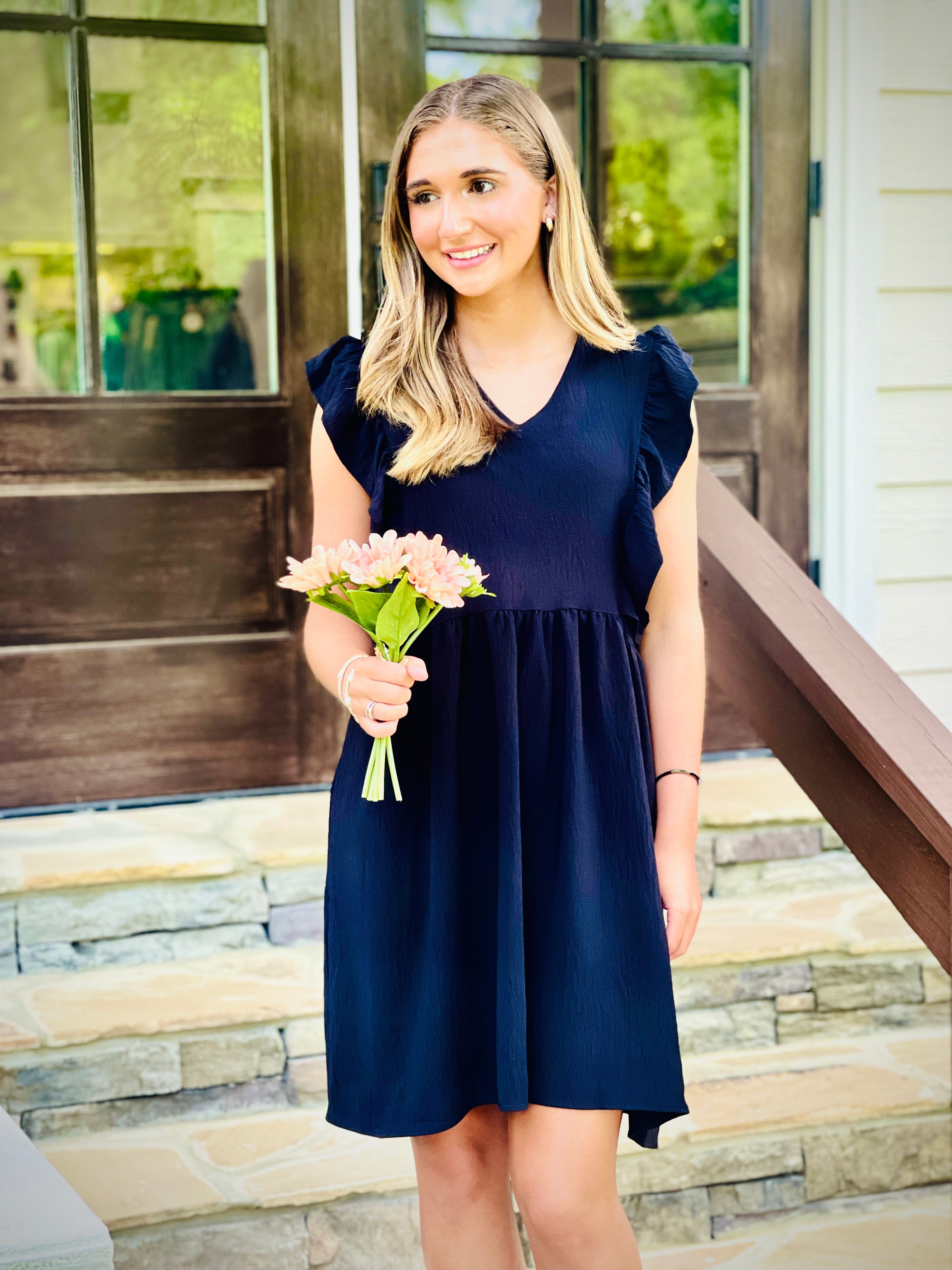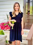 Introducing our solid dress - perfect for any occasion! This V-neck dress features a flattering baby doll fit, with ruffle details along the shoulders and shirring around the waistline for a feminine touch. Made with a solid air flow fabric and slight stretch, this dress will keep you cool and comfortable.