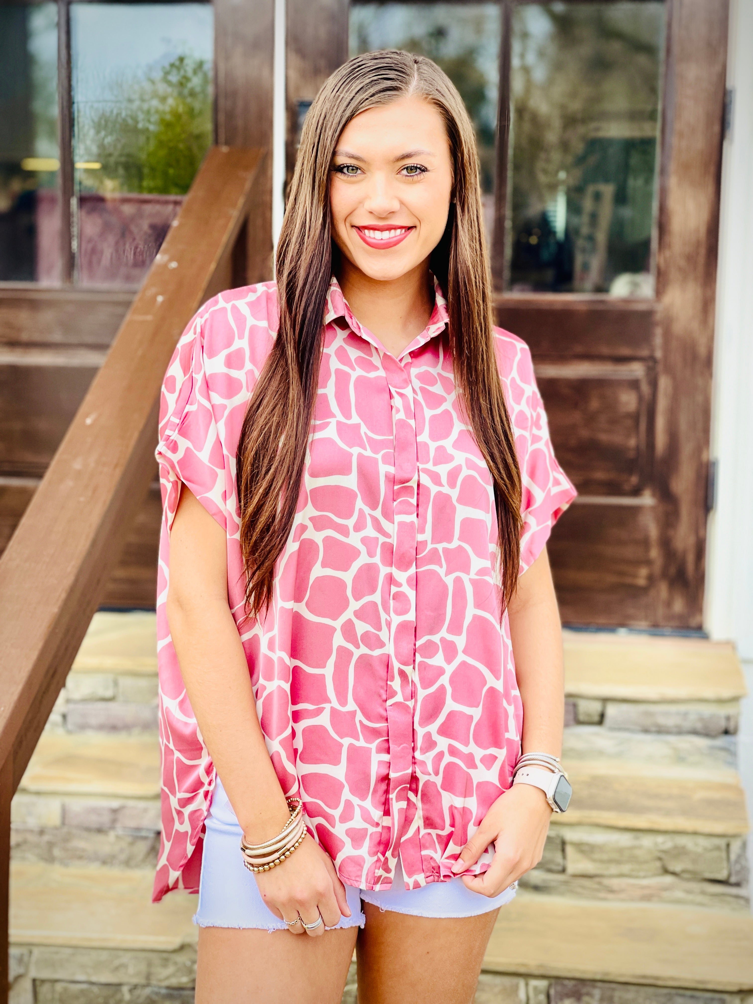Introducing our perfect spring top - the Collared Button Down Print Short Sleeve Top. Featuring a stylish print and side slits, this top is perfect for any occasion. Its high-low hem adds a modern touch, making it a must-have for any fashion-forward wardrobe. Stay on trend and elevate your style with our top.