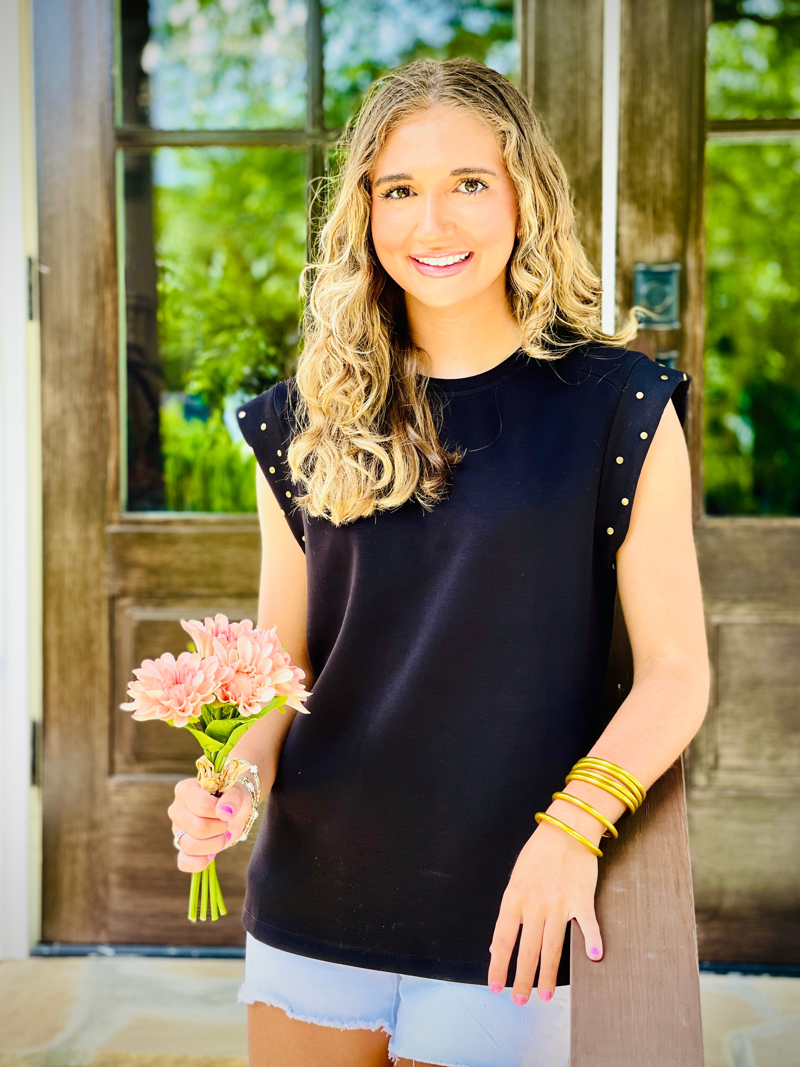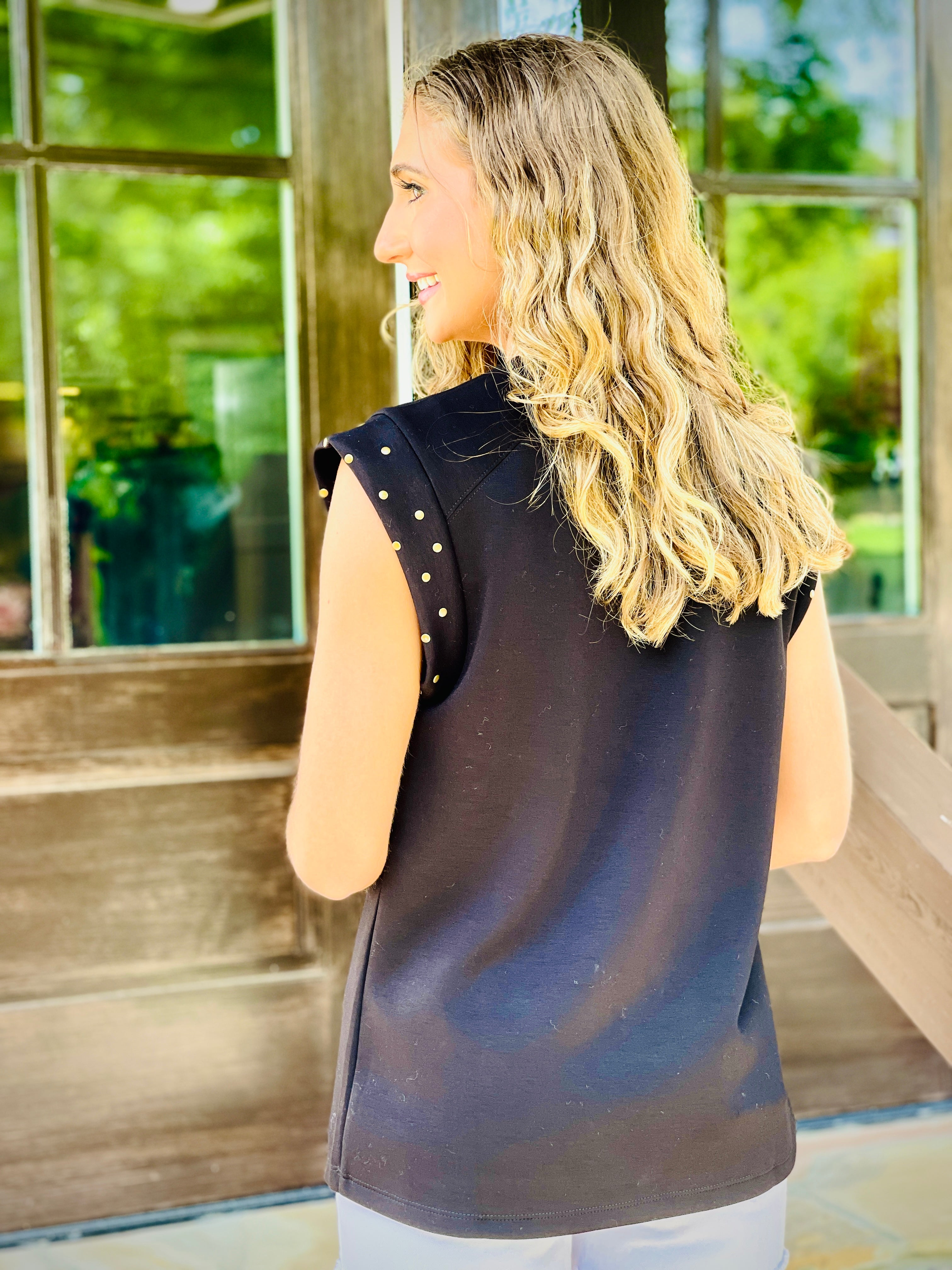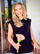 Introducing the perfect statement piece for your wardrobe: our short sleeve top with edgy metal stud accents. Stand out from the crowd and elevate any outfit with this versatile, easy-to-wear tee. Make a statement with style and confidence.