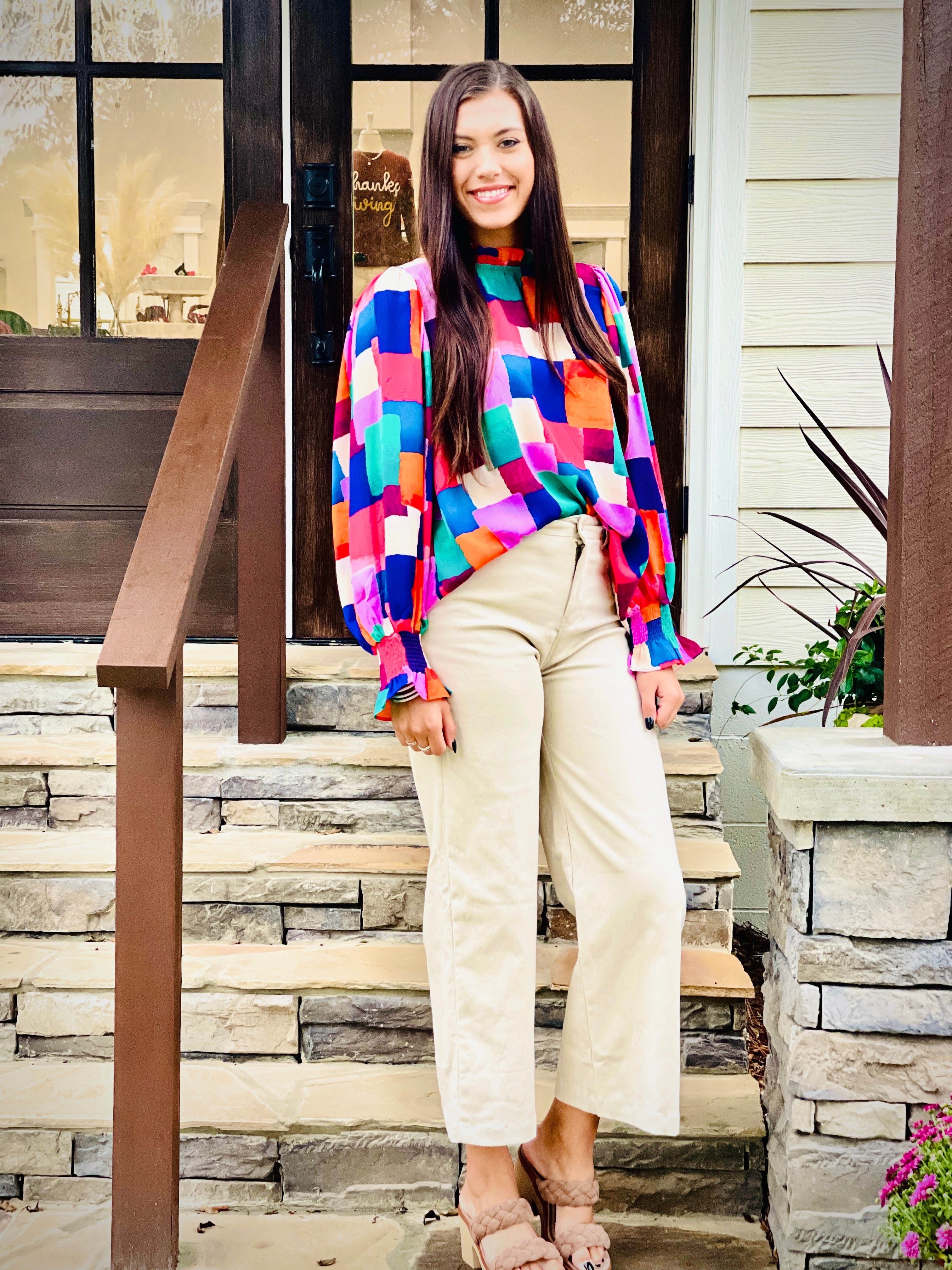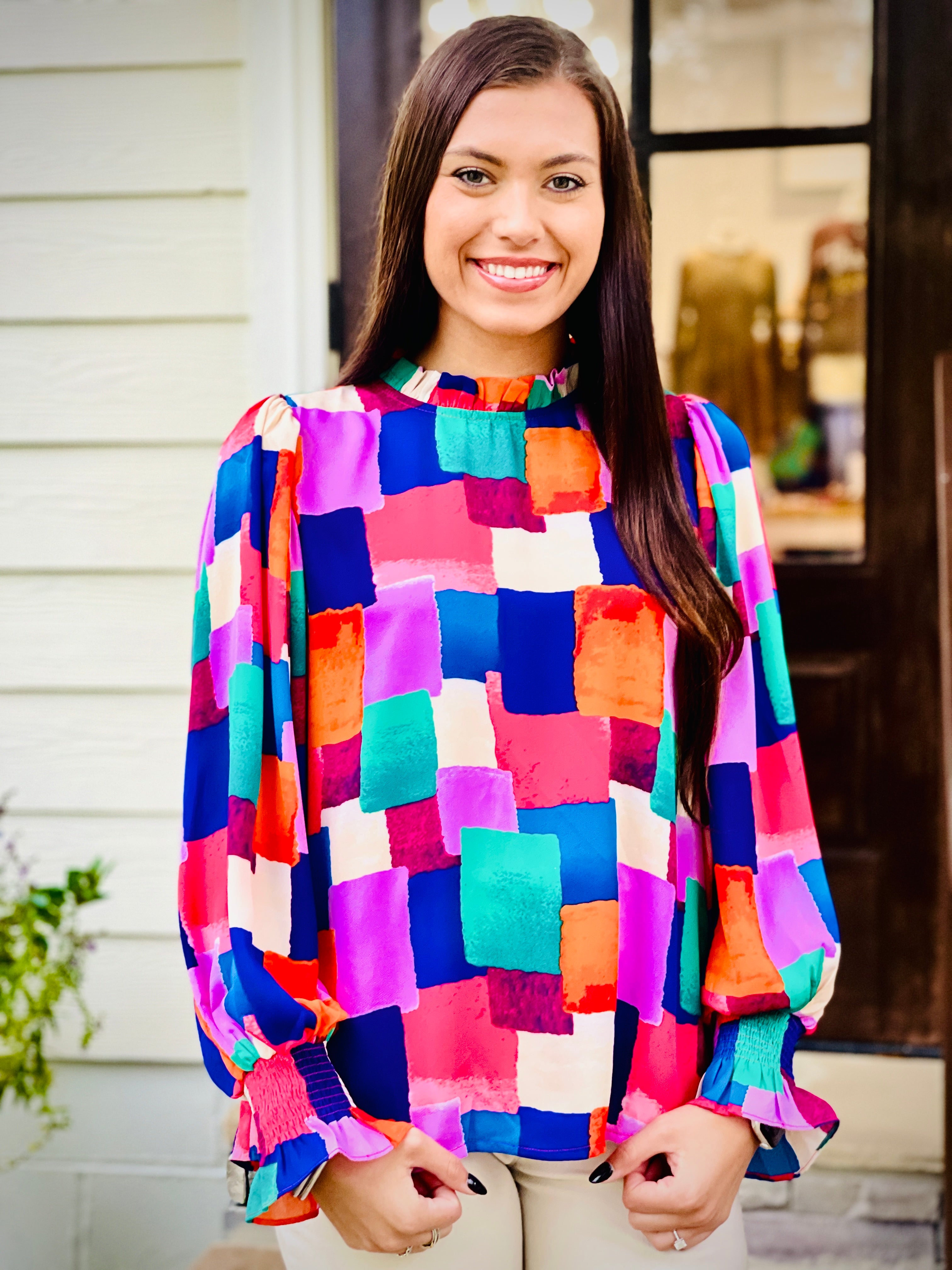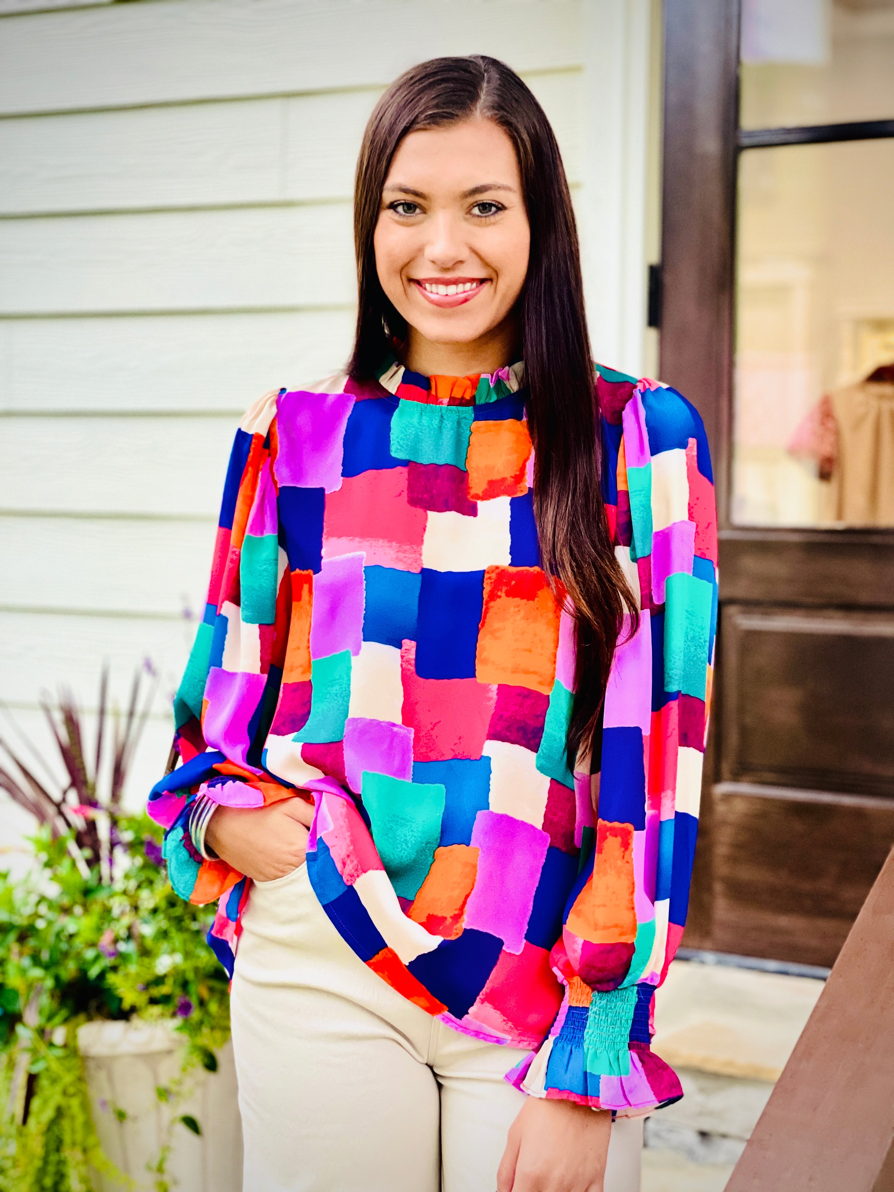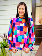 This multicolor print top features a frilled neckline, back wrinkle detail, and long peasant sleeves with smocked cuffs, making it both comfortable and stylish. Enjoy the soft feel of the fabric and the flexibility of the fit for any occasion.