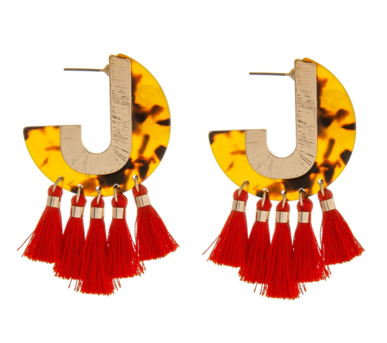 Resin tortoise shell J hoop tassel earrings.