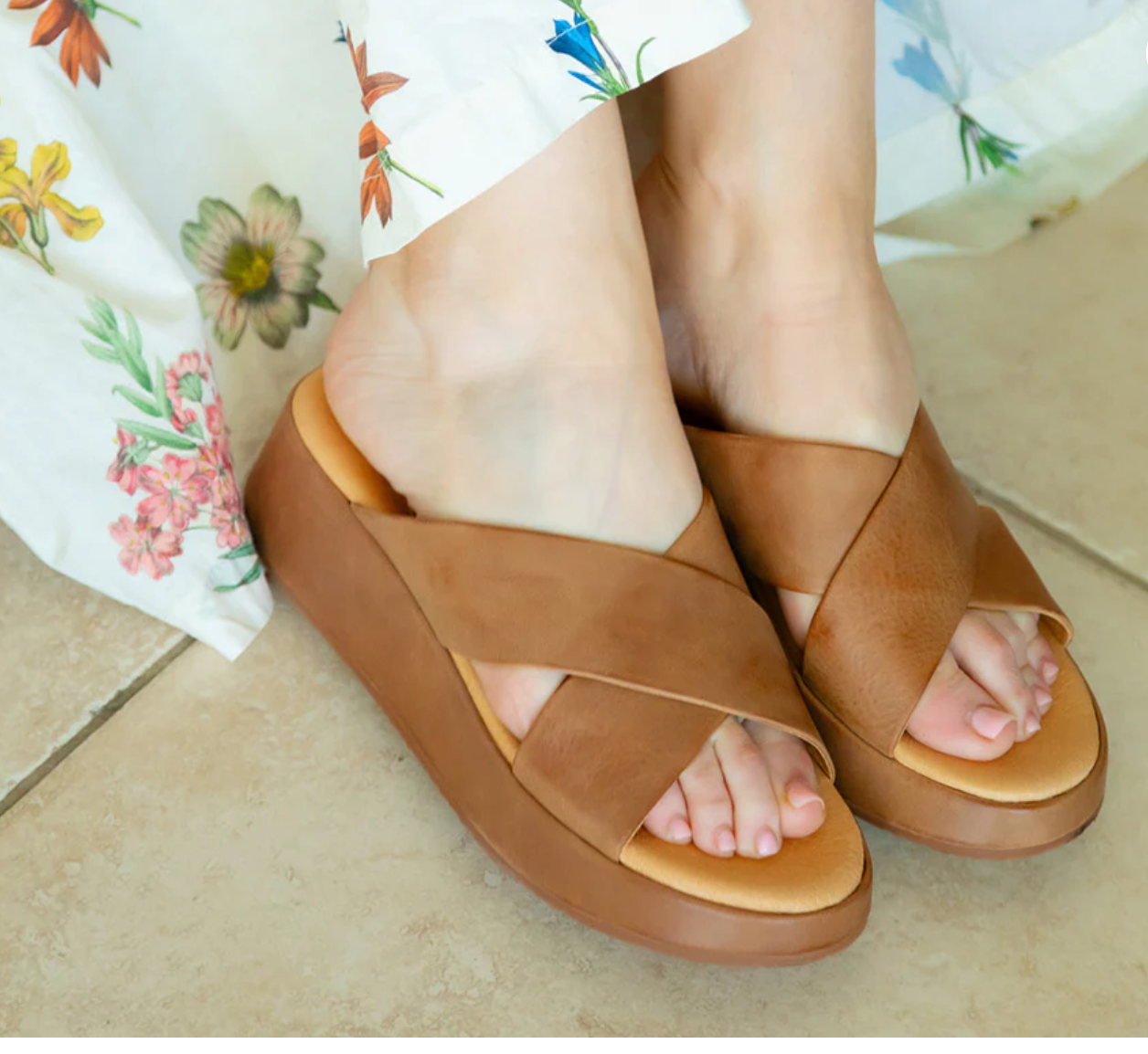 Experience the perfect balance of style and comfort with these low wedge slides. Crafted from high-quality leather with a sleek crisscross design, these slides feature a 1 3/4" heel and 3/4" platform. The padded footbed ensures all-day comfort.
