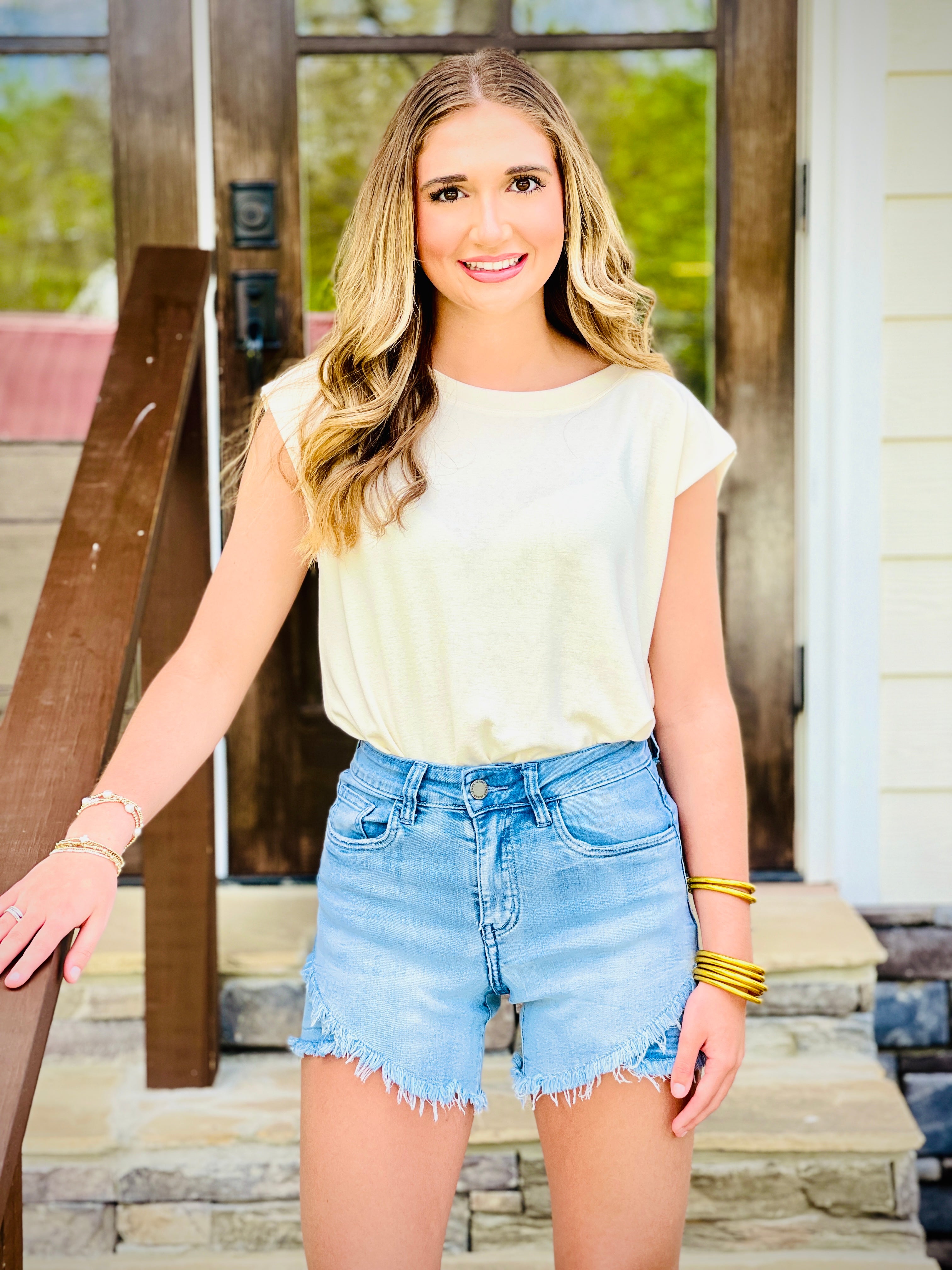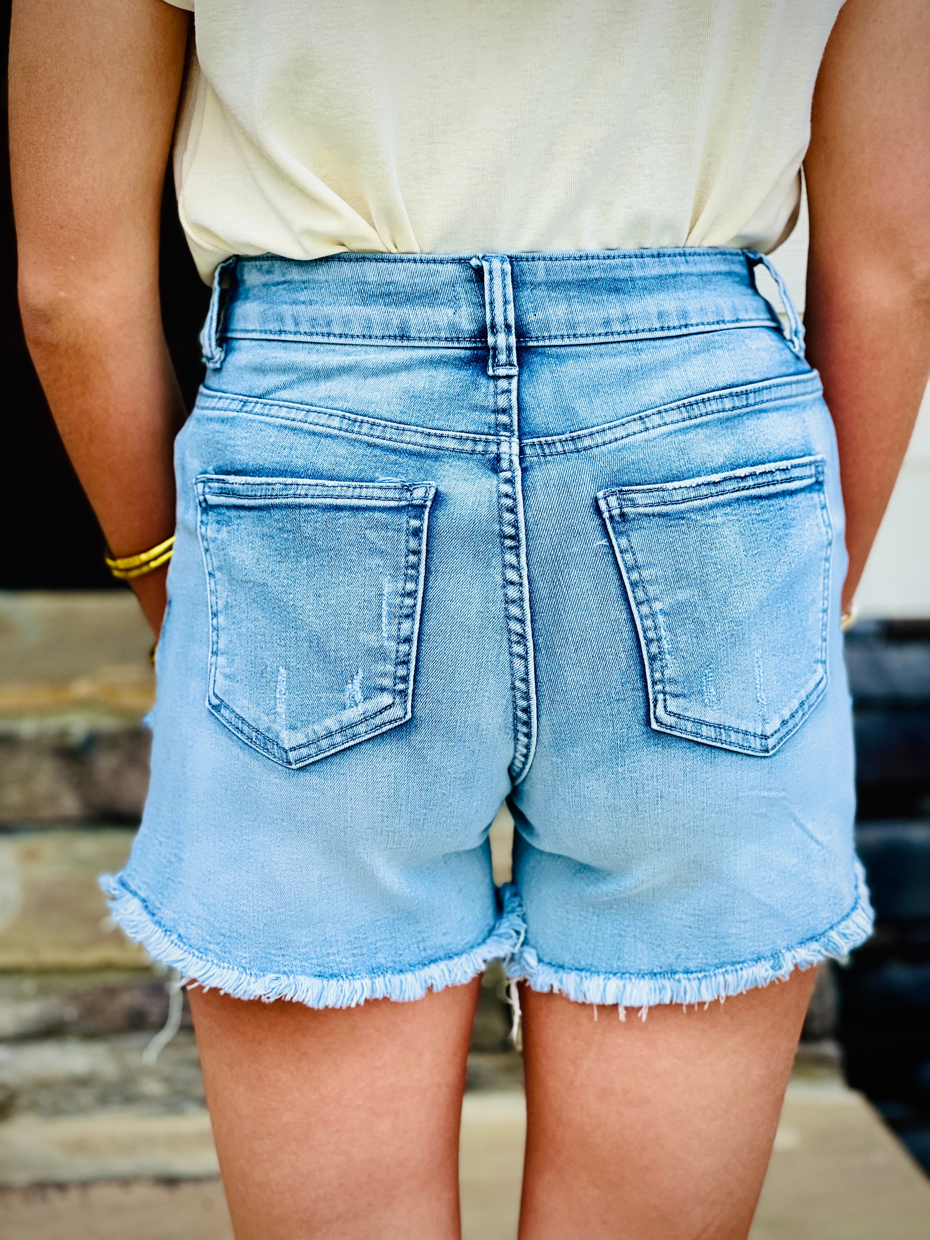 Work, play or lounge in our softest, coziest, comfiest jeans ever! Everstretch Crossover Shorts features a light denim wash and crossover fringe design. EverStretch Jeans by COCO + CARMEN feature a 4-way stretch fit with exceptional comfort. It's all in the details! Everlasting Stretch: so soft, so stretchy. Forever Soft: made of a special cotton, polyester, viscose, and spandex blend. They get better and better with every wash. Everyday Comfort: added stretch in the waistband that never cuts and buttons that never dig. Live in comfort and style. Get your new favorite jeans, today! 5 inch inseam, working zipper, button closure, belt loops, and front and back pockets.
