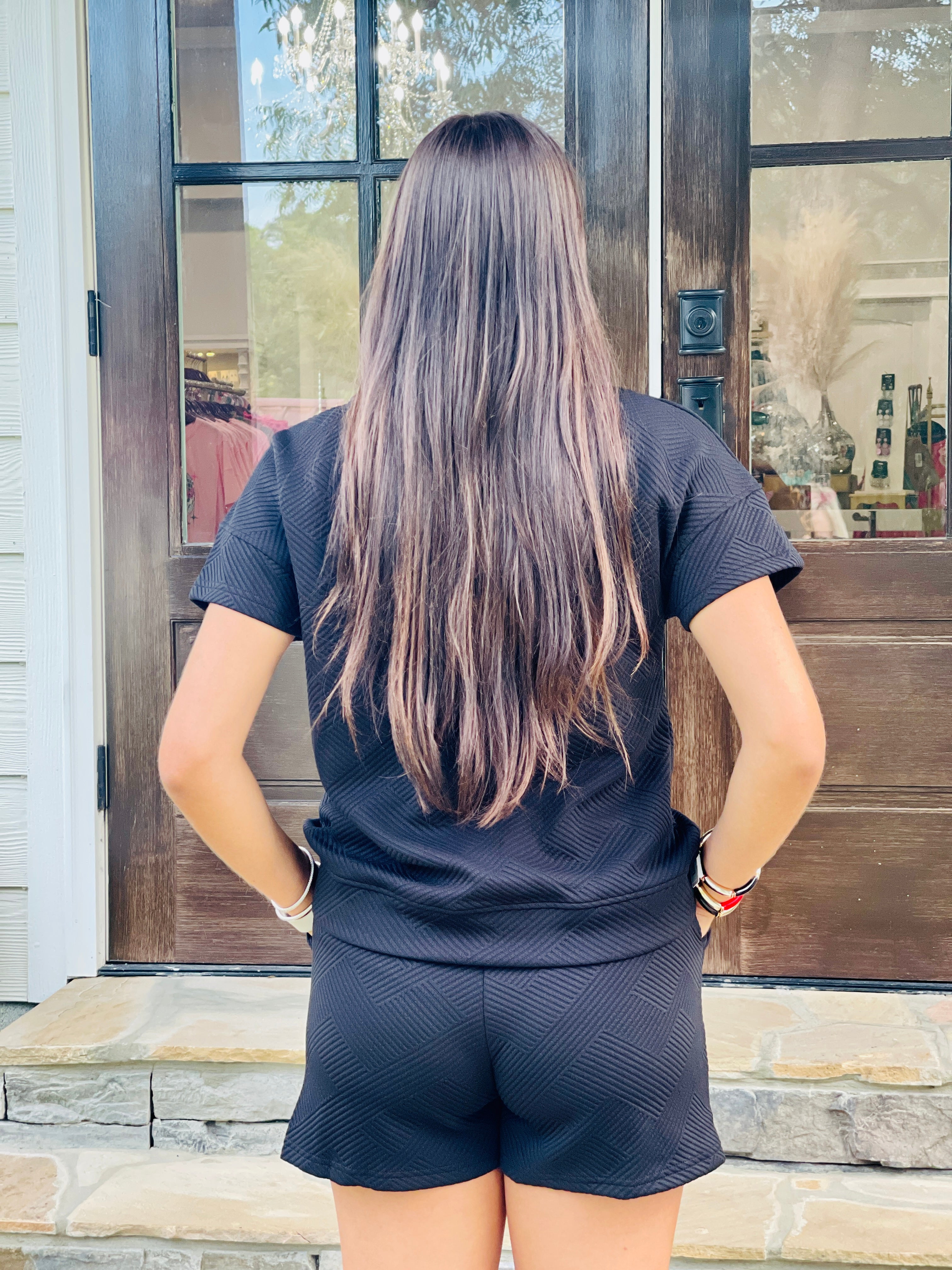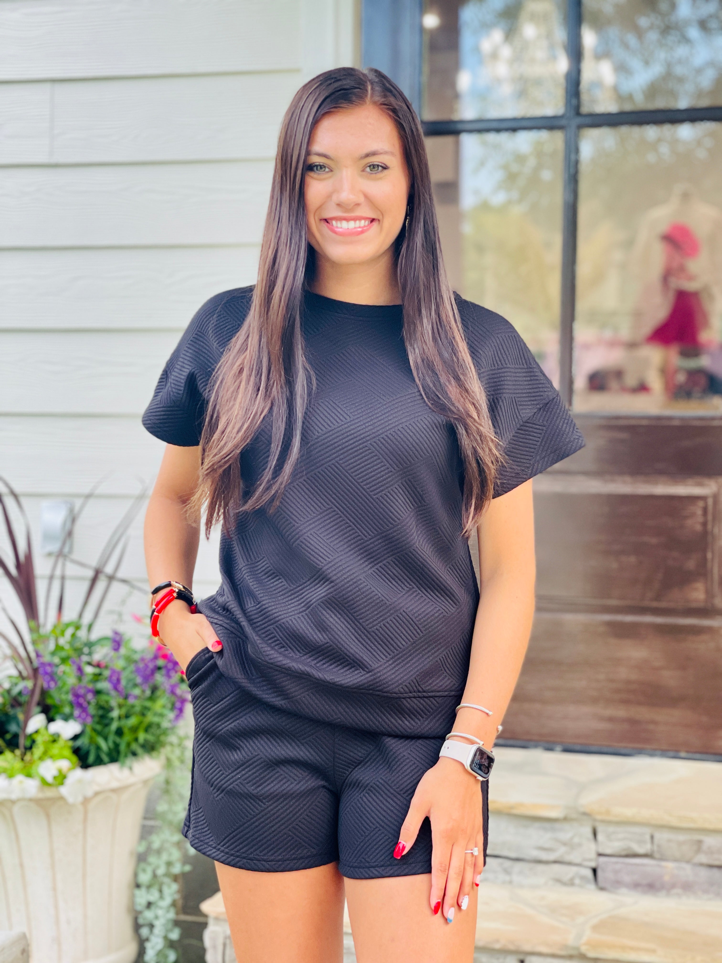 This shorts set is an effortless combination of style and comfort. Featuring a textured fabric that adds depth and dimension to the look, the drawstring waistband is adjustable for a personalized fit. The shorts-style bottom and versatile design make this an ideal option for any occasion--dressed up or down with ease.