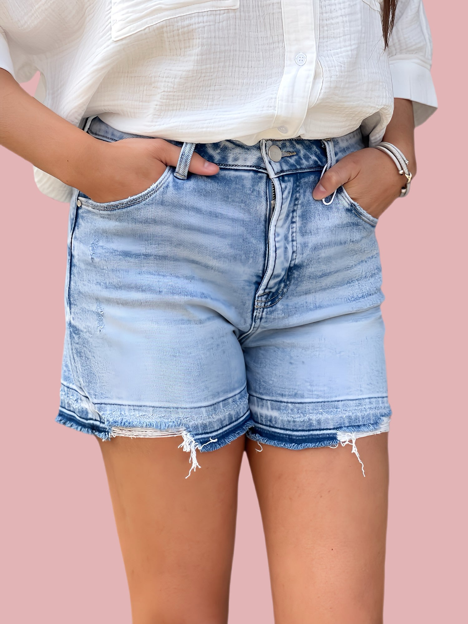 Achieve a flattering silhouette with our Tummy Control High Rise Released Hem Shorts. Featuring a 10 1/2" rise and 4" inseam, these shorts provide comfortable coverage and a released hem adds a stylish touch. Perfect for any body type, our model stands at 5'8" with a 25" waist and 35" hips.