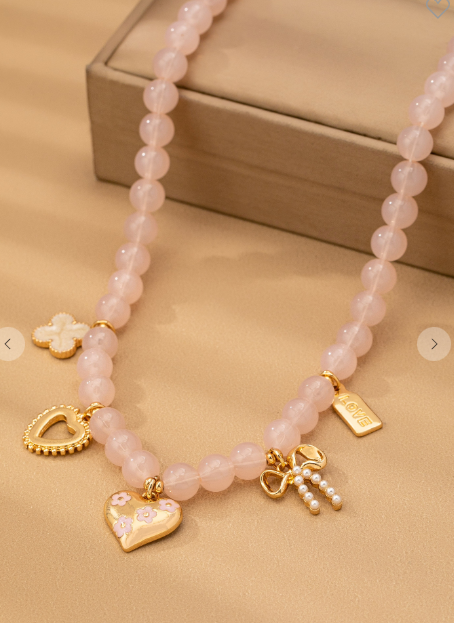 Beaded Chain Charm Necklace a delightful mix of charms, including a heart, bow, flower, clover all beautifully strung on a beaded sleek chain. The charm patterns brings a trendy, bold vibe, the heart represents love, and the rhinestone charm adds a bit of glamour and shine.