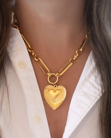 Featuring a high-shine, oversized chain and a dimensional etched heart pendant, this piece brings fun, fashion-forward energy to any outfit. Perfect gift for the holidays, including Christmas, Mother's Day, Valentine's Day.
