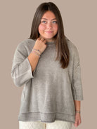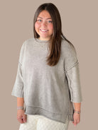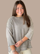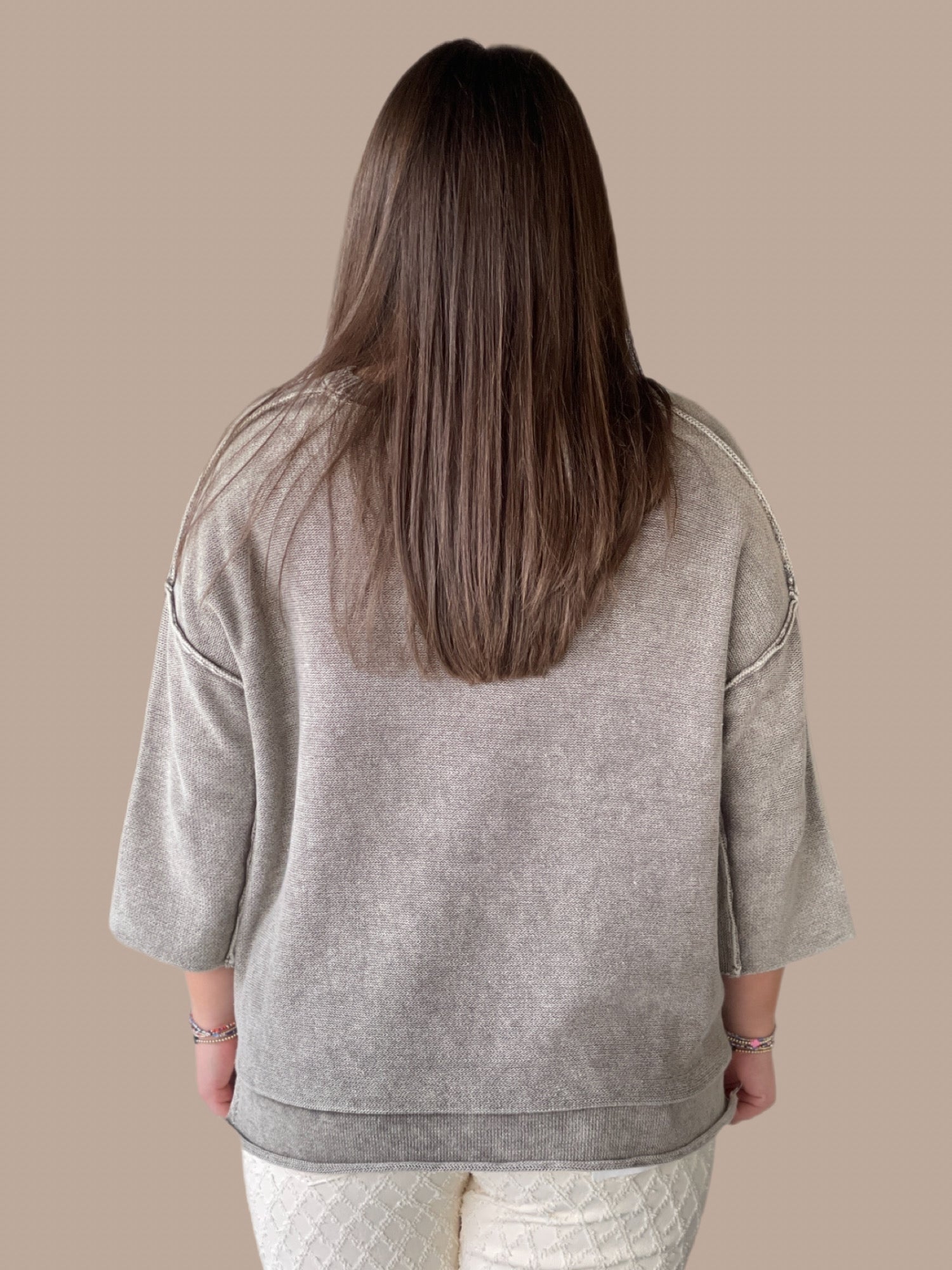 Effortlessly chic and undeniably comfortable, this washed 3/4 sleeve boxy sweater delivers relaxed sophistication. The oversized silhouette drapes beautifully while side slits add movement and visual interest. Measuring 23.5" in total body length with a 50" chest (based on small sizing), it's designed for that coveted laid-back fit. The muted, washed finish gives it a lived-in appeal that pairs seamlessly with everything from tailored trousers to your favorite denim.