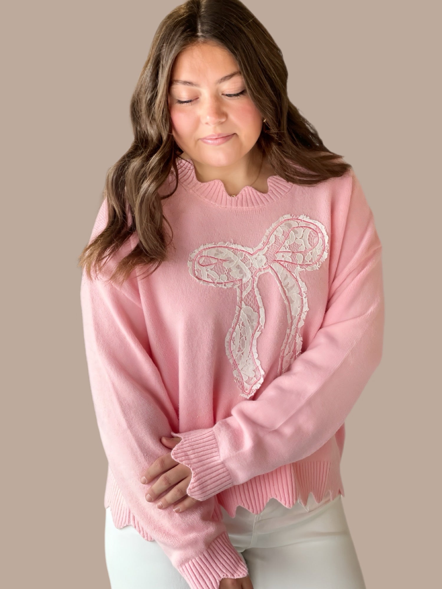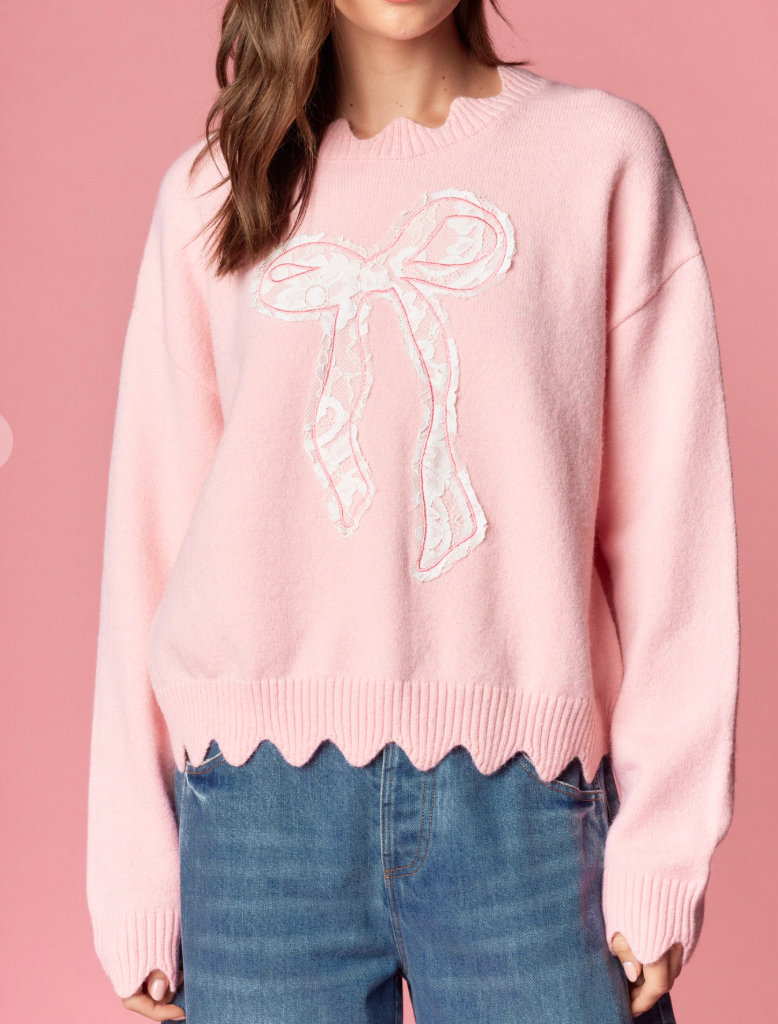 Effortlessly chic, this relaxed-fit crewneck sweater combines comfort with refined details. Crafted from soft brushed knit, it drapes beautifully while maintaining its shape. A delicate lace bow applique adorns the front, while scalloped edging on the hem and sleeve cuffs adds a polished finishing touch. Perfect for layering or wearing solo, this versatile piece transitions seamlessly from casual to elevated styling.
