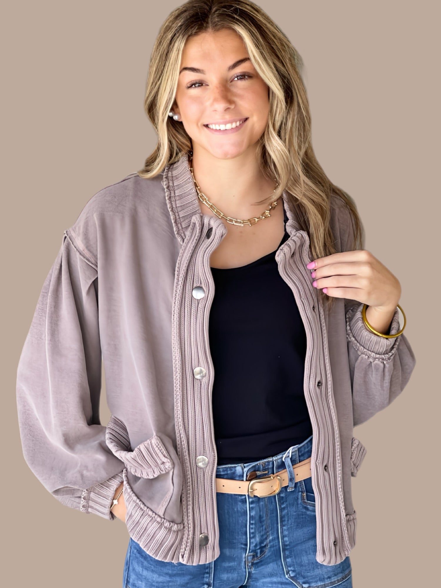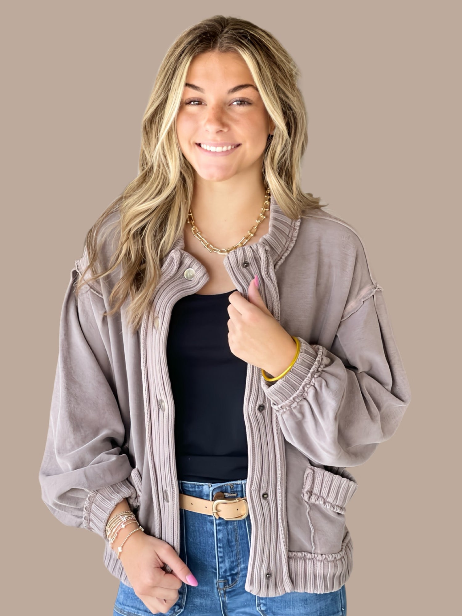 Elevate your layering game with this timeless cardigan jacket, crafted from soft washed vintage knit fabric that develops character with every wear. The ribbed trim detailing adds refined structure to the neckline and cuffs, while convenient snap button closure ensures effortless dressing. Functional patch pockets provide practical storage without compromising the polished silhouette. Perfect for transitional seasons, this versatile piece pairs seamlessly with everything from casual basics to tailored separates, making it an essential addition to any well-curated wardrobe.