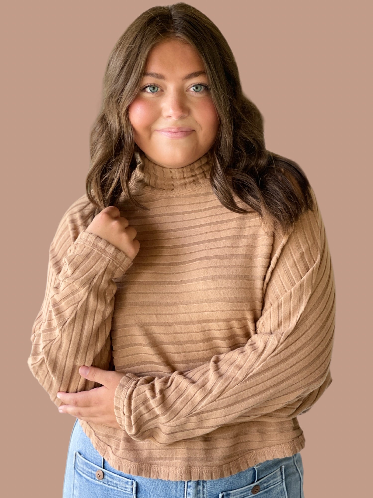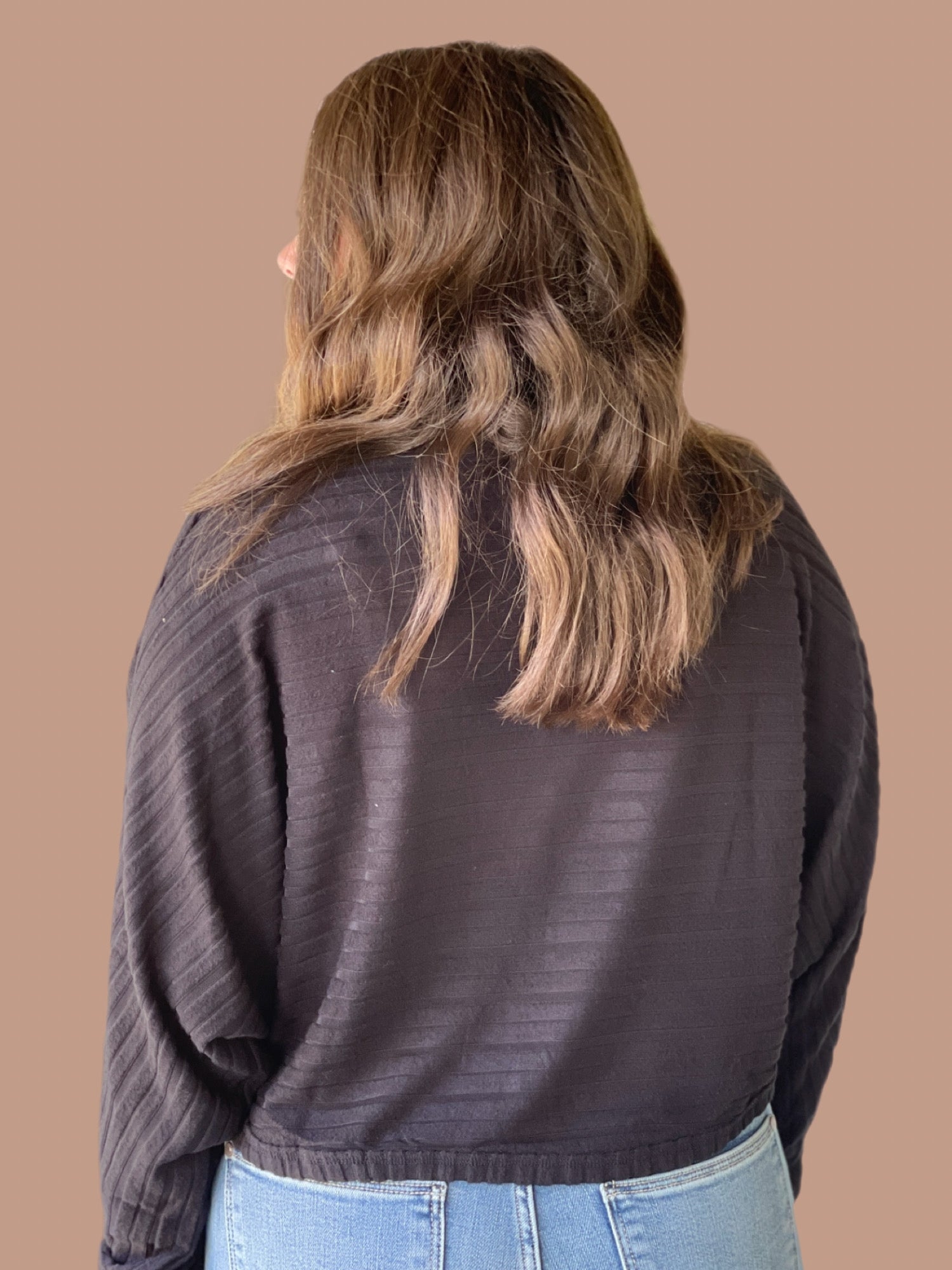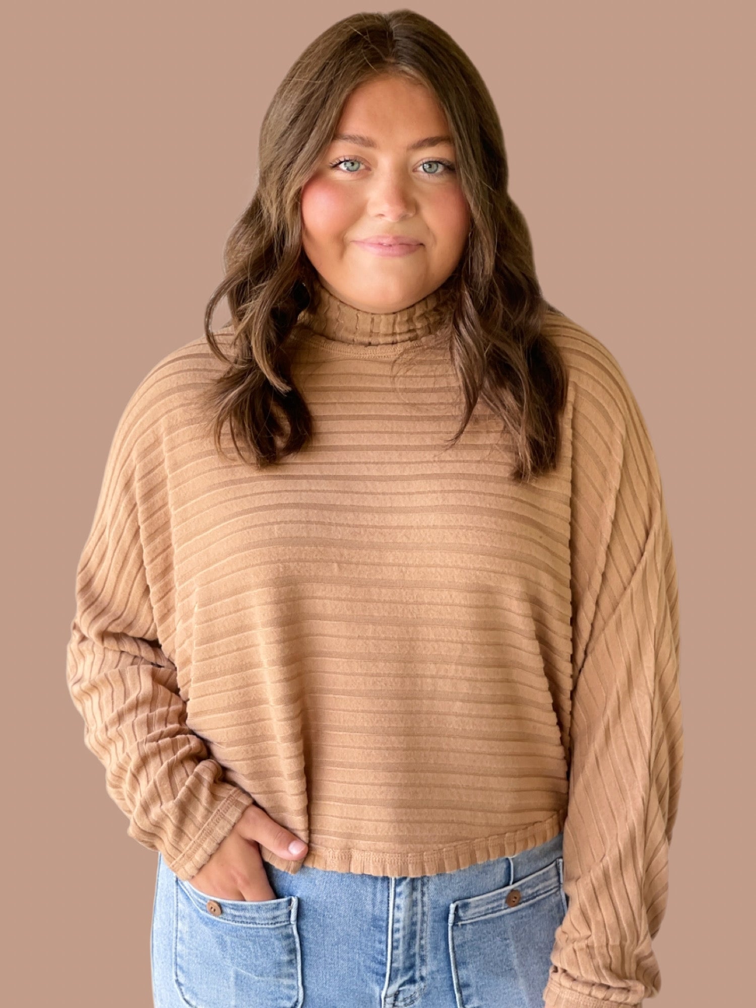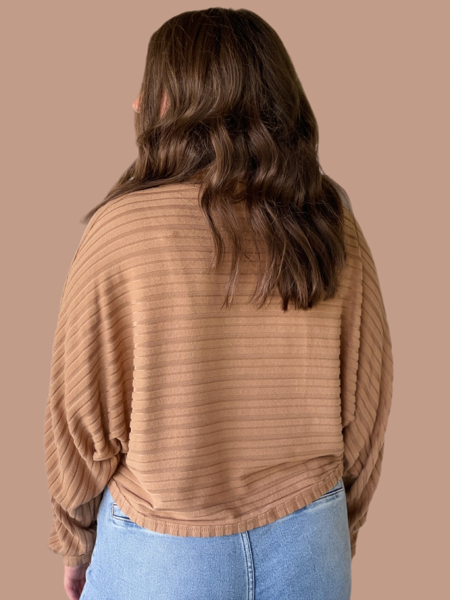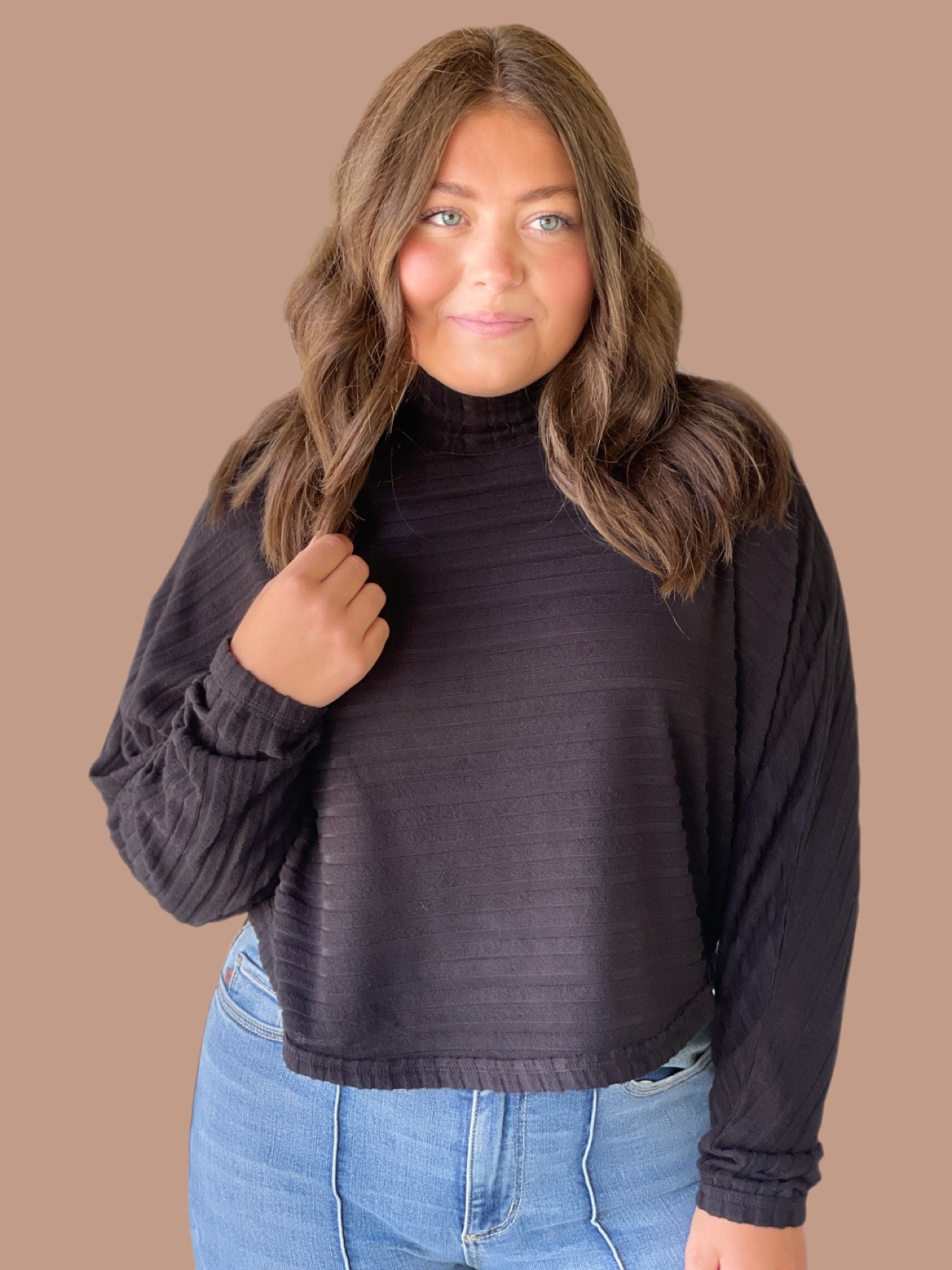 This textured top combines subtle horizontal stripes with a soft mock neckline for refined comfort. Its exaggerated dolman sleeves with gathered cuffs add a distinctive silhouette, while the relaxed cropped fit and lightly ribbed hem create a balanced, effortlessly polished appearance. Ideal for layering or wearing alone, it offers both style and ease for a sophisticated casual look.