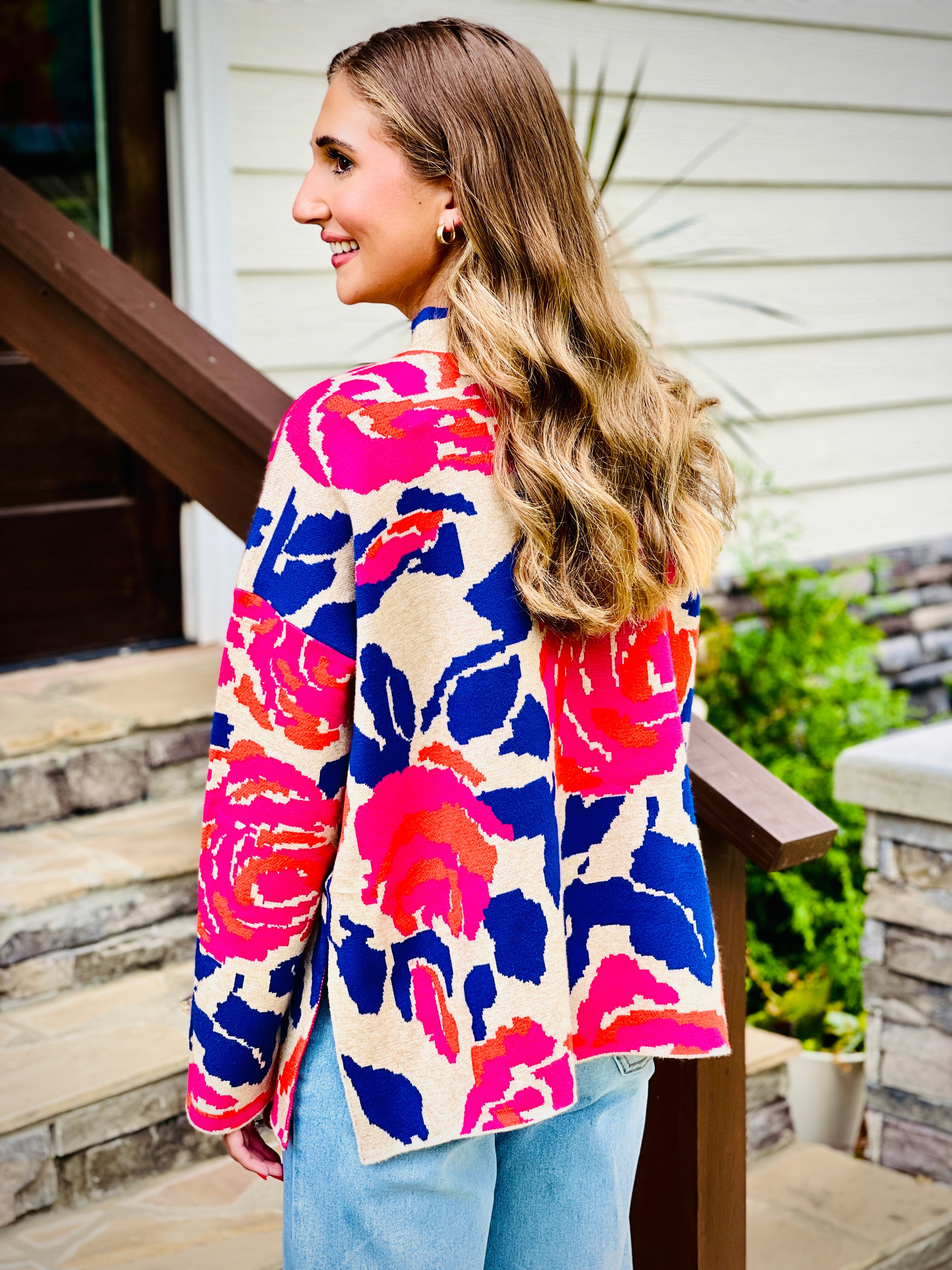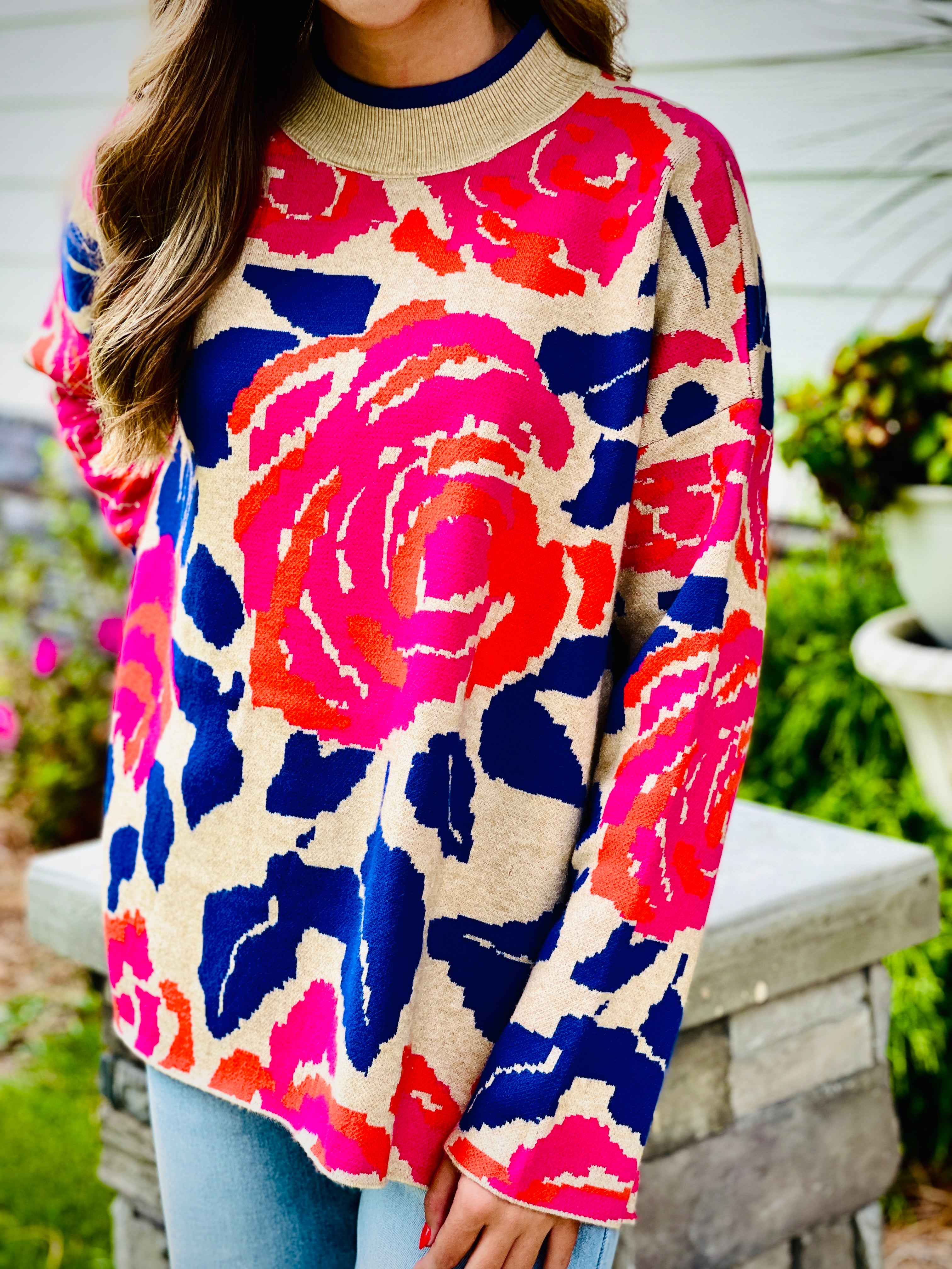 This flower print knit pullover top features a mock neck, drop shoulders, and long sleeves for a stylish and comfortable look. Its non-sheer and lightweight material adds practicality and ease to the fashion. The side slit adds a touch of detail and flow. A must-have for any wardrobe.
