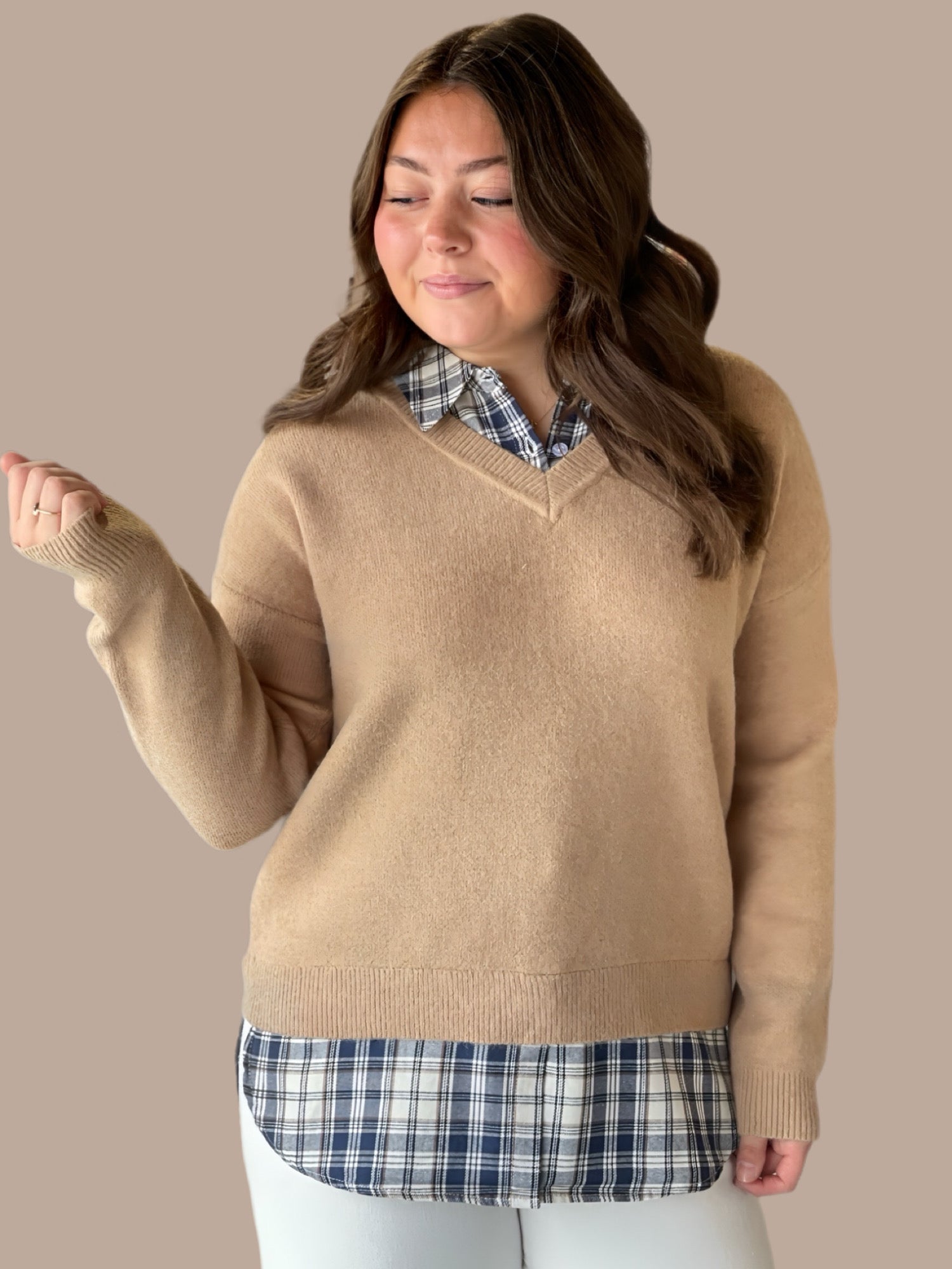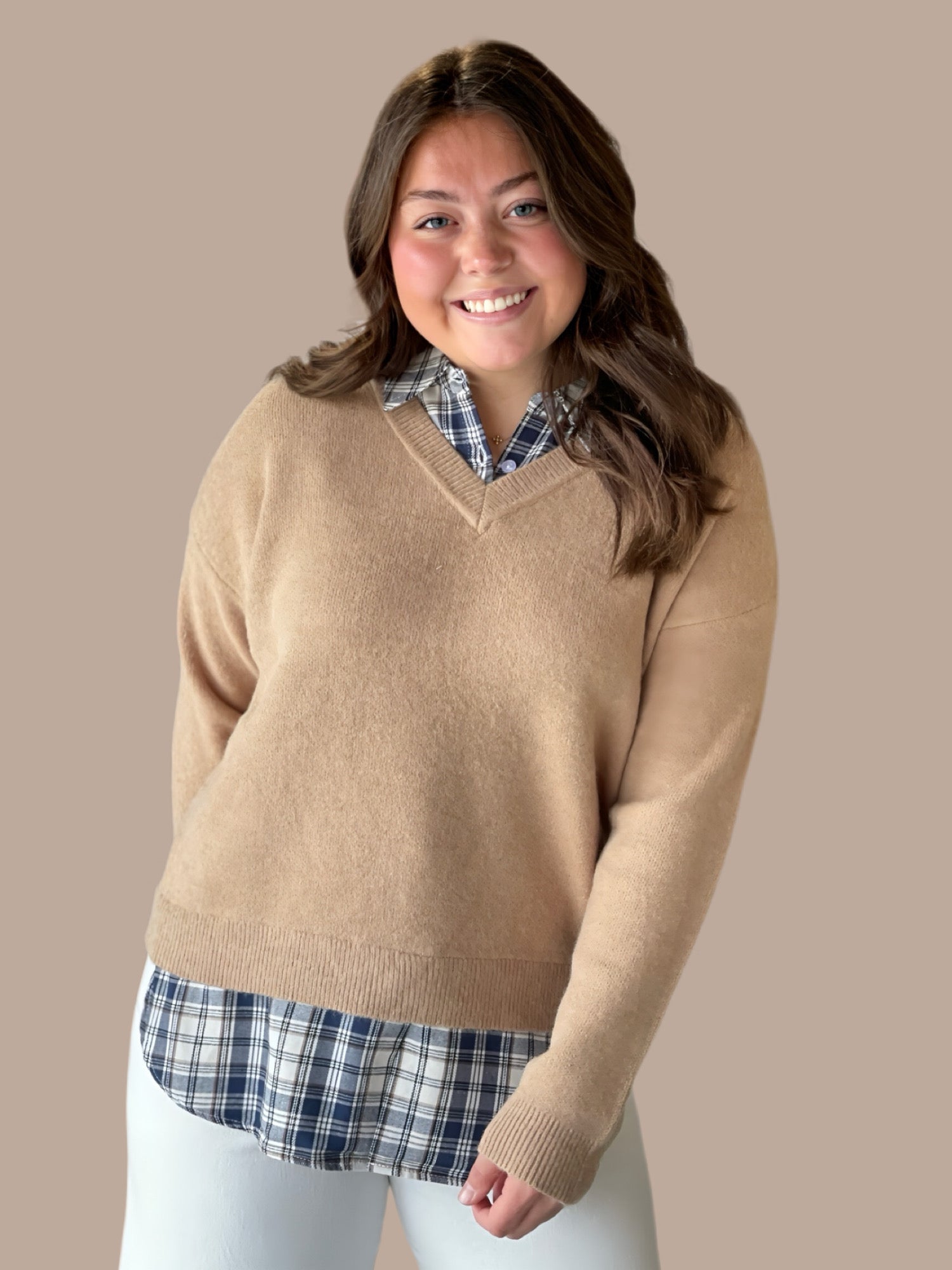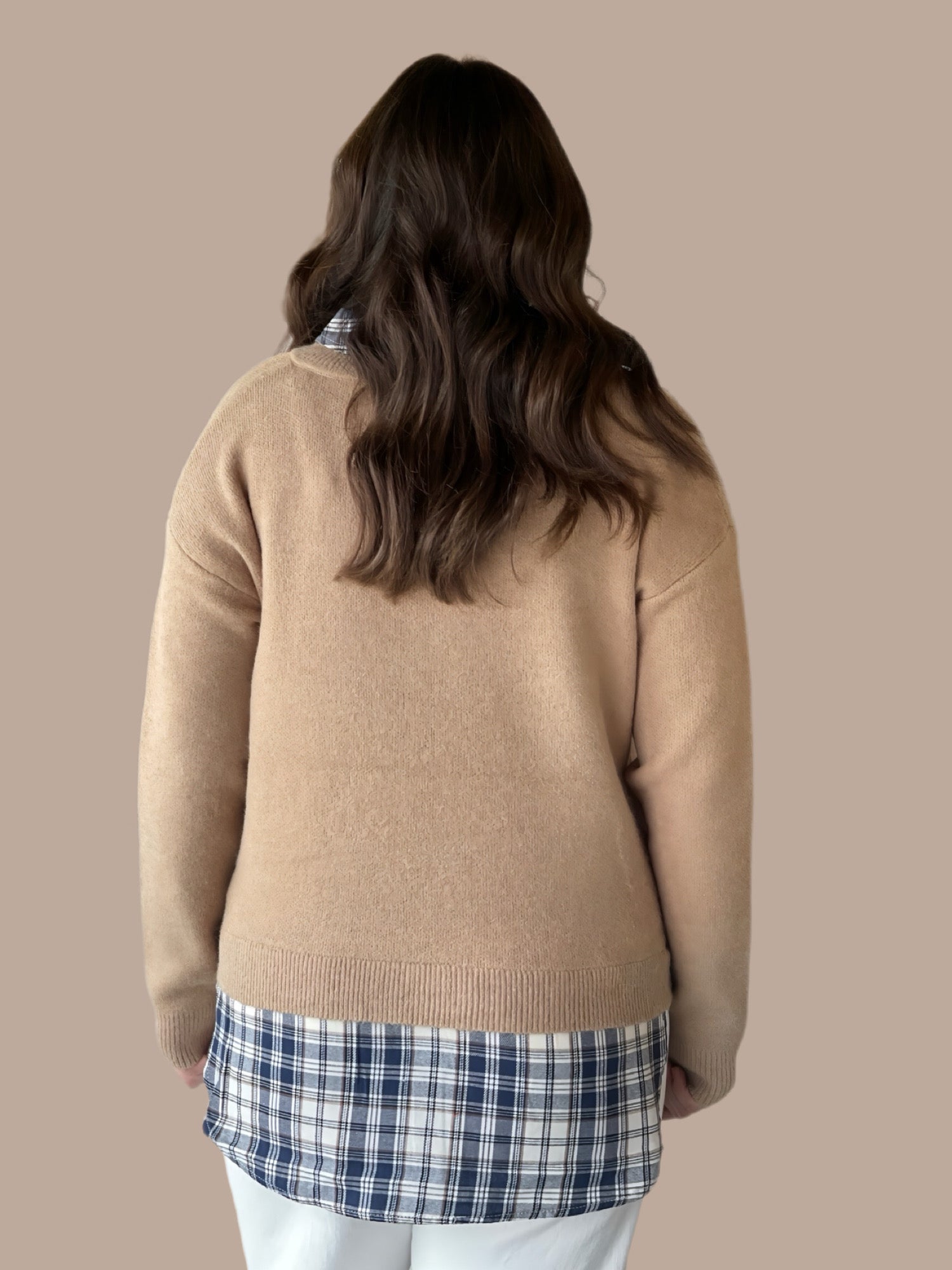 Elevate your seasonal wardrobe with this sophisticated V-neck sweater, featuring a striking plaid accent that adds visual interest to a refined mixed-knit construction. The thoughtful blend of textures creates dimension while maintaining a polished silhouette perfect for layering or wearing solo. Versatile enough for both professional settings and casual occasions, this piece transitions seamlessly from office to weekend. The classic V-neckline flatters various body types and pairs effortlessly with your existing basics. A timeless investment that combines contemporary design with enduring style.