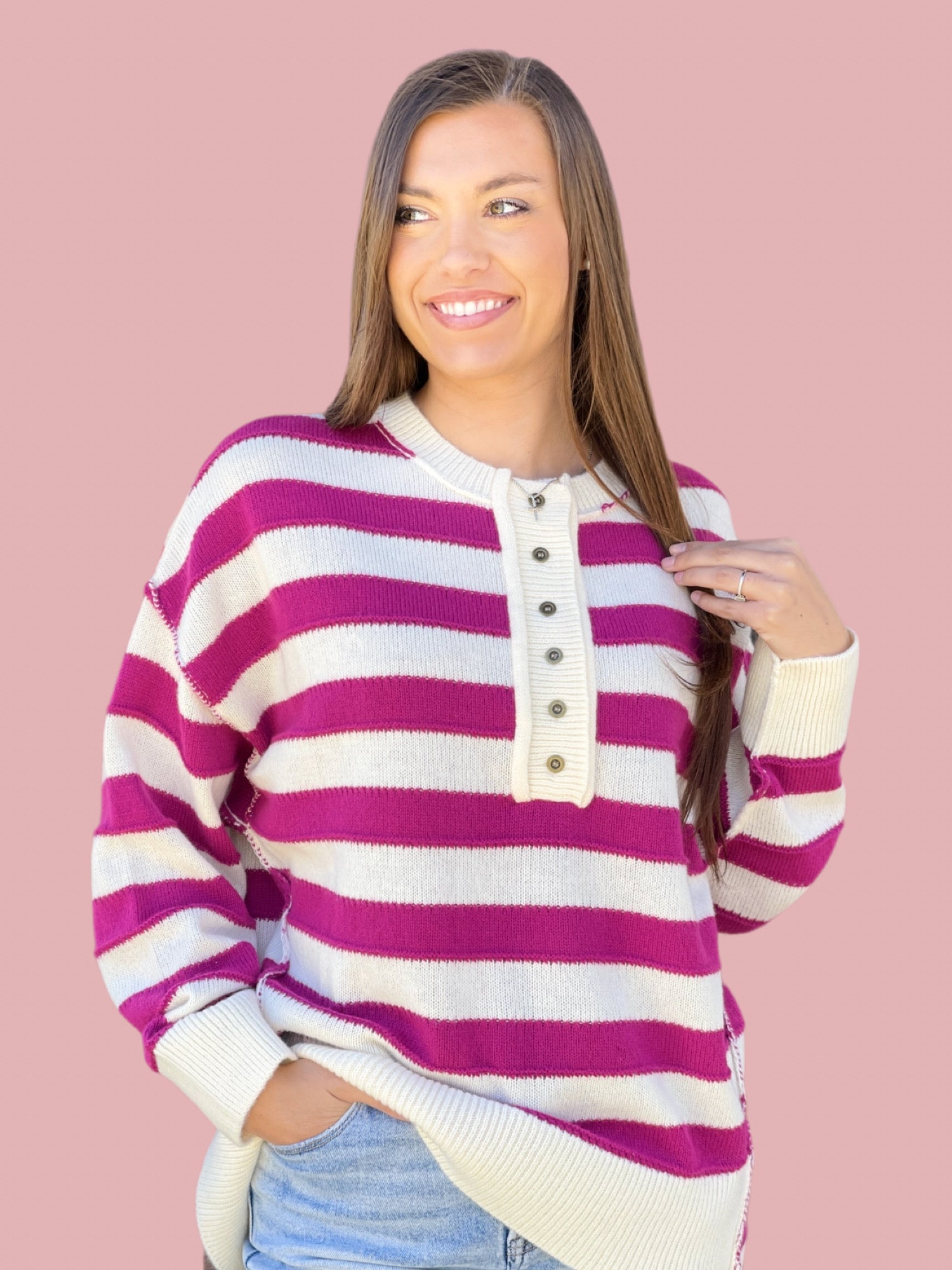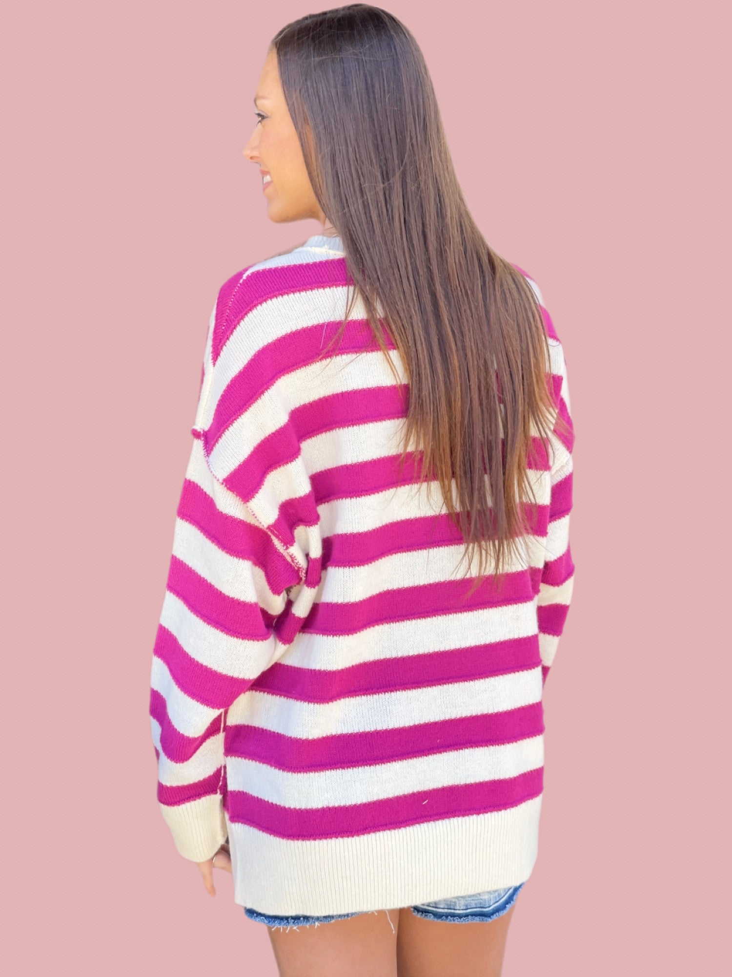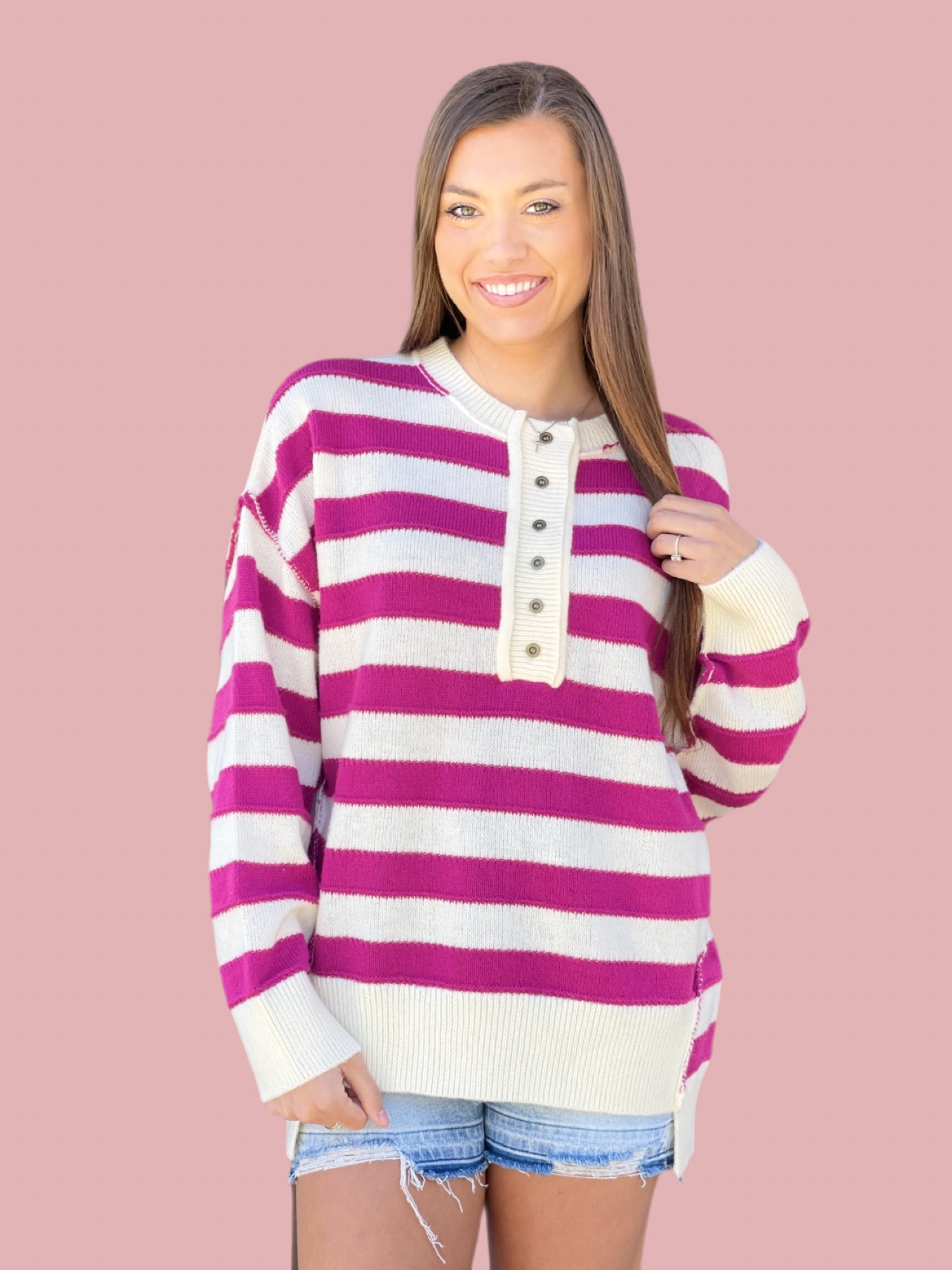 Introducing our Poly Stripe Oversized Sweater, featuring a loose fit and placket design for both comfort and style. Made from premium materials, this sweater is perfect for any occasion. Stay cozy and on-trend with this must-have addition to your wardrobe. Order now and elevate your fashion game.