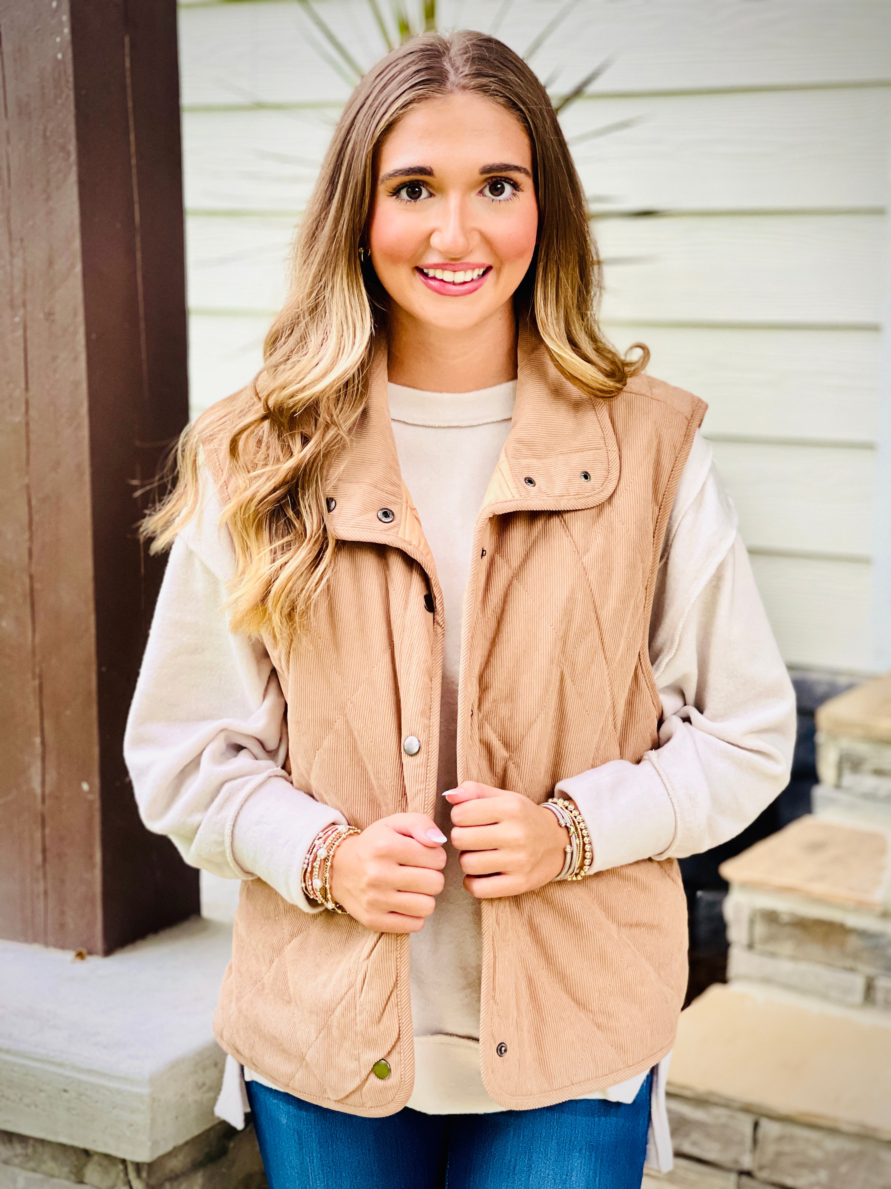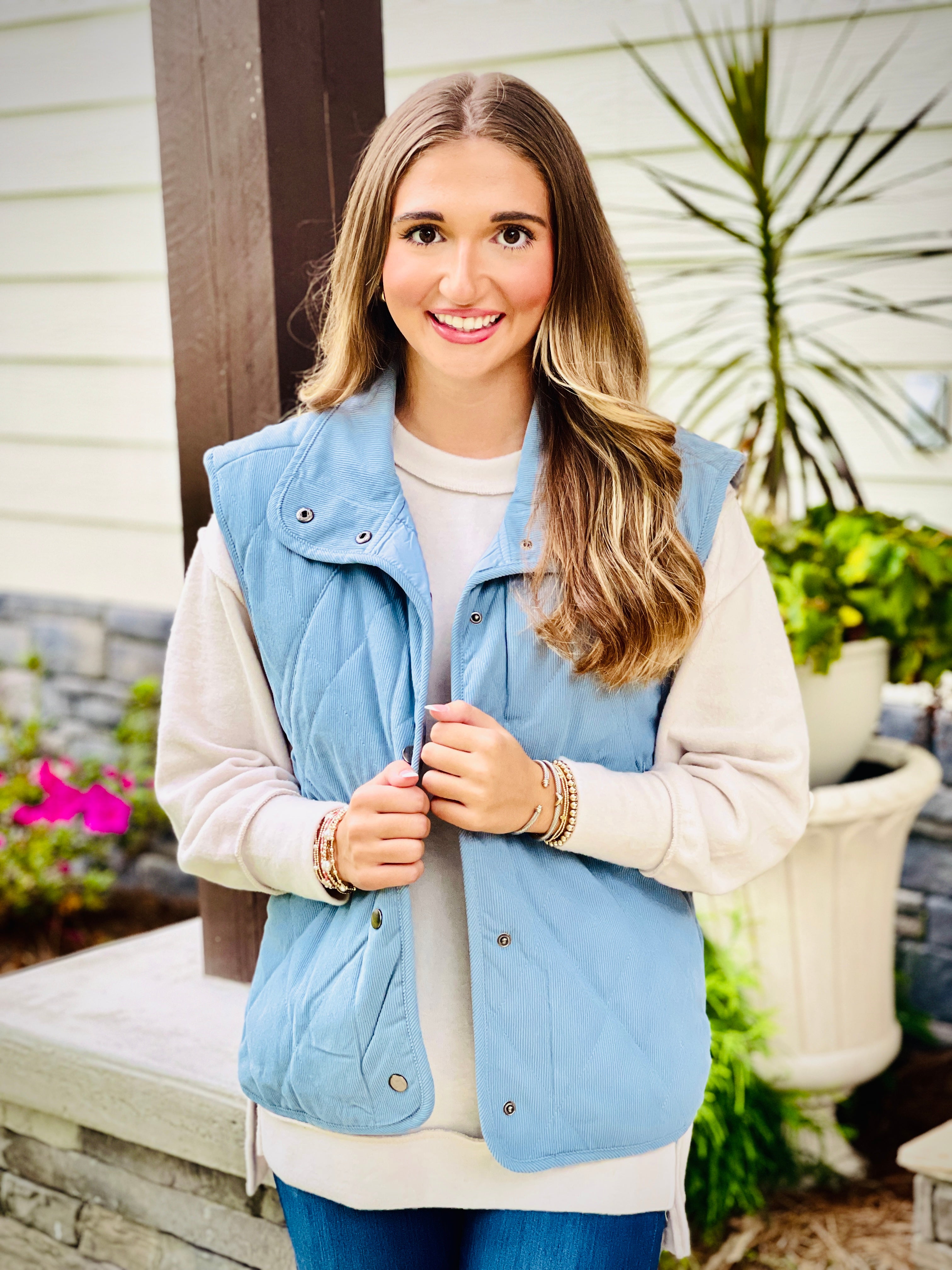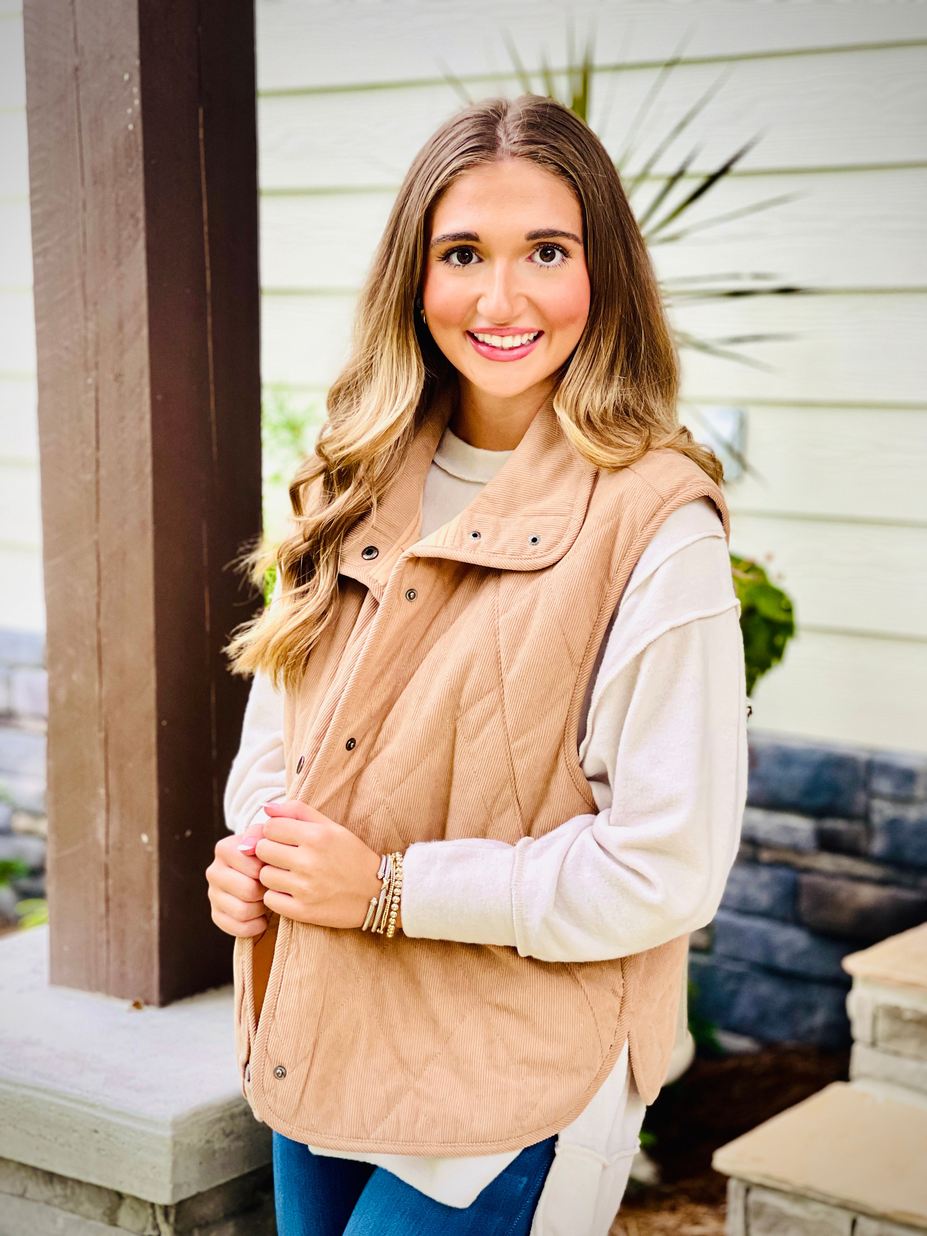 This corduroy shirt features a high neck, sleeveless design and snap button closure for a versatile and stylish look. The fully lined quilted puffer vest adds warmth and insulation, while the round hem and pockets add functionality. Perfect for cold weather, stay cozy and trendy with this must-have combo.