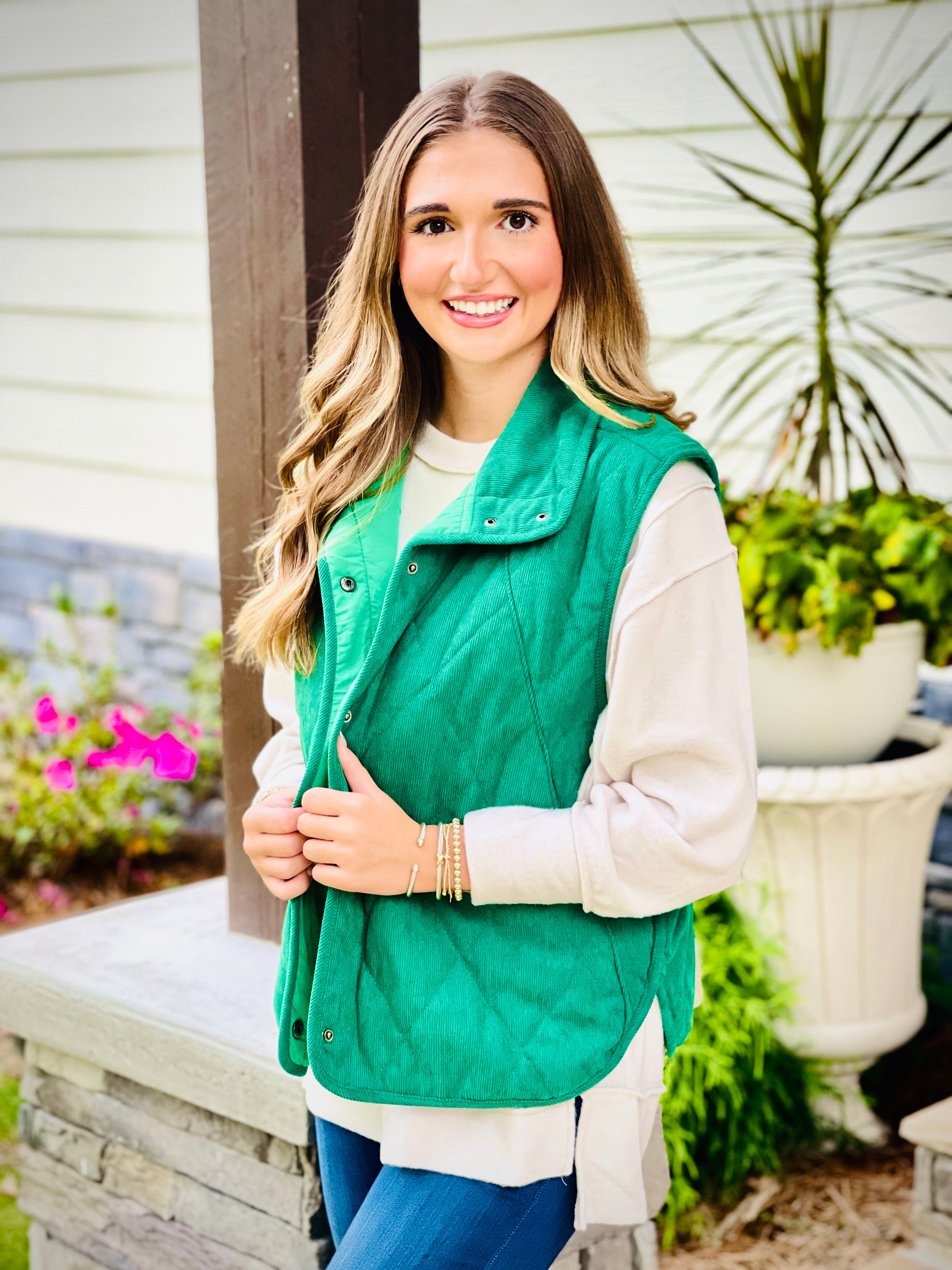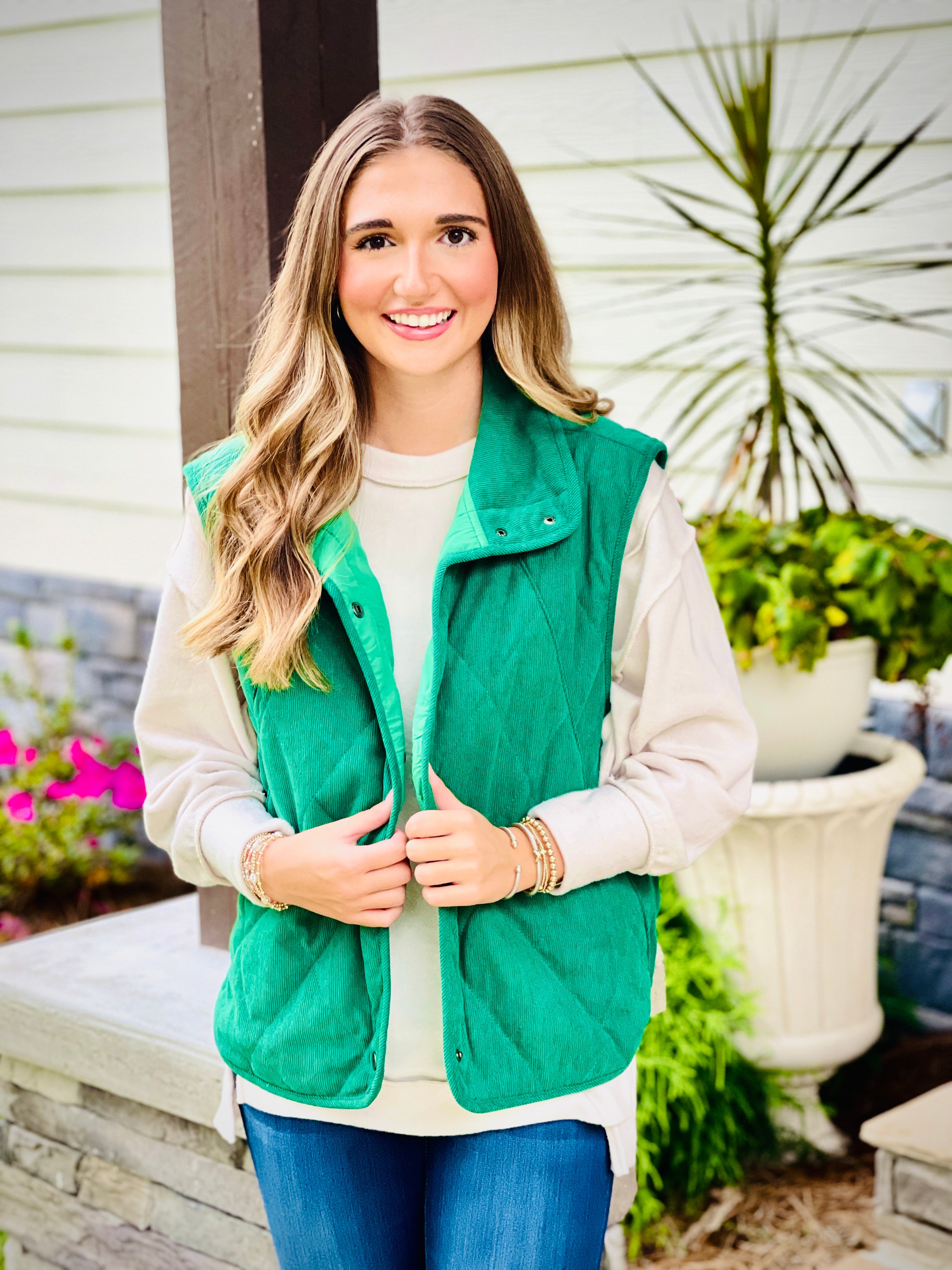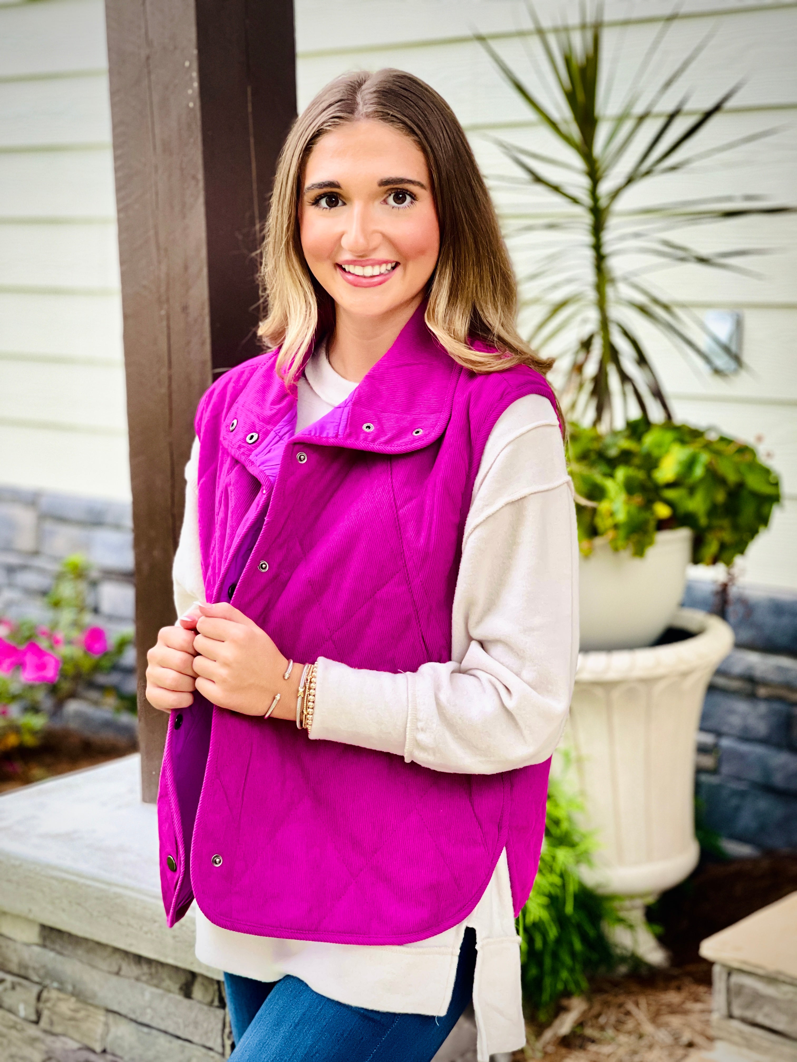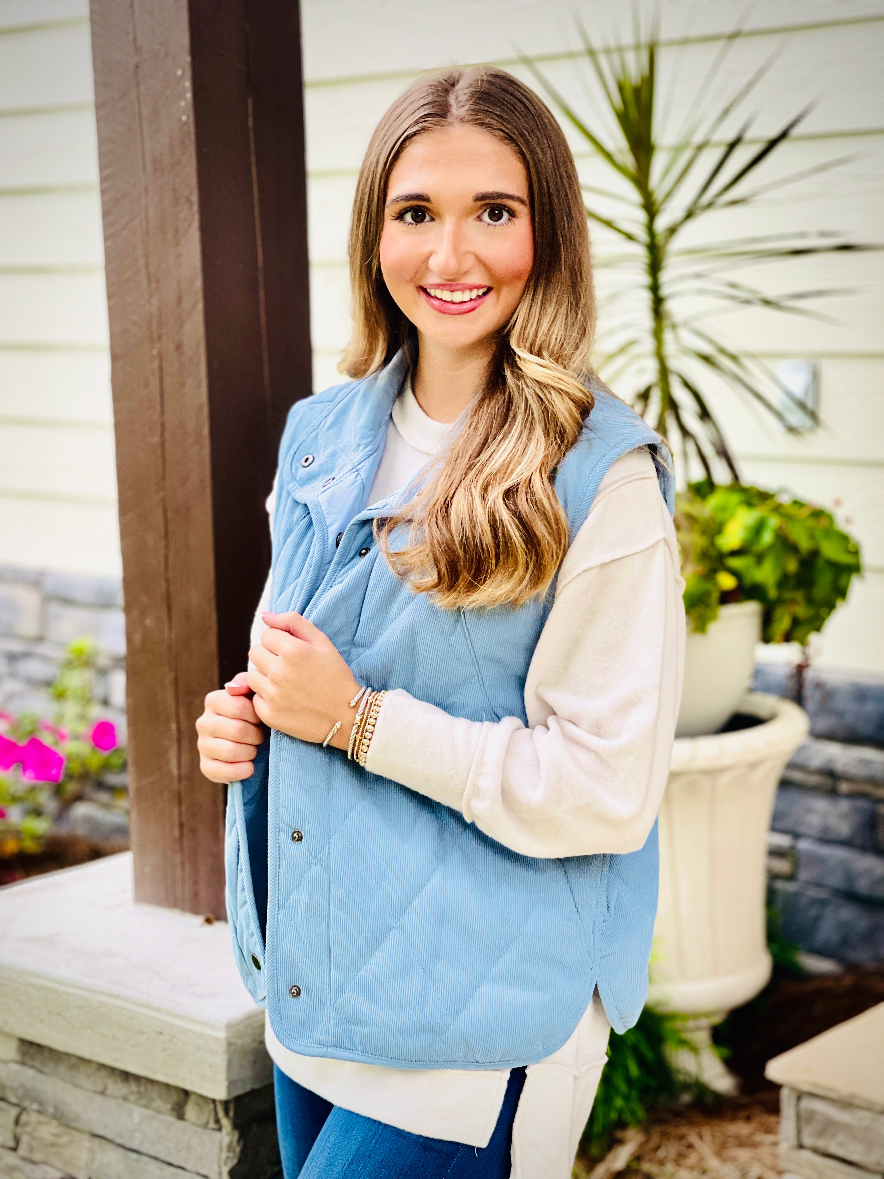 This corduroy shirt features a high neck, sleeveless design and snap button closure for a versatile and stylish look. The fully lined quilted puffer vest adds warmth and insulation, while the round hem and pockets add functionality. Perfect for cold weather, stay cozy and trendy with this must-have combo.