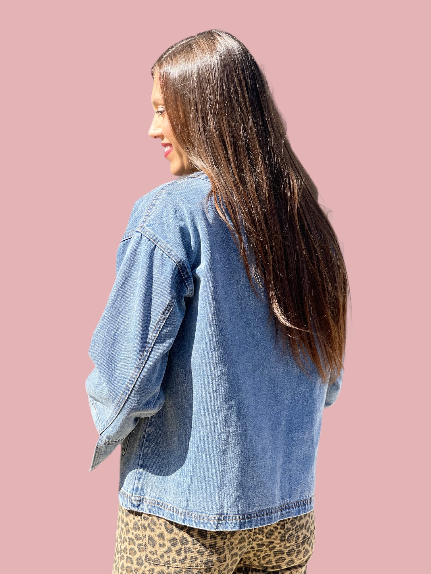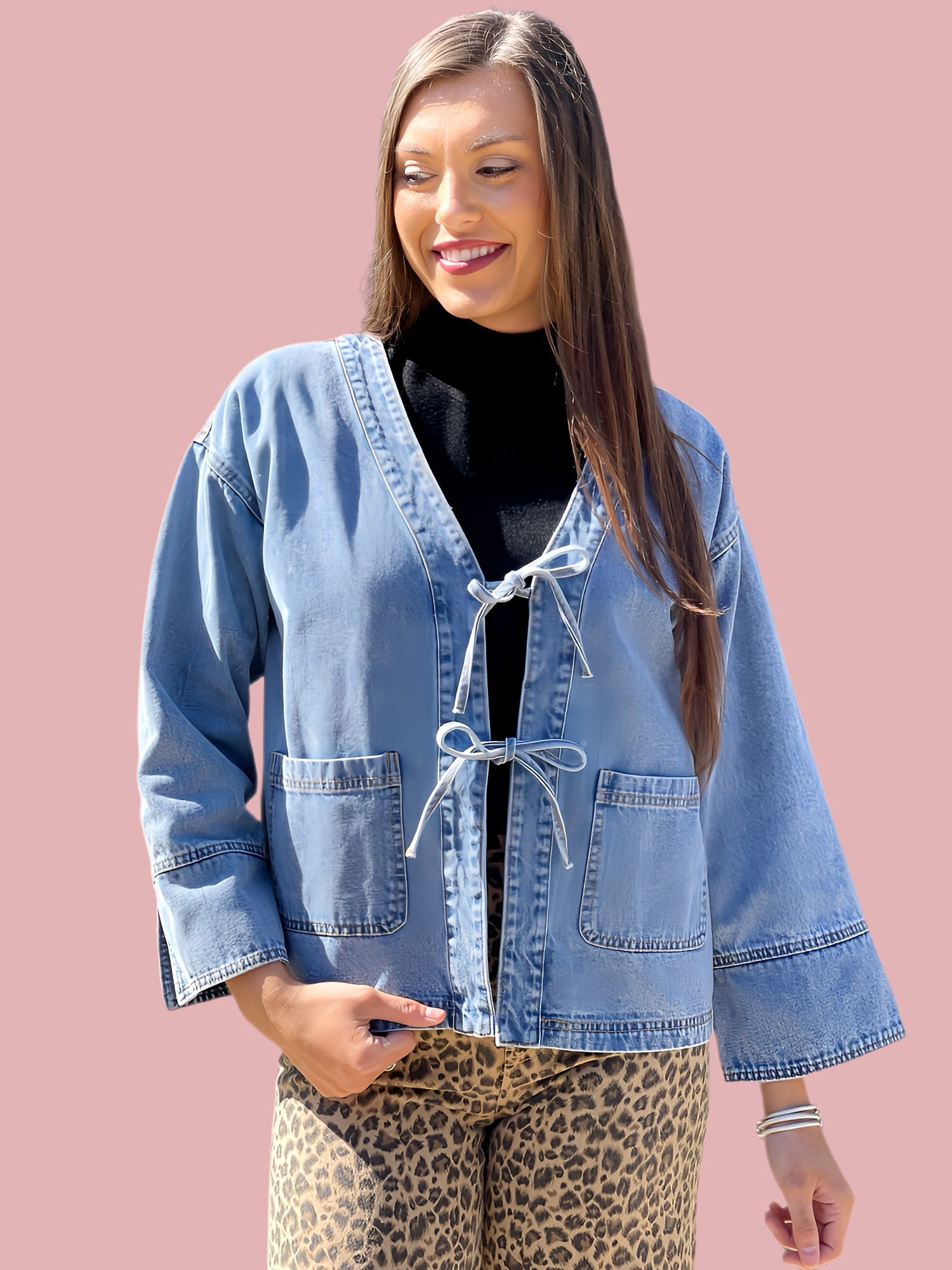 Expertly crafted with a front bow tie closure and split cuff opening, this denim jacket ensures a stylish look. Designed with front patch pockets and unlined for a lightweight fit, its wide long sleeves add a touch of elegance. The non-sheer, woven fabric makes it a versatile addition to any wardrobe.