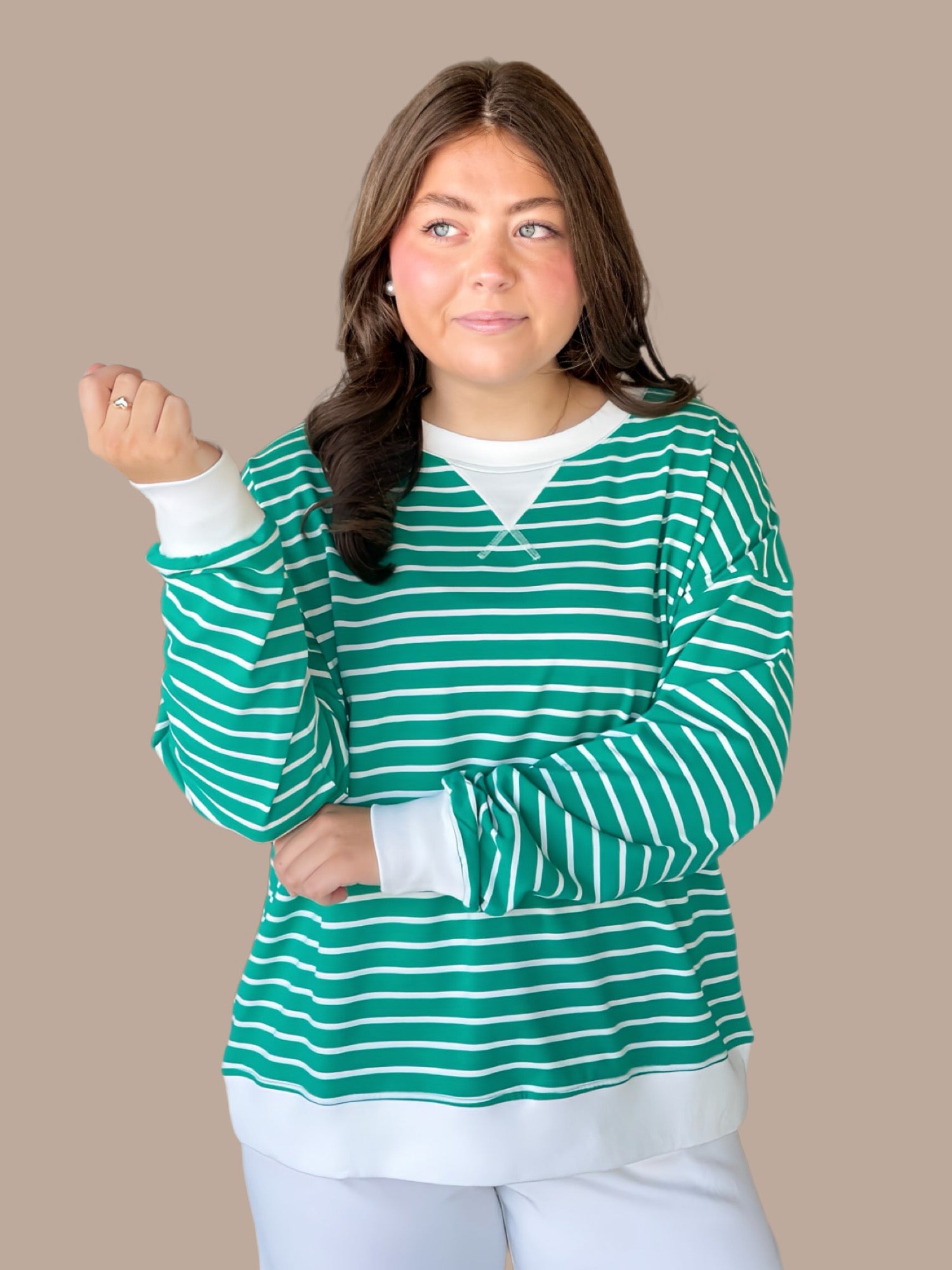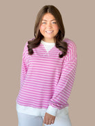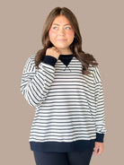 The Go-To Stripe Pullover delivers timeless versatility with its classic striped pattern and distinctive Dorito neck stitch detail. This essential layering piece transitions seamlessly from casual weekends to polished workdays, offering a refined silhouette that flatters various body types. The structured neckline adds visual interest while maintaining the relaxed comfort you need for all-day wear. Perfect for building a capsule wardrobe with pieces that work together effortlessly.