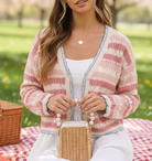 Wrap yourself in sweetness with the Luna Love Striped Cardigan—where cozy comfort meets playful romance. This charming button-down features soft pastel horizontal stripes paired with delicate open-knit hearts for an effortlessly stylish look. Finished with a contrast scallop trim along the neckline, hem, and cuffs, this cardigan brings both warmth and whimsy to any outfit. Perfect for layering or wearing solo, it's the ideal piece for adding a touch of sweetness to your everyday wardrobe.