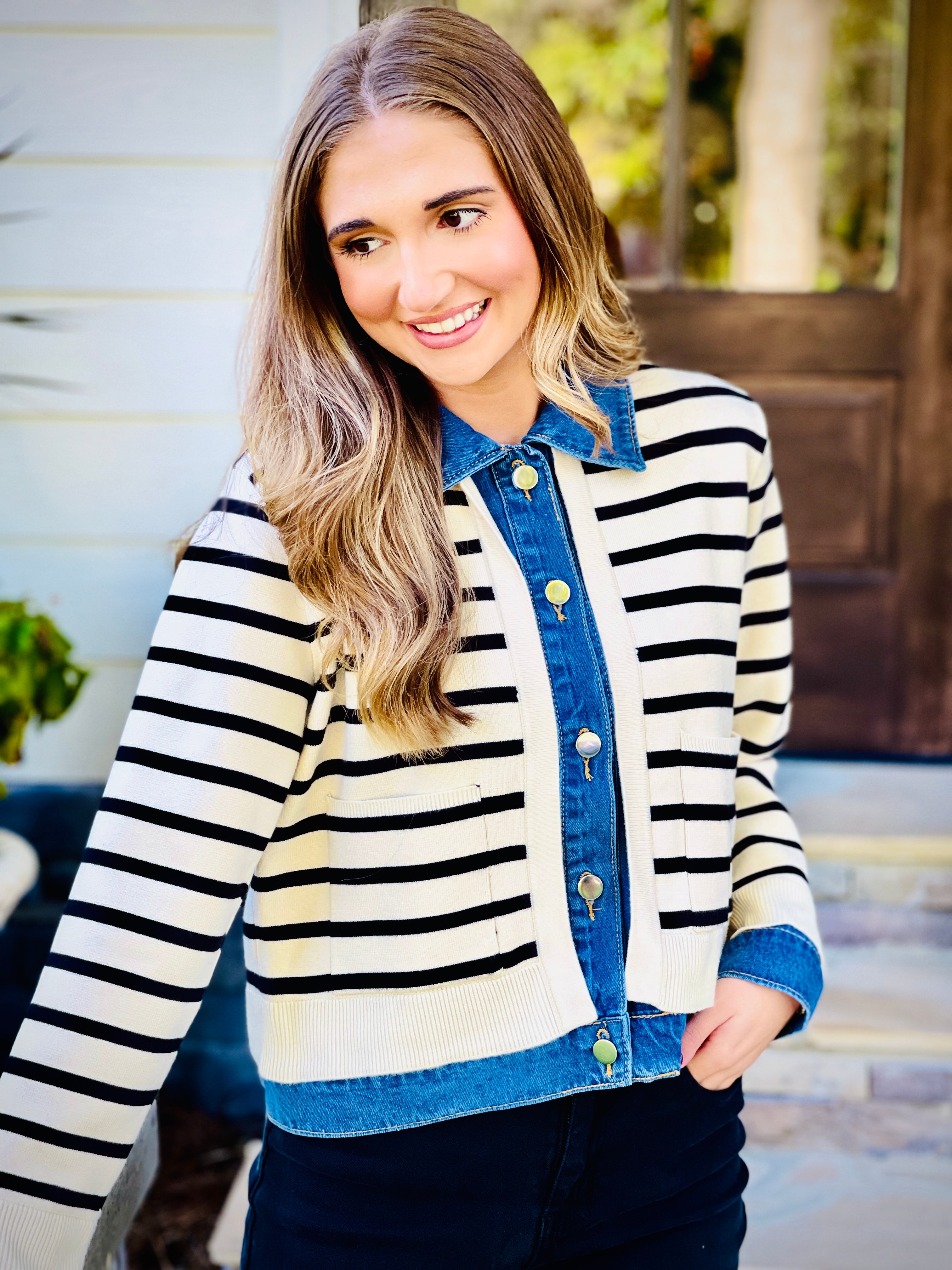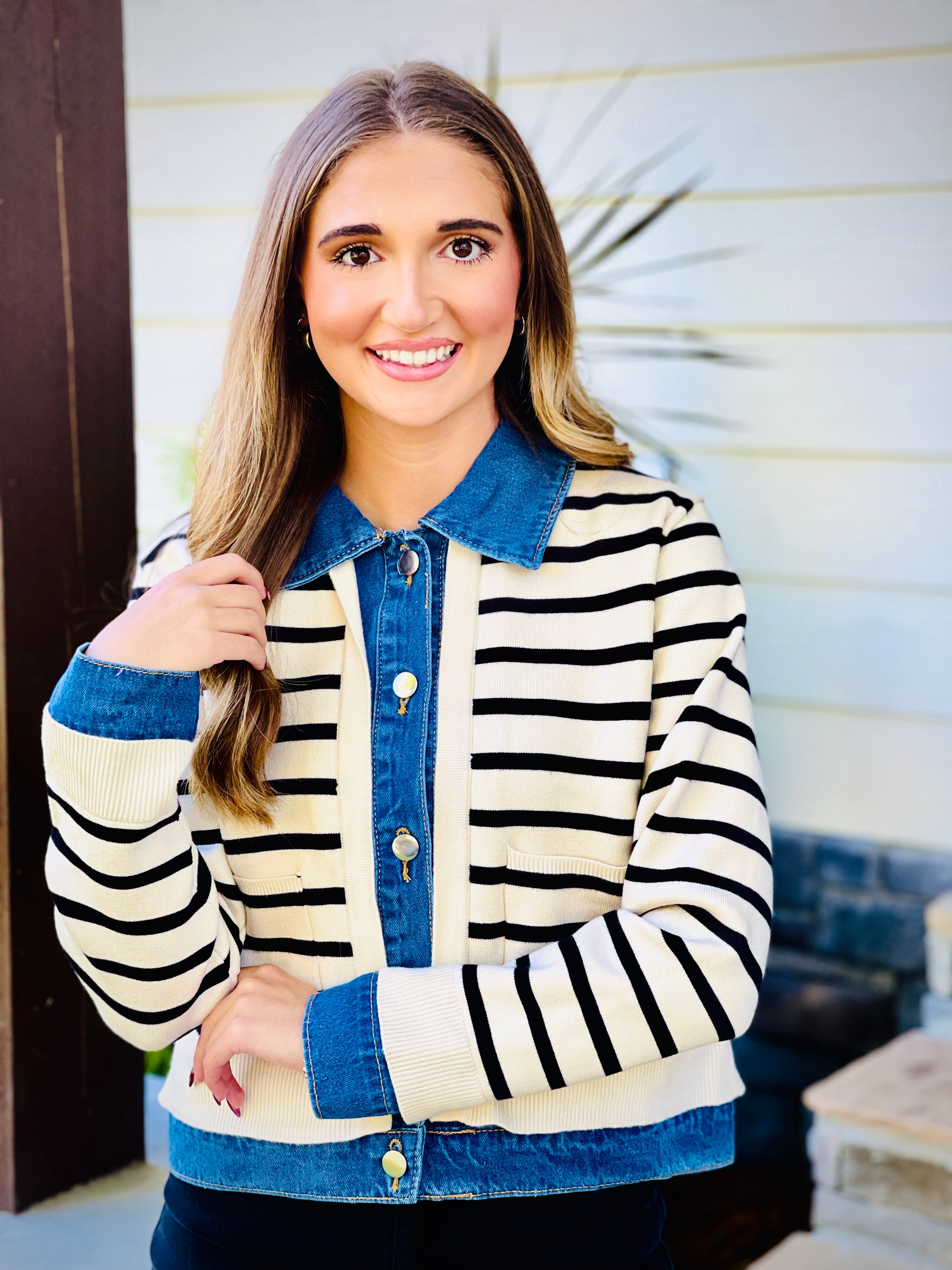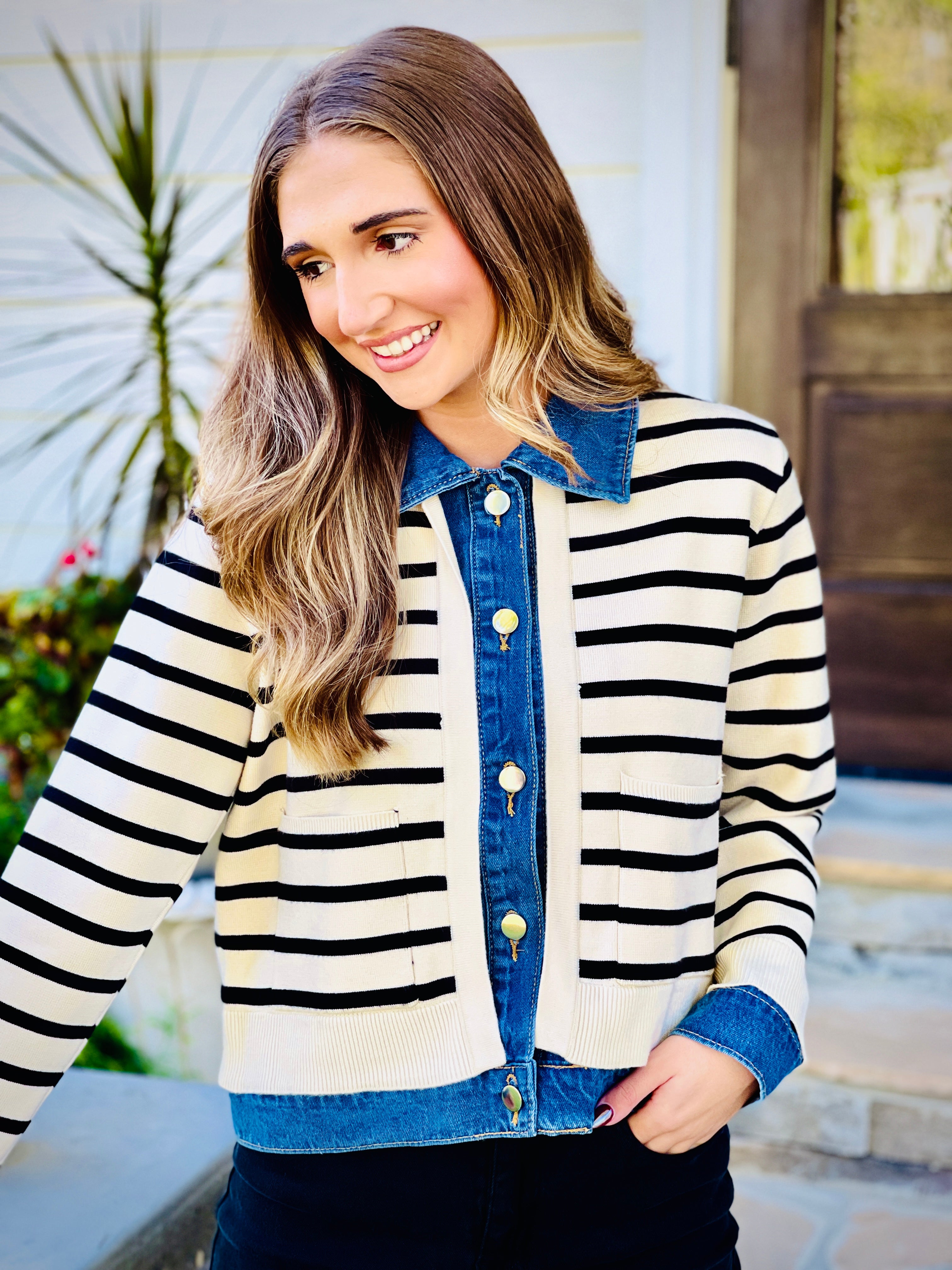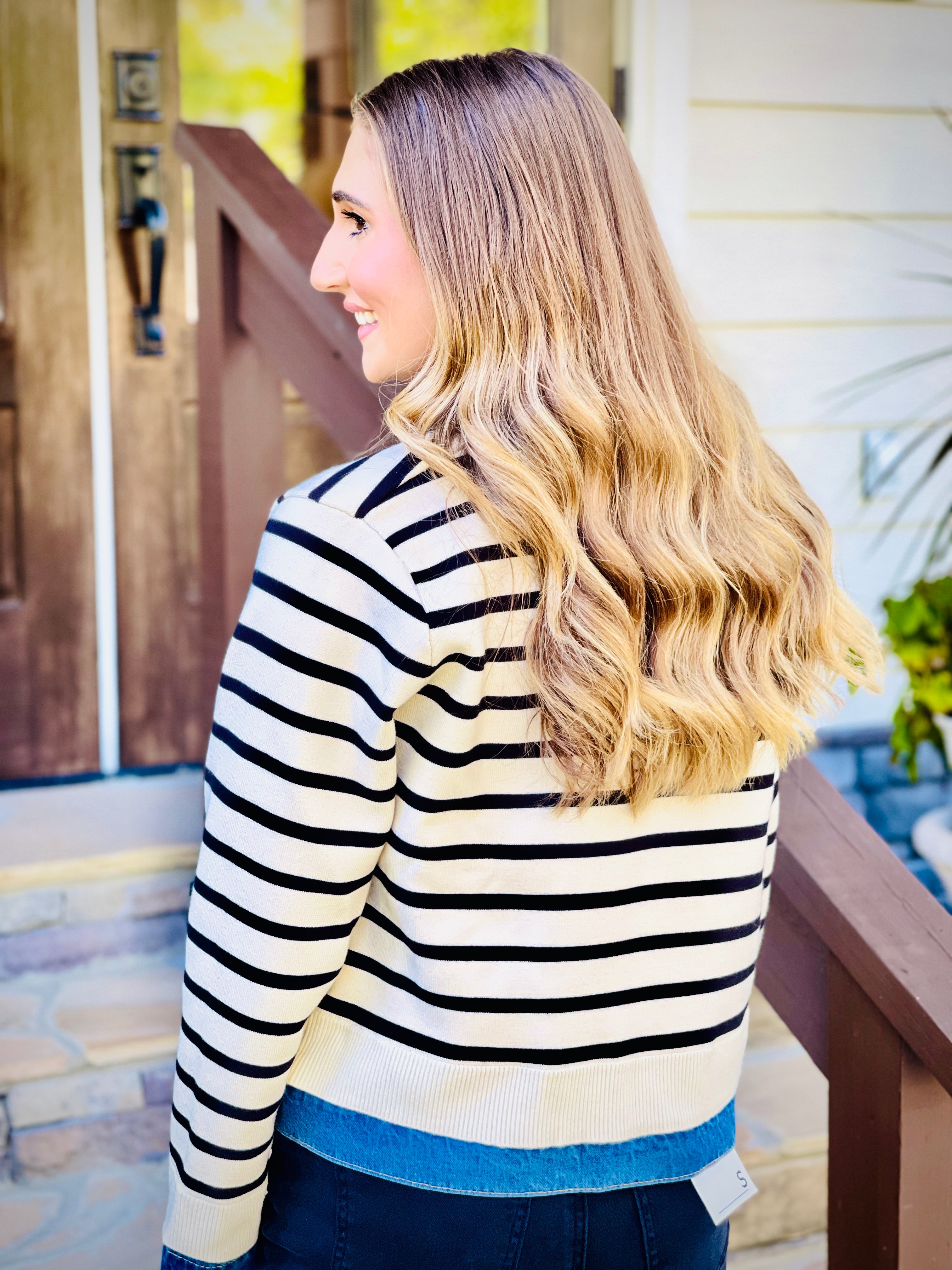 Introducing our Striped Knit Sweater Cardigan - a stylish and functional addition to your wardrobe. This long sleeved cardigan features a snap button closure on a denim lapel and collared neckline, along with patch front pockets. Made with non-sheer, heavyweight knit, it is perfect for cooler days. Stay cozy and chic with our versatile sweater cardigan.