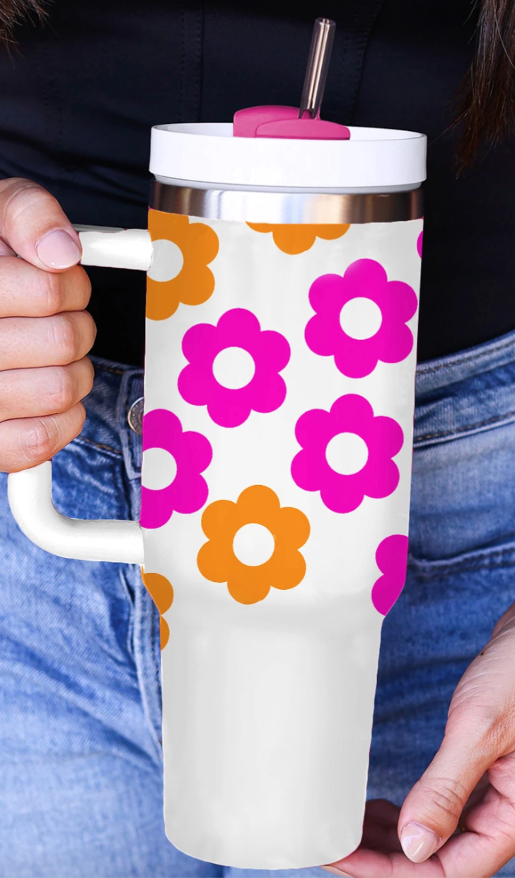 Add elegance, femininity, and versatility to your beverages with our flower print tumbler. Made of stainless steel, it keeps your drinks hot or cold longer. The white color and handle provide a clean look and easy carrying. Perfect for both hot and cold drinks.