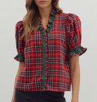 This lightweight woven top combines classic plaid with trendy short puff sleeves and delicate contrast ruffle trim, offering an expert mix of structure and softness. Featuring a snap button closure at the bust, it provides easy wear while maintaining a polished silhouette. The unlined design ensures comfort without bulk, and its non-sheer fabric guarantees reliable coverage. Perfect for elevating casual looks with subtle, refined details.