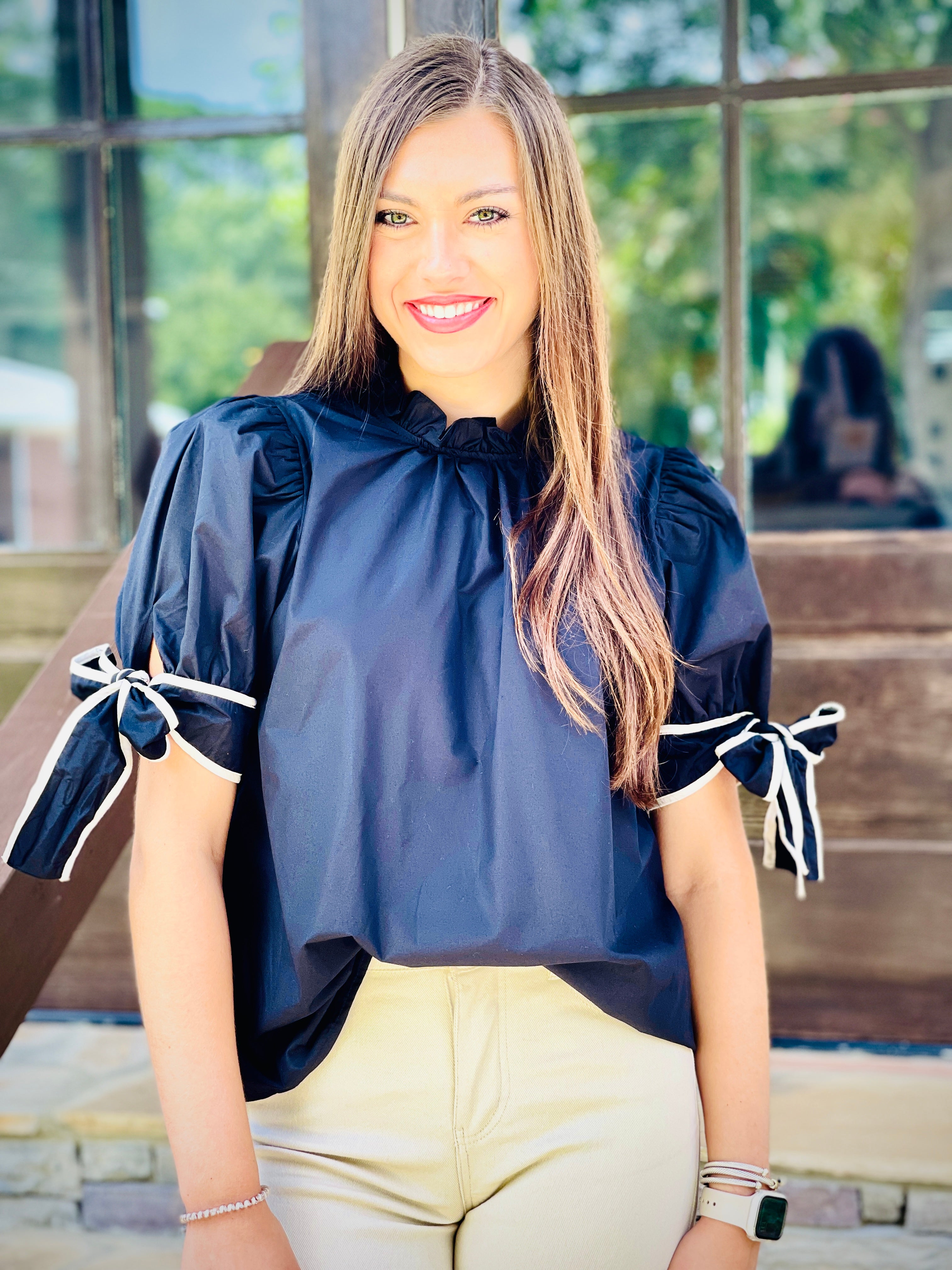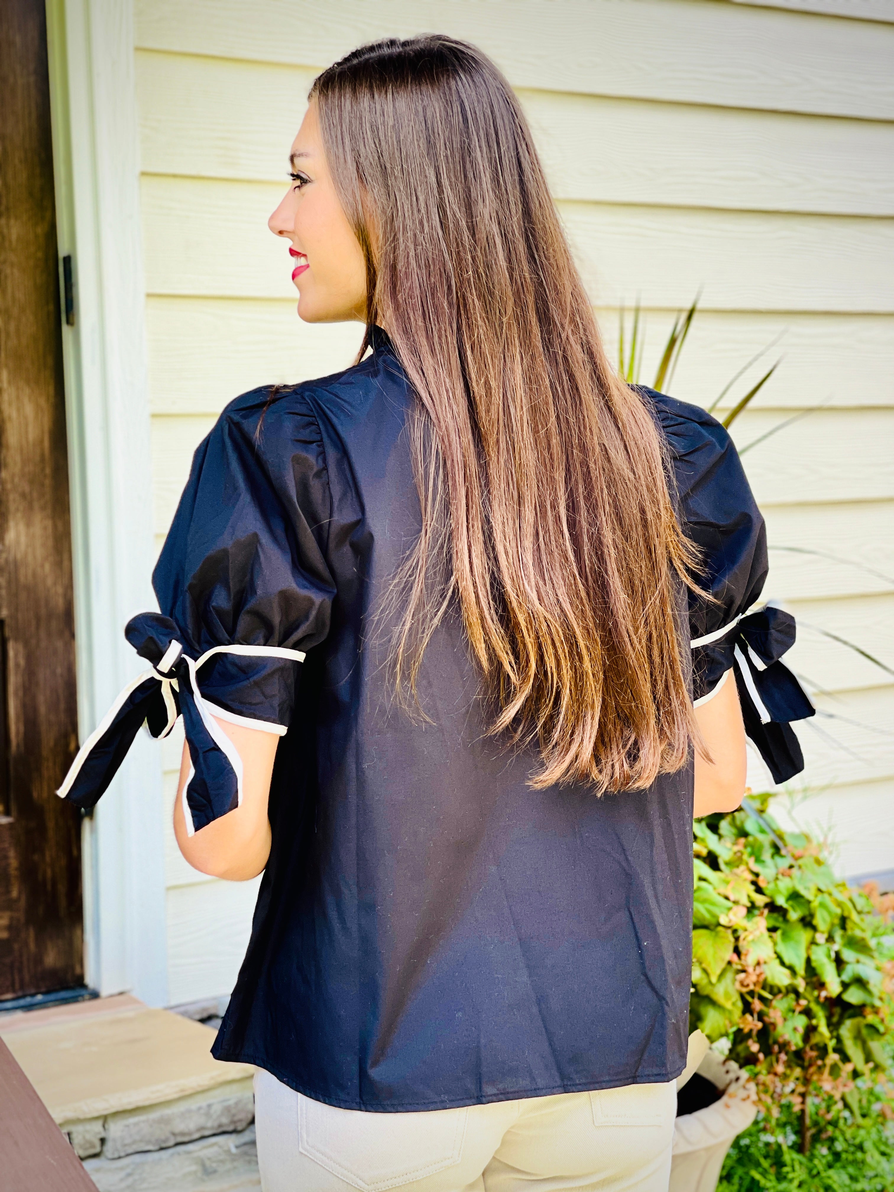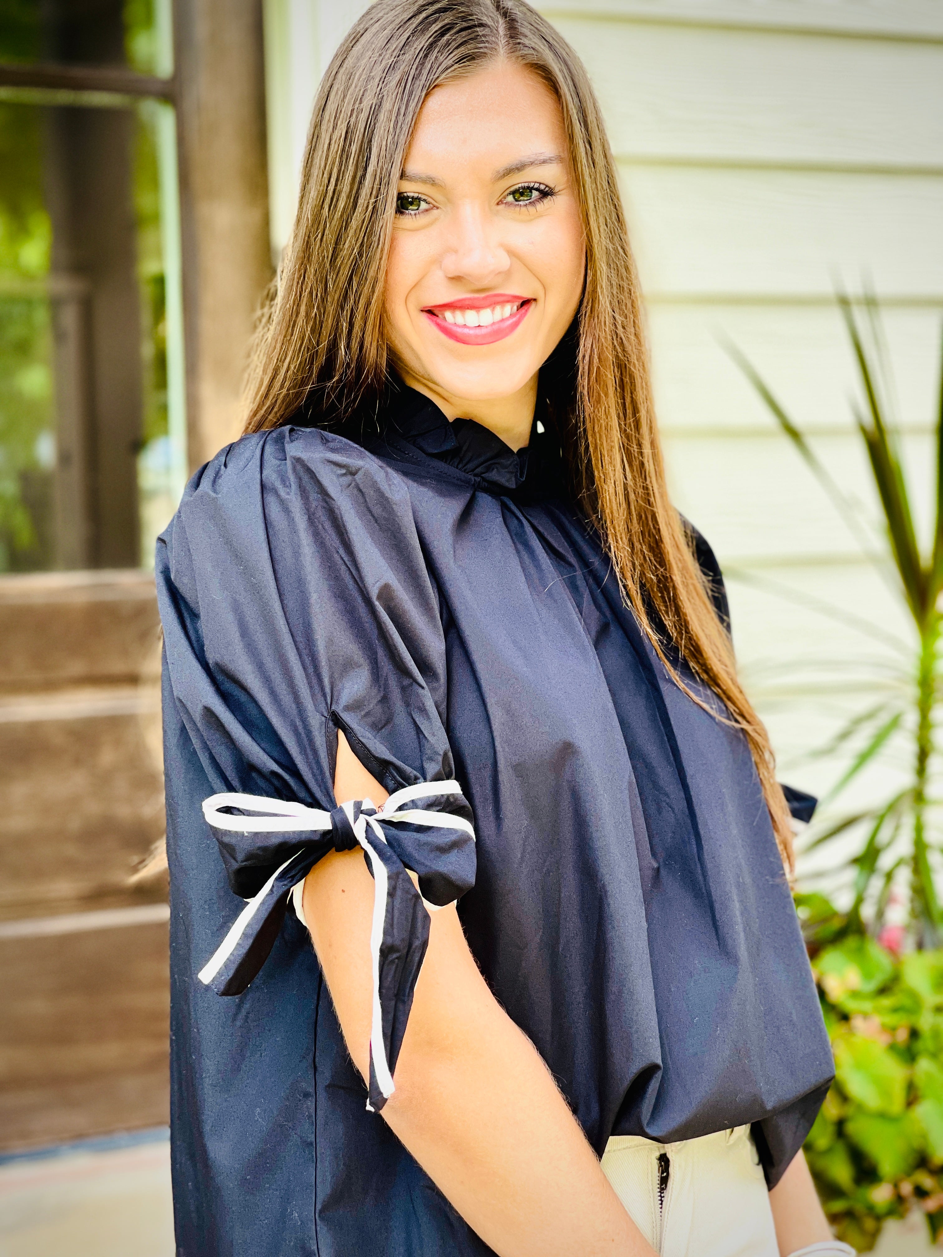 This solid mock neck short sleeve top is perfect for those looking to add a touch of elegance to their wardrobe. The ruffled neckline and self-tie bow detail at the cuff add a feminine touch, while the button closure at the back provides a secure fit. Made of a lightweight, non-sheer, woven material, this top is both stylish and comfortable.