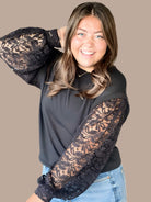This knit top combines relaxed comfort with refined elegance through its soft sweatshirt fabric and sheer floral lace sleeves. The delicate lace brings subtle femininity and texture, while the relaxed fit ensures ease of wear. Ribbed trim along the neckline, cuffs, and hem provides a clean, tailored finish, making this piece a versatile staple for both casual and dressier occasions.