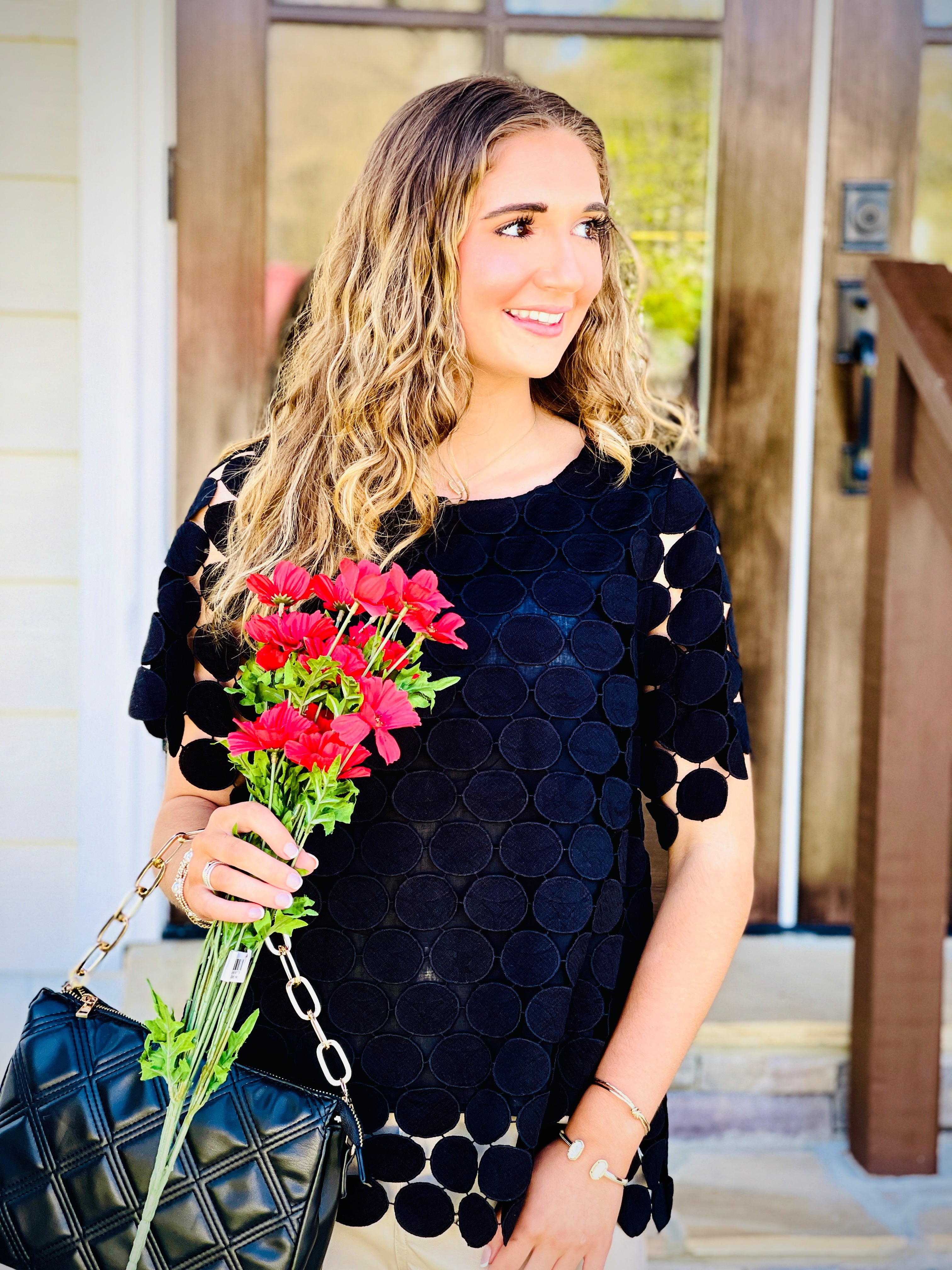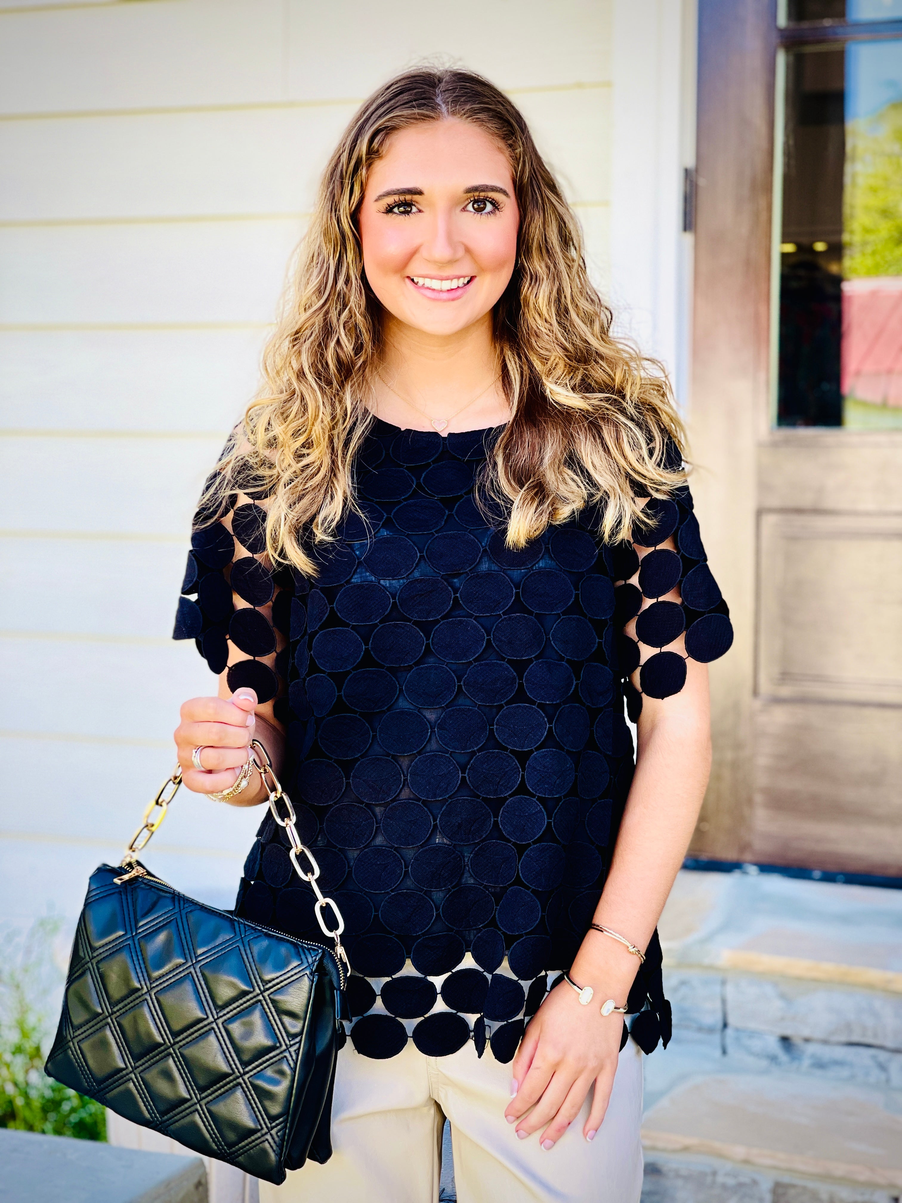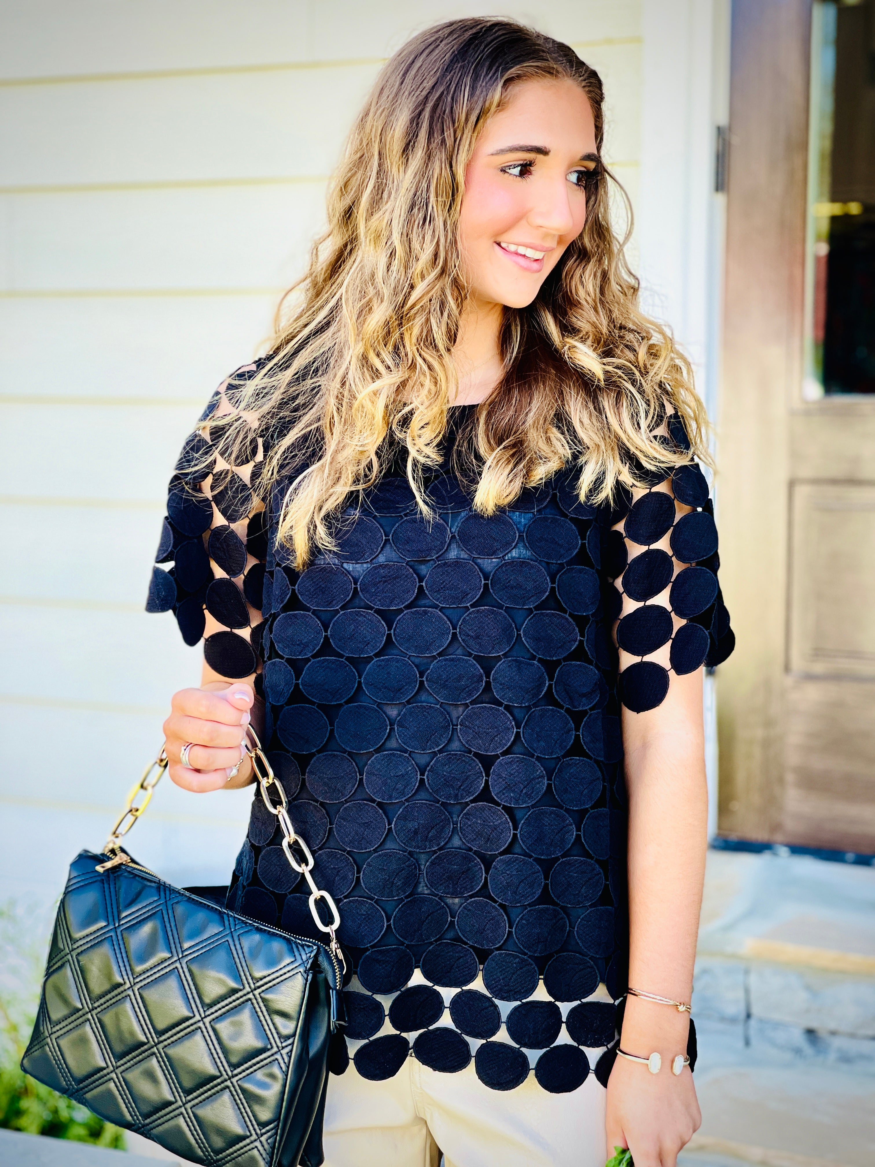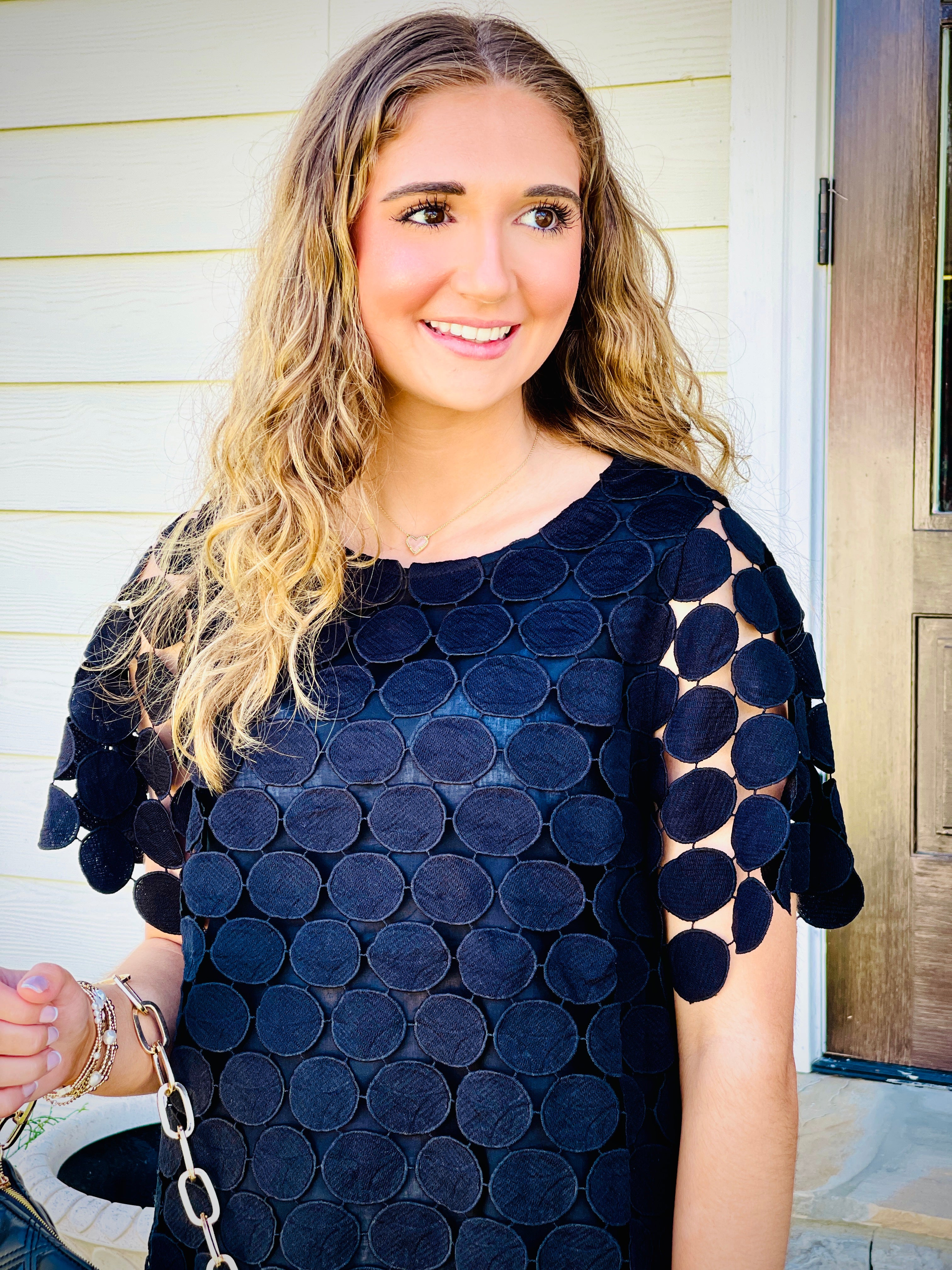 Introducing our Polka Dot Lace Shift Boxy Cut Short Sleeve Top. Made with a delicate lace fabric and featuring a back button keyhole, this top combines elegance and ease. The boxy cut ensures a comfortable fit, while the polka dot pattern adds a touch of playfulness. Perfect for any occasion!