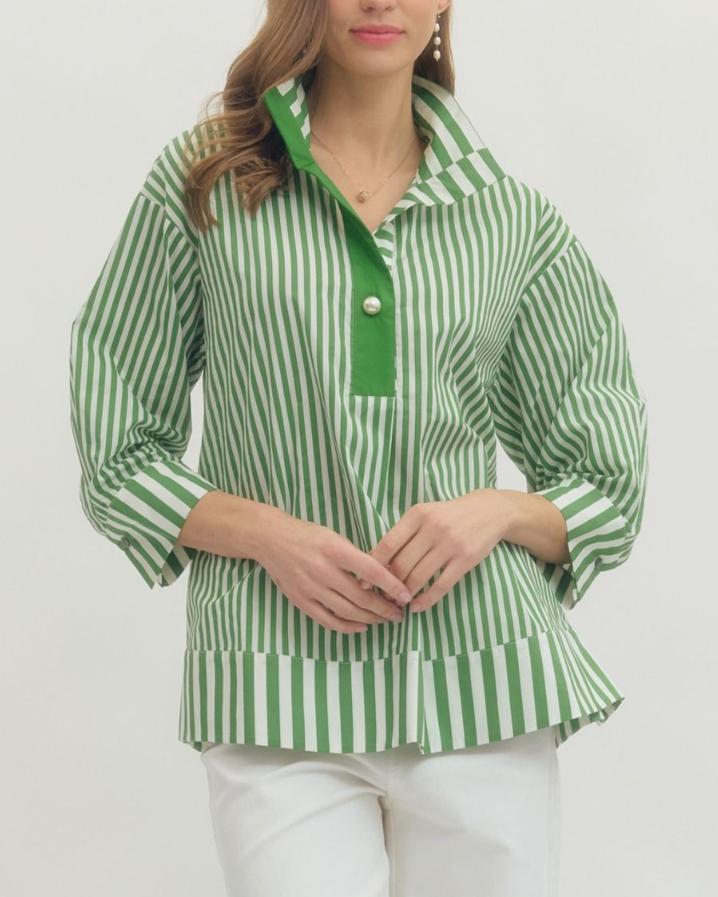 Elevate your wardrobe with this sophisticated stripe woven top, designed for effortless versatility. The classic wide collar and pearl button placket deliver preppy polish, while three-quarter sleeves offer a refined silhouette. Functional button cuffs provide adjustable comfort, and the lightweight, unlined construction ensures breathability throughout the day. Perfect for layering or wearing solo, this non-sheer piece transitions seamlessly from office to weekend occasions.