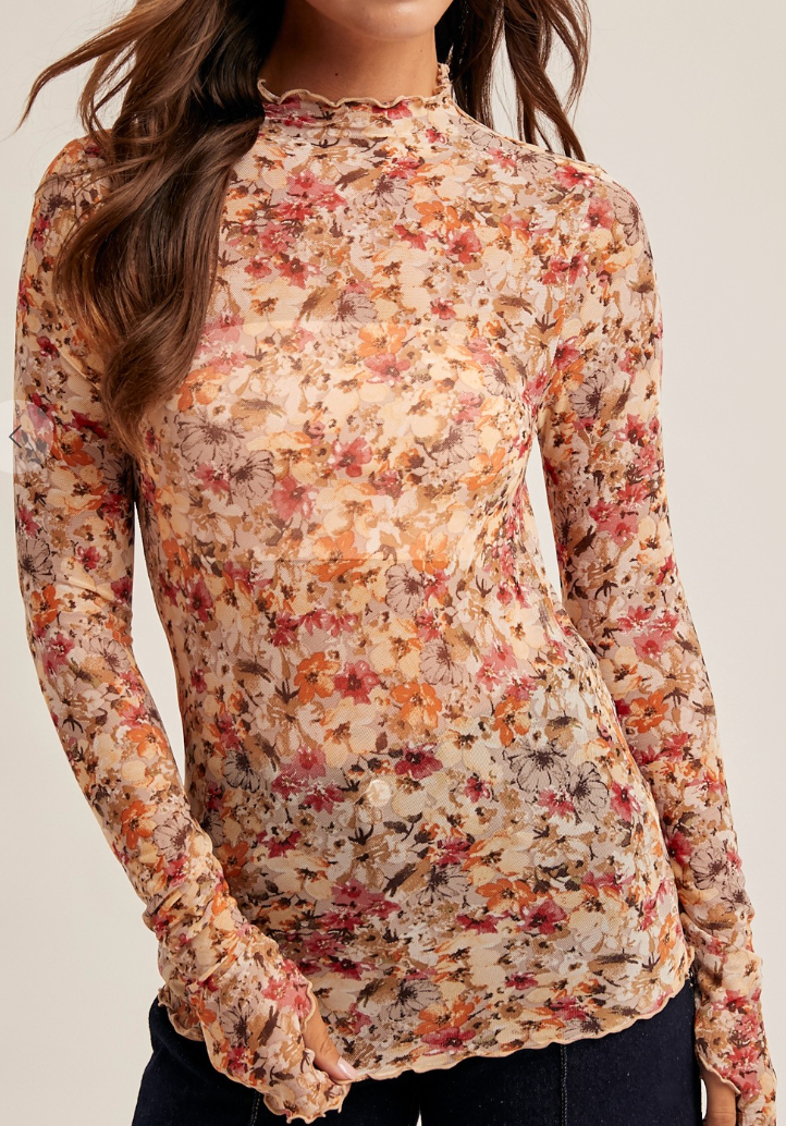 Sheer Floral Mesh Mock Neck Top