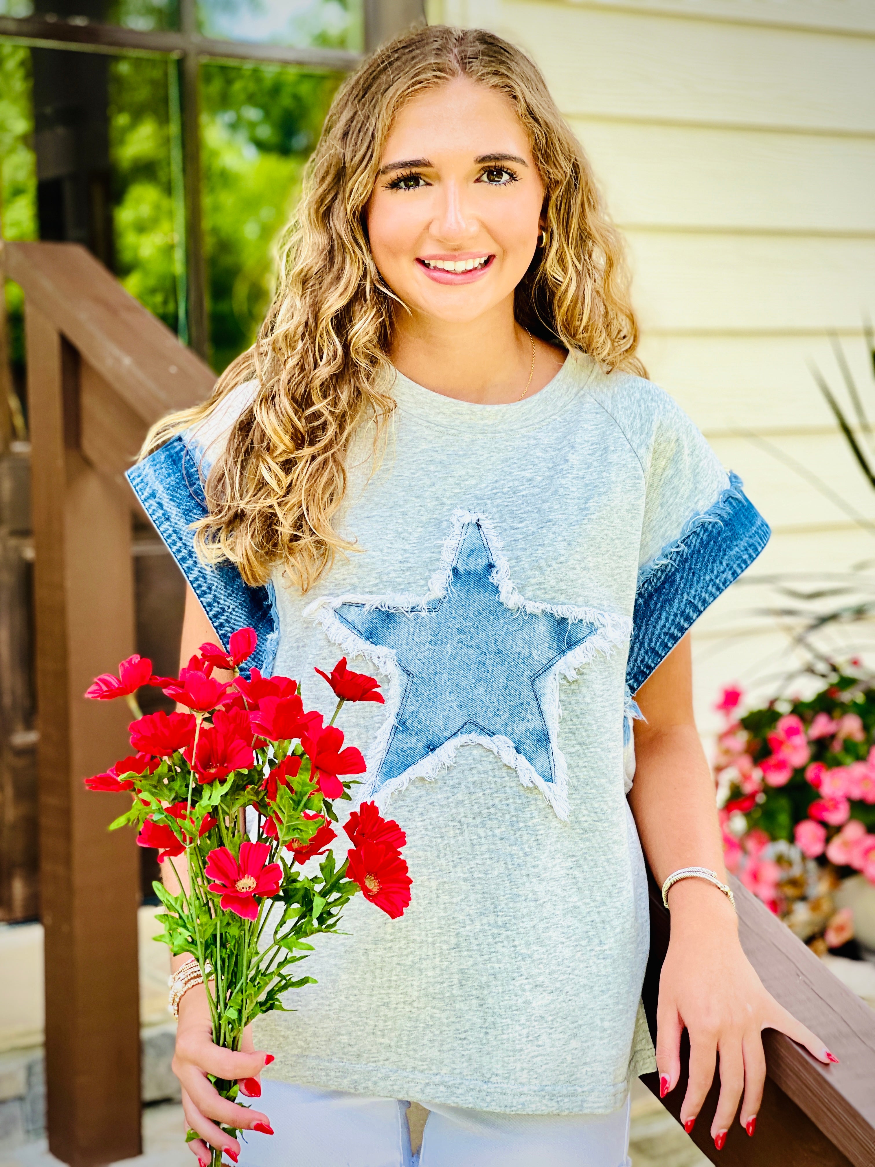 Show off your patriotic spirit with our Fourth of July theme combo top, featuring a stylish and versatile denim design. Perfect for any summer celebration, this top is sure to turn heads and make a statement. Made with high-quality materials, you'll love the comfort and durability of this top. Order yours today and stand out from the crowd!