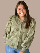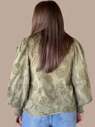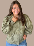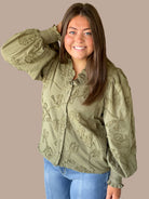 This lightweight woven top showcases delicate floral applique embroidery, enhancing its elegant appeal. It features long puff sleeves with smocked ruffle cuffs for a refined finish, alongside a ruffled V-neck and a button-up front that offer both style and ease. Fully lined and non-sheer, it provides comfortable coverage without compromising on breathability or sophistication. Perfect for adding a polished yet feminine touch to your wardrobe.
