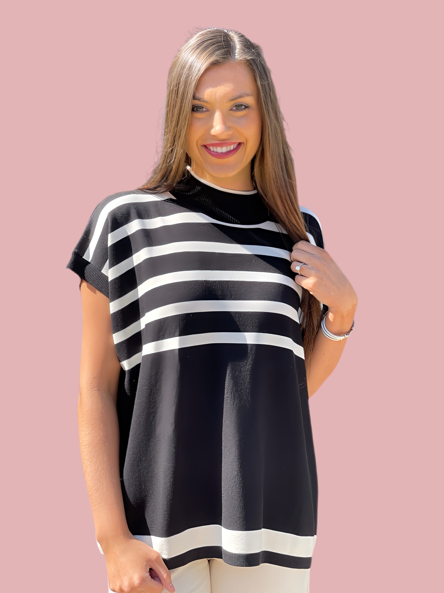 This oversized, striped sweater is the perfect addition to your wardrobe. With a sophisticated mock neck and midweight knit fabric, it provides both style and warmth. The non-sheer and unlined design adds to its versatility. Stay fashionable and cozy with this must-have top.