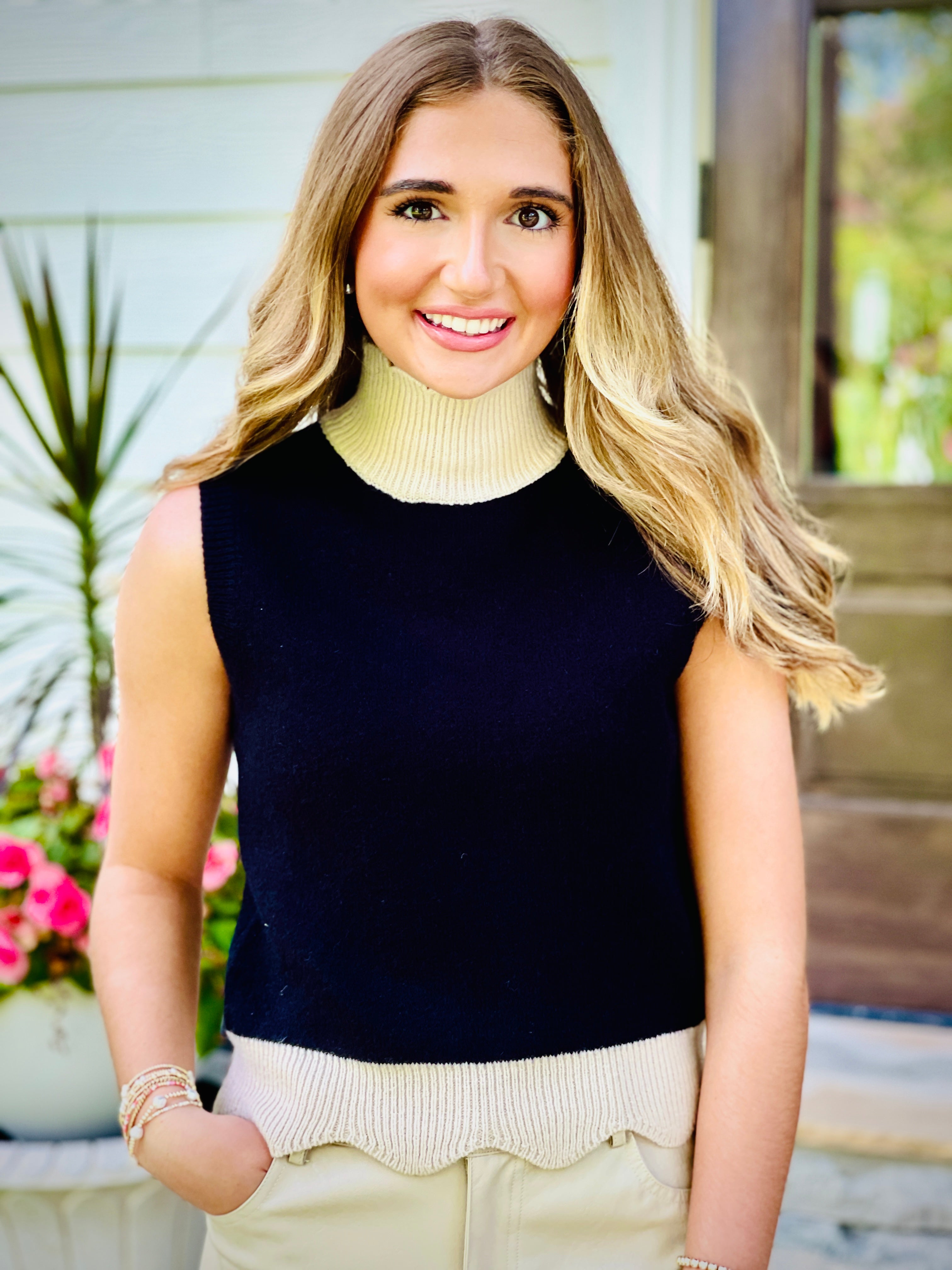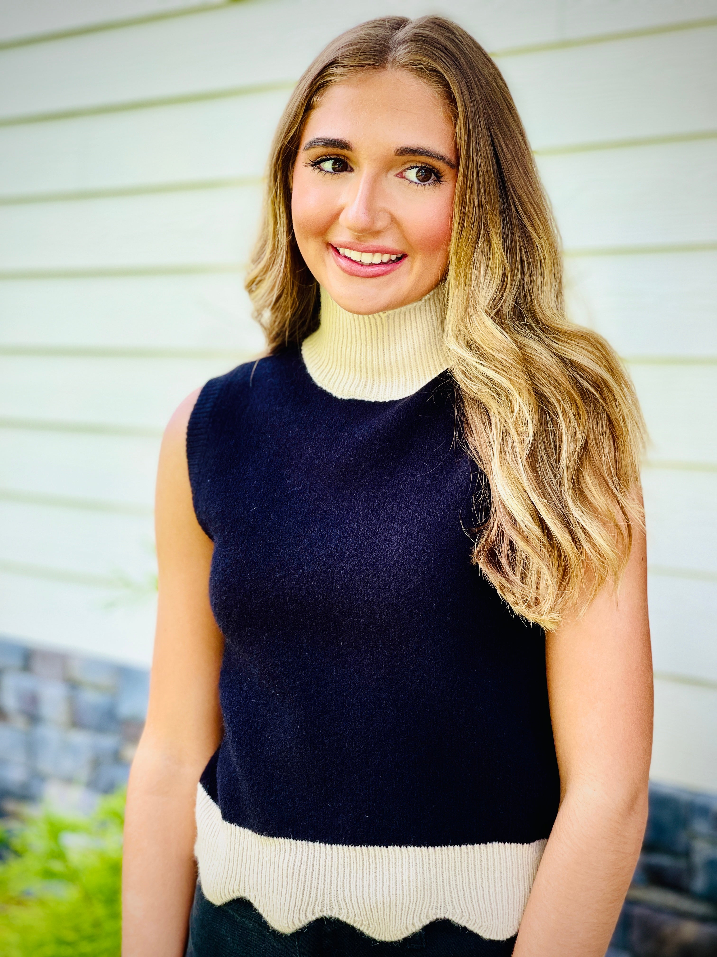 Upgrade your wardrobe with our solid sleeveless turtleneck cropped sweater top! The scalloped trim at the neckline and hem adds a touch of elegance to this knit top, making it perfect for any occasion. Unlined, non-sheer, and lightweight for ultimate comfort. A must-have for any fashion-forward individual.
