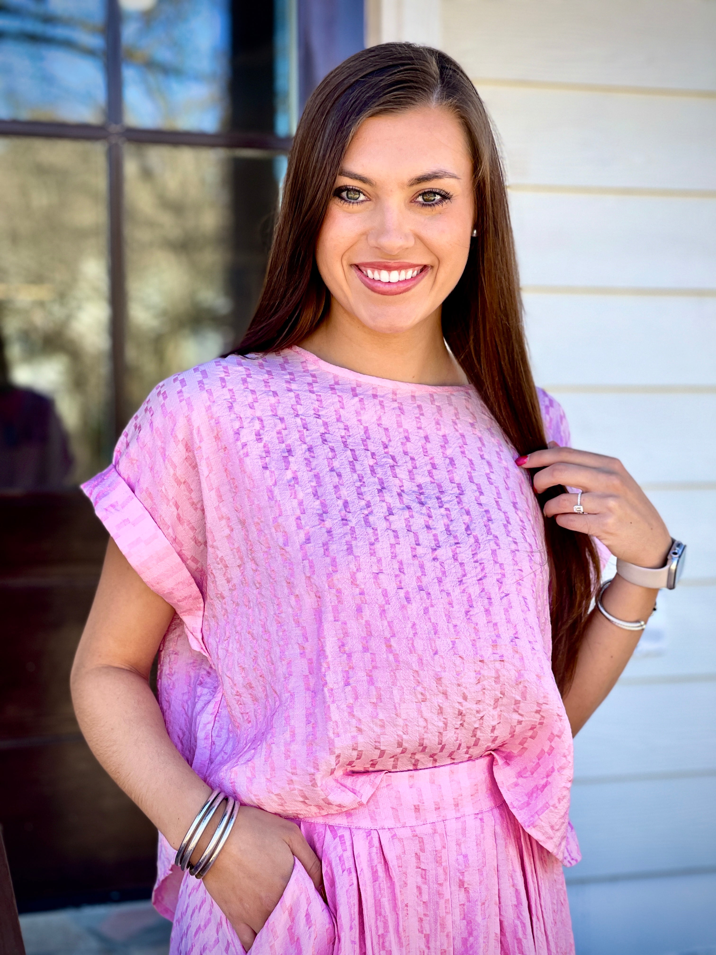 Expertly crafted with a textured round neck and pleat detail at the back, this lightweight short sleeve top adds dimension and style to any outfit. The hi-low hem and semi-sheer fabric give it a unique touch, making it the perfect addition to your wardrobe. Unlined and woven for comfort.
