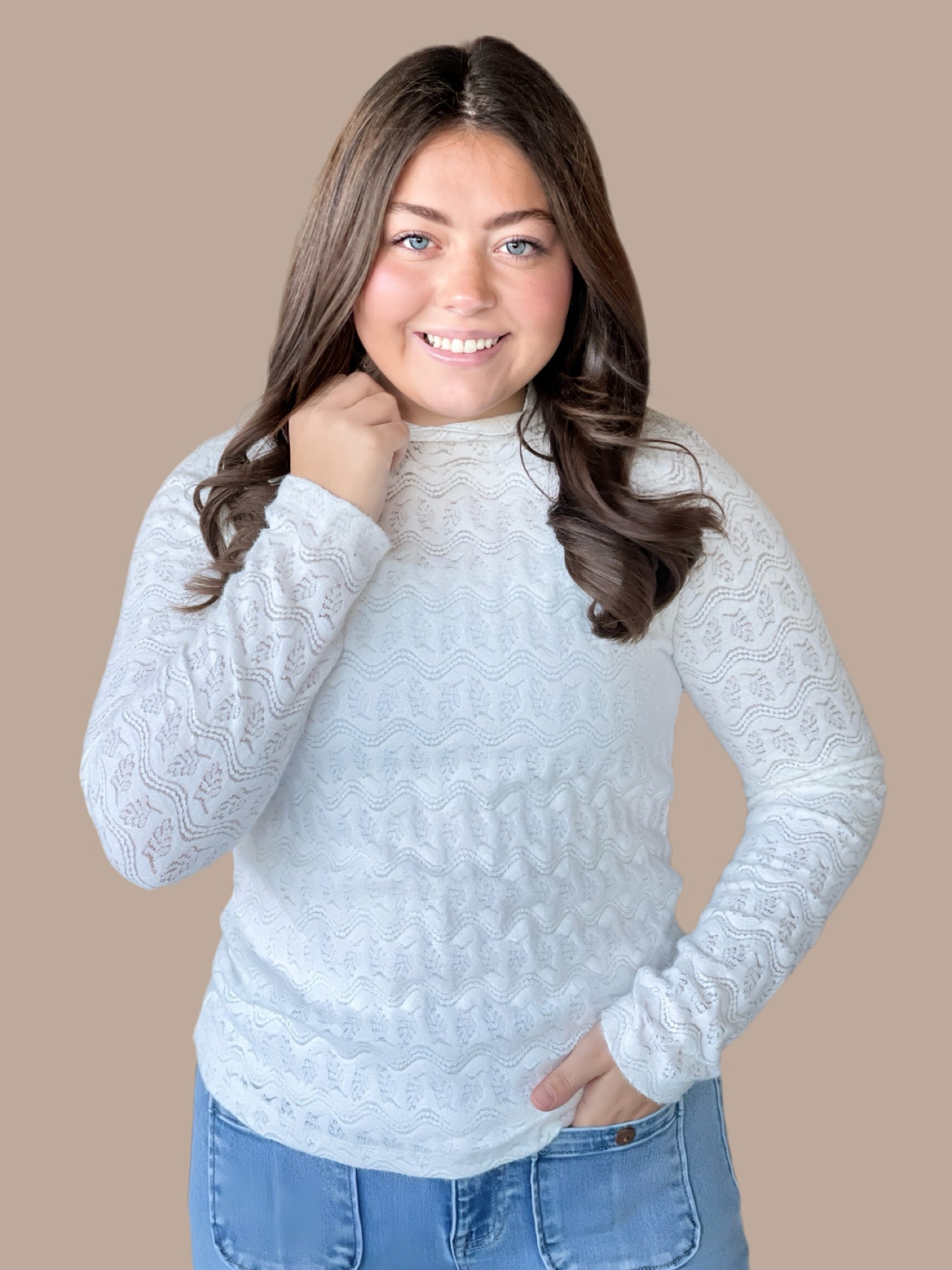 Elevate your wardrobe with this sophisticated white brushed lace long sleeve top, featuring a refined mock neck silhouette. The delicate lace construction offers an elegant, textured aesthetic while the brushed fabric provides a soft, comfortable feel against the skin. Long sleeves deliver versatile coverage suitable for layering or standalone wear across seasons. The mock neck adds a polished, contemporary touch that works seamlessly with both casual and professional styling. Perfect for those seeking a piece that balances timeless elegance with modern design sensibilities.