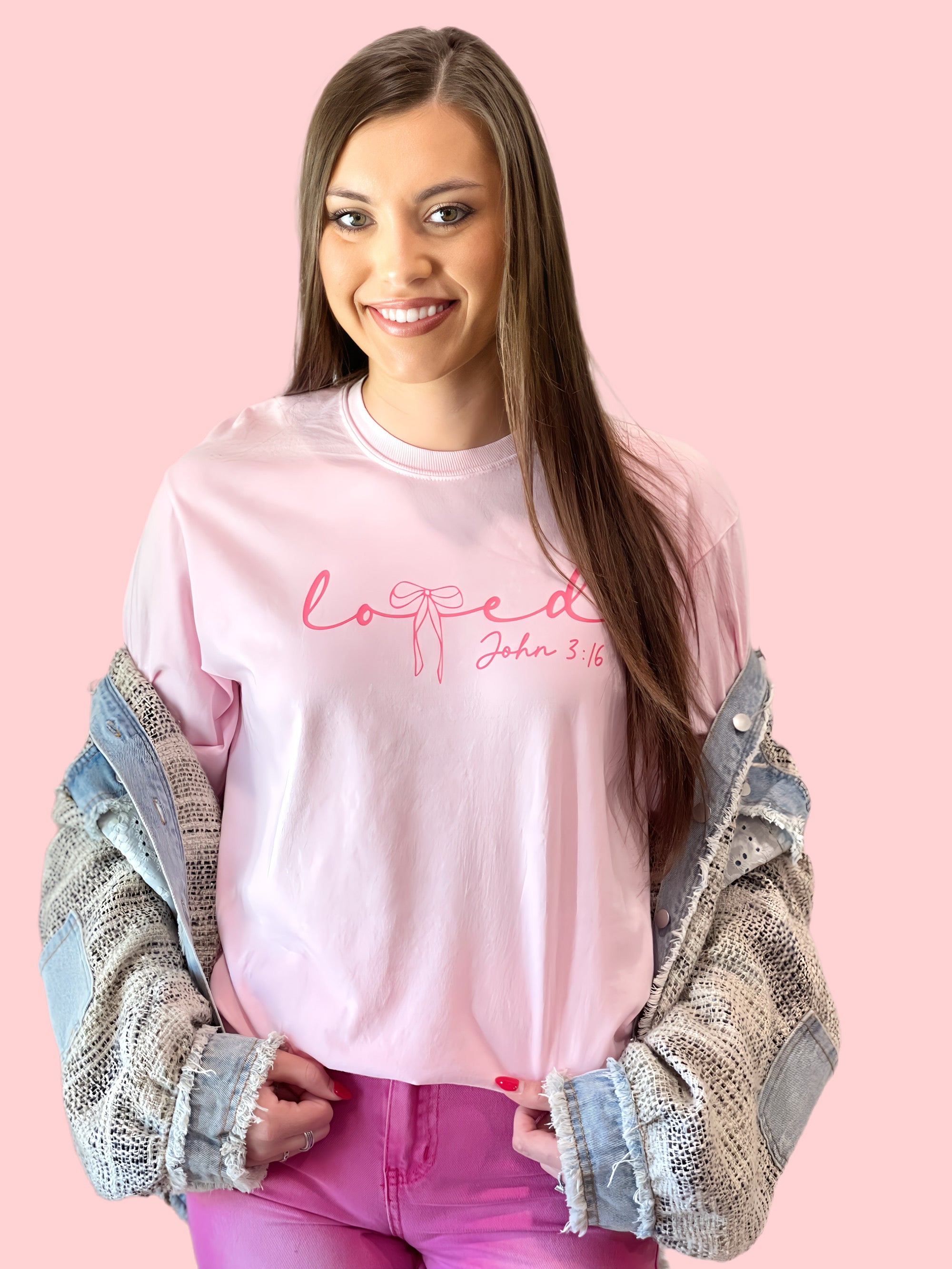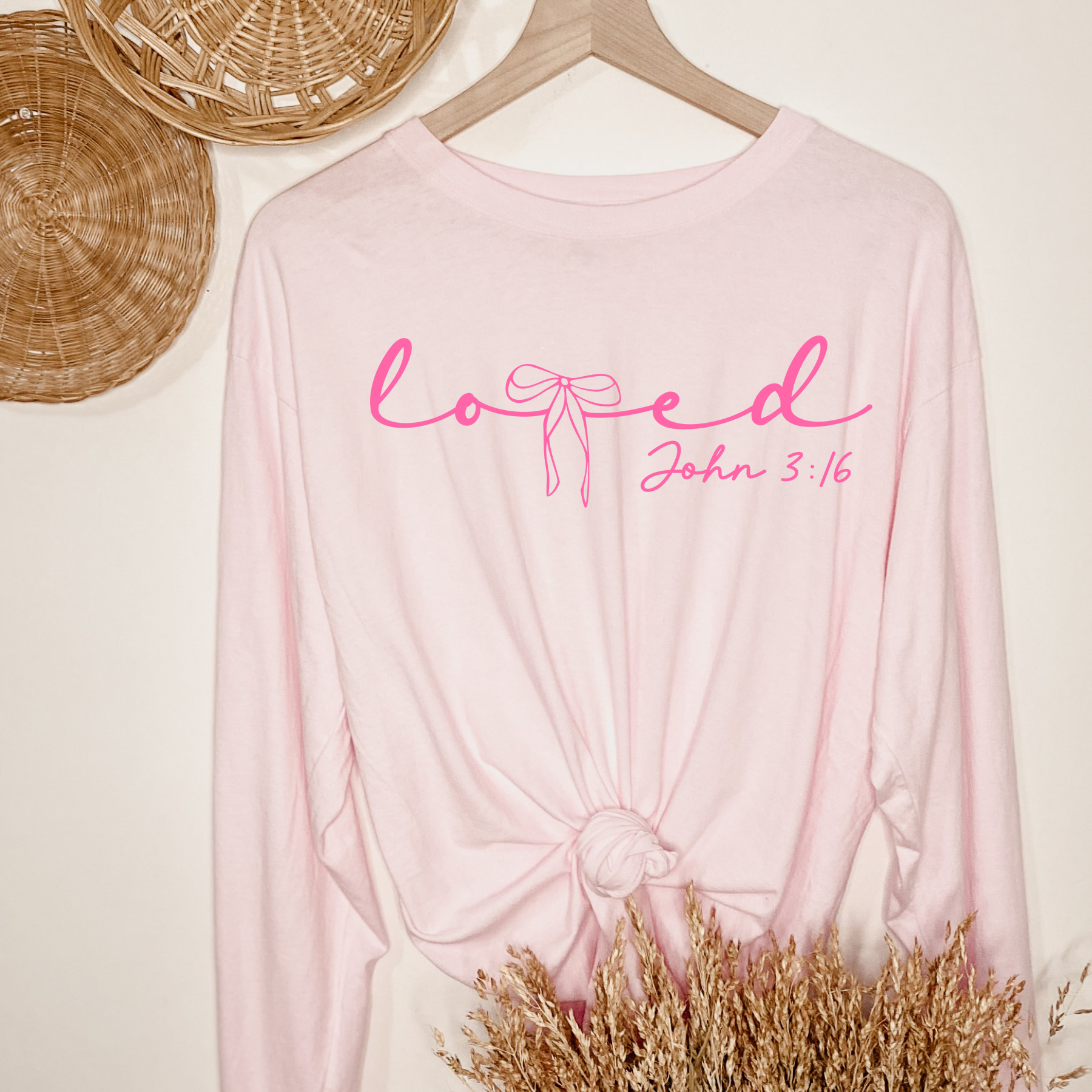 This Coquette Loved John 3:16 Long Sleeve Tee is perfect for those seeking comfort and inspiration. Made with high-quality materials, this tee features the beloved Bible verse, reminding you of your faith and spreading a positive message wherever you go. Stay comfortable and stylish with this timeless tee.