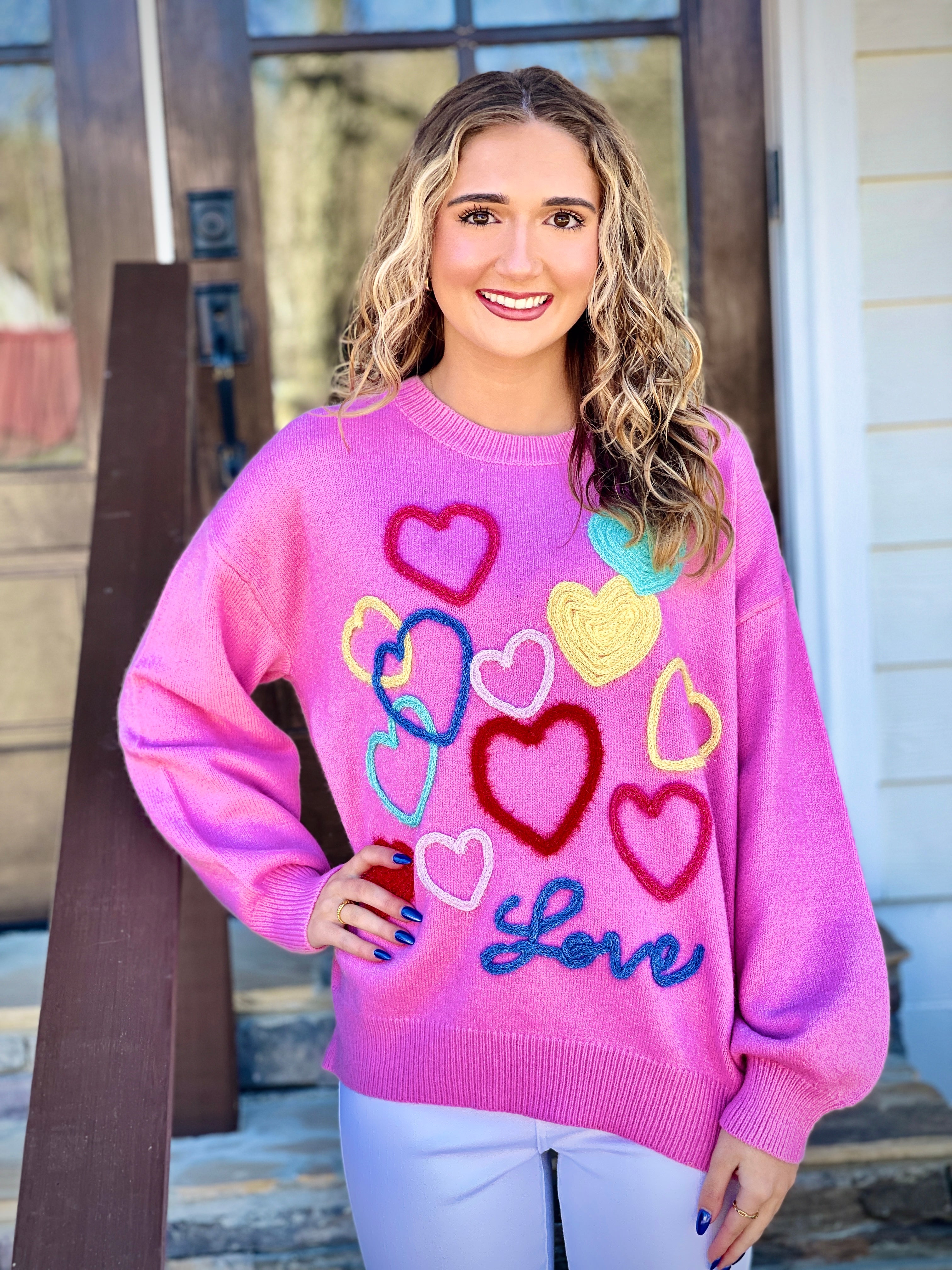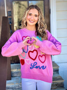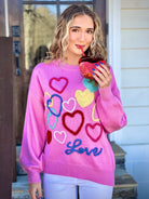 Stay cozy and stylish with our round neck long sleeve knit sweater. Featuring letter trimming and heart detail, this sweater adds a playful touch to any outfit. The rib detail at the neckline and hem provide a snug fit for added comfort. Made of lightweight, non-sheer knit material, it's perfect for any occasion.