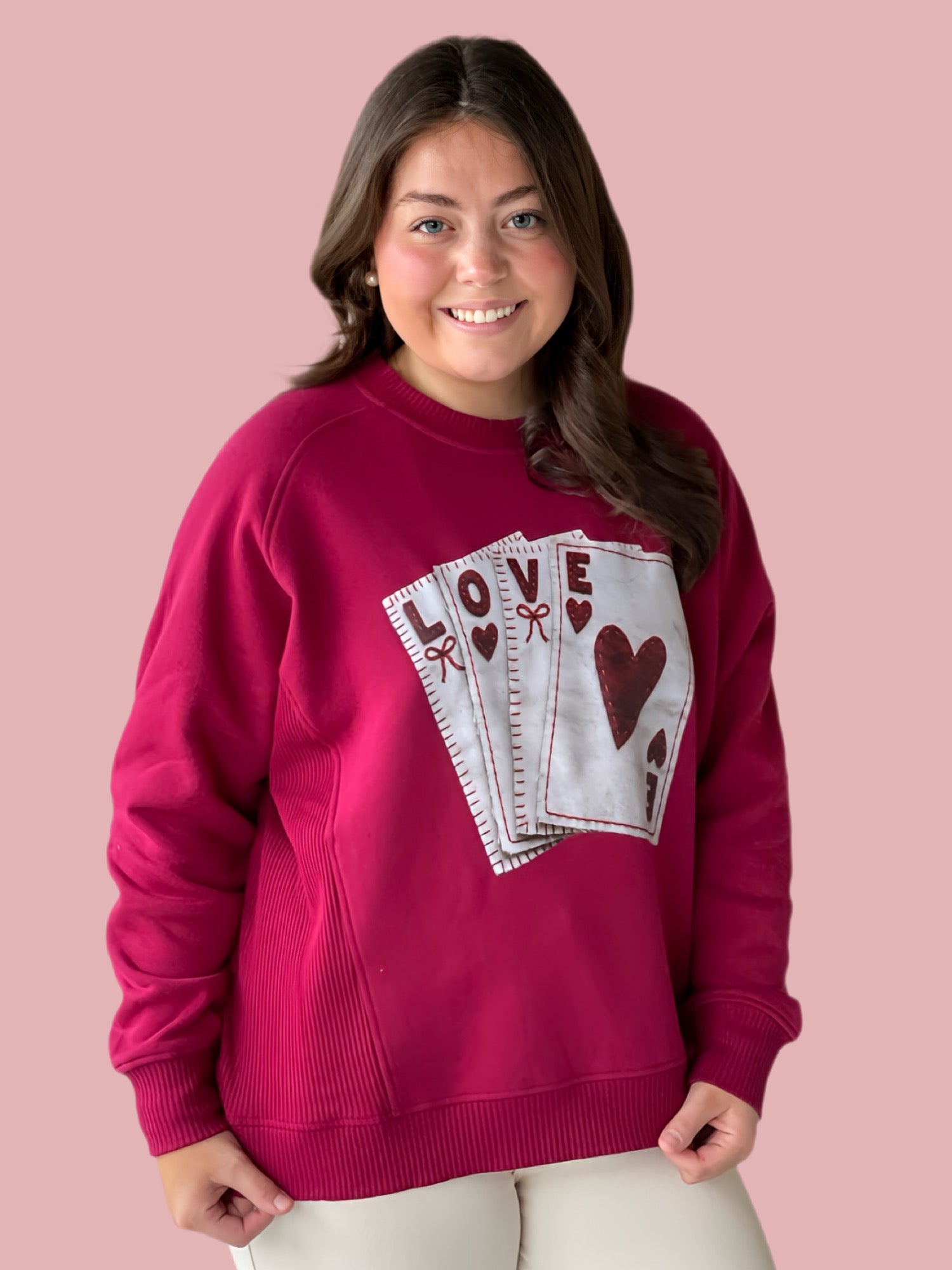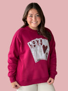 The Play Your Cards Right Sweatshirt, made from a blend of 60% cotton and 40% polyester, offers a comfortable fit that maintains its shape. Designed to fit true to size, this sweatshirt ensures ease of movement and durability, making it a practical choice for everyday wear.